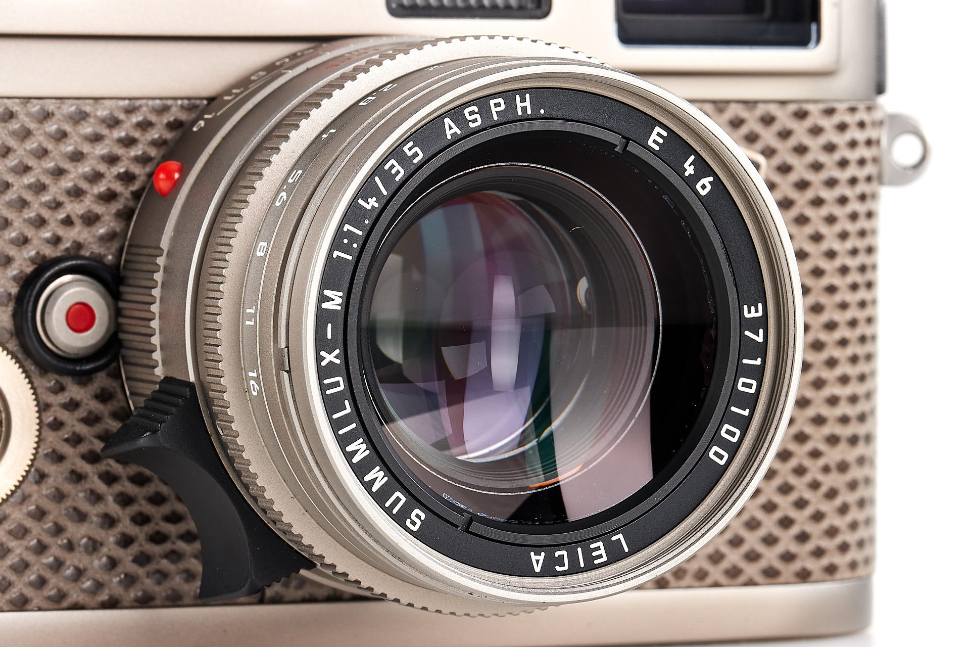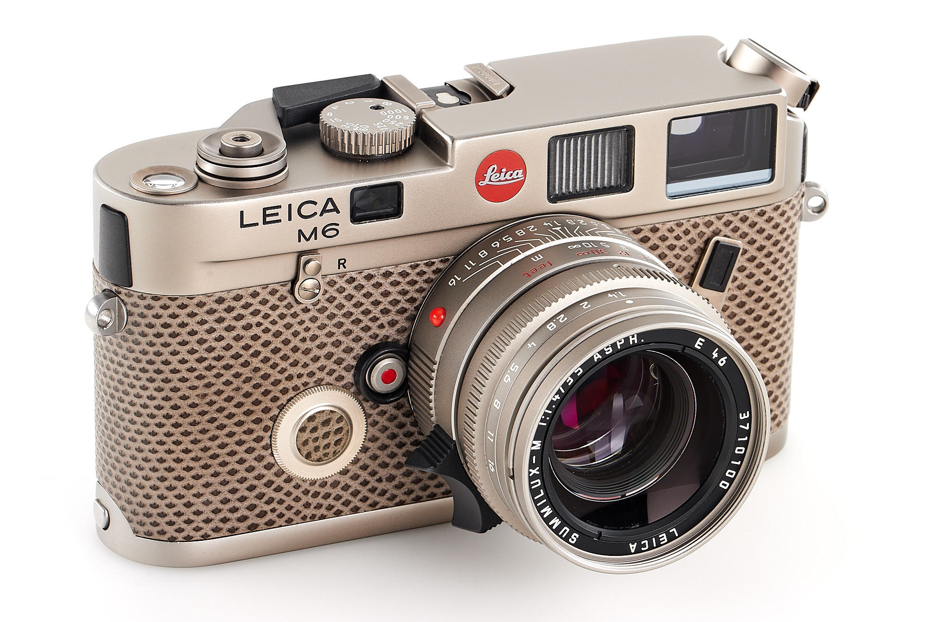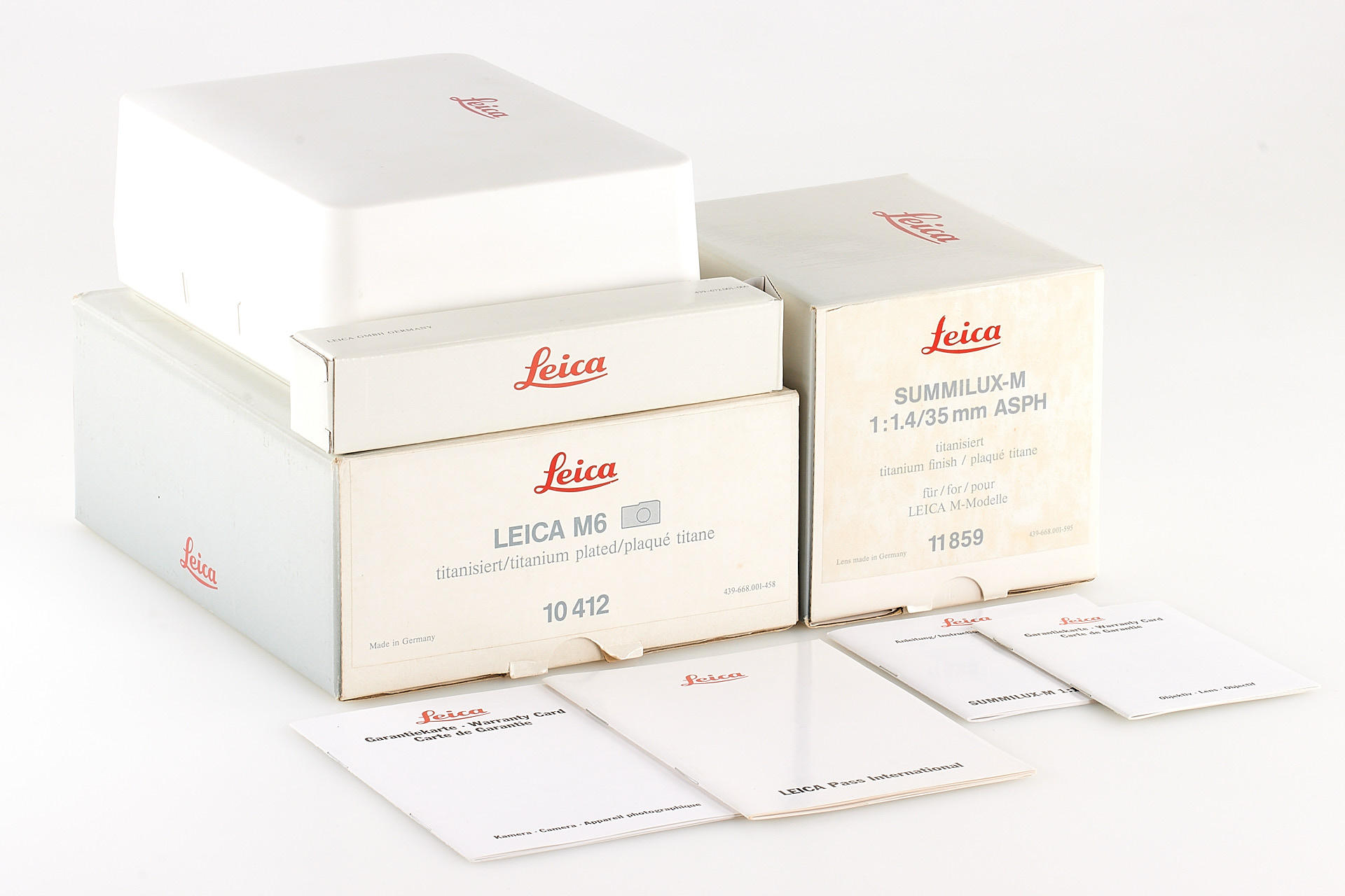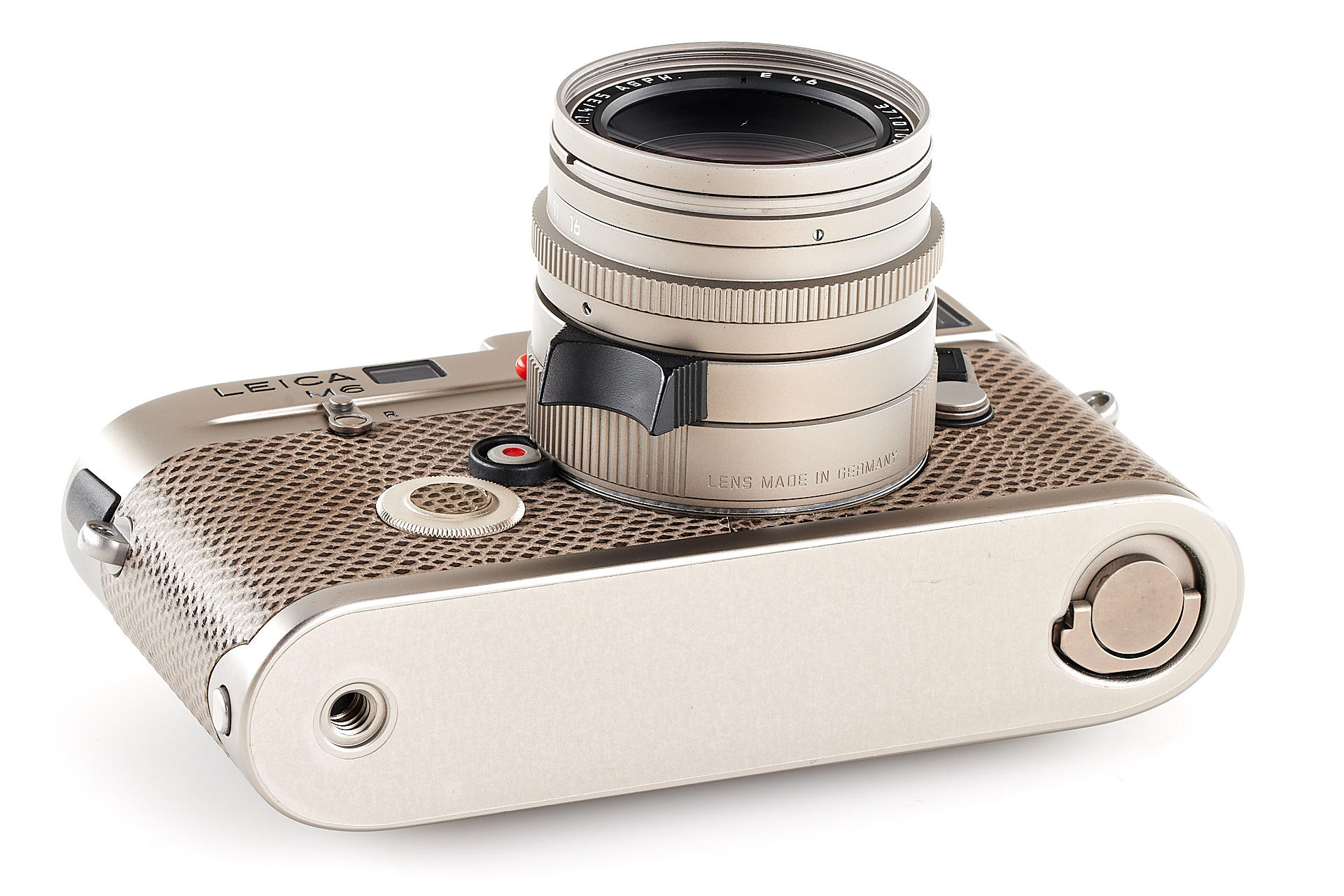 The Leica M6 titan was officially announced at the Photokina 1992. The offered presentation camera bears the special serial number 1900001, it is in beautiful, mint and unused condition, the body is covered in special leather in a reptile pattern, comes with complete papers and a maker's box with a matching serial number. Included with the camera is a Summilux-M 1.4/35mm ASPH. in titanium finish with a special serial number 3710100 (cond. A-, with 12588 hood, caps, box, keeper and papers), and an Elmarit-M 2.8/90mm in titanium finish, with a special number 3807300 (cond. A/B)
