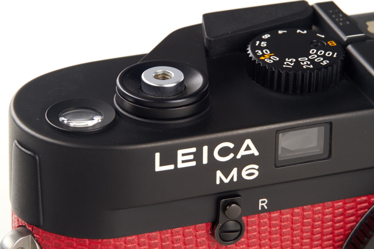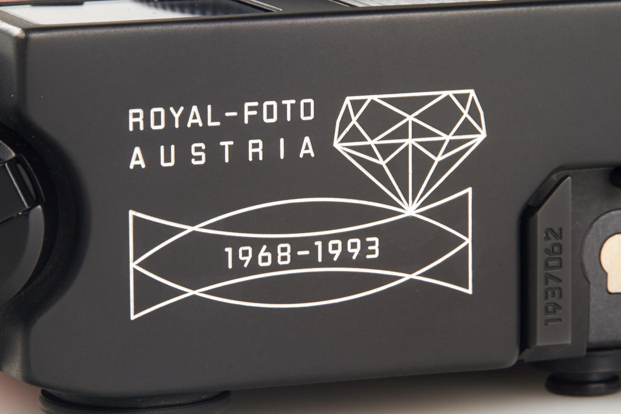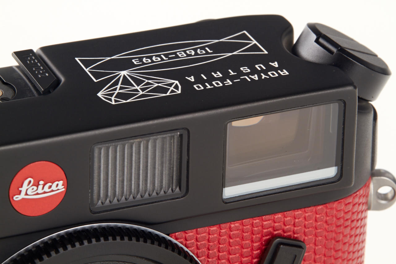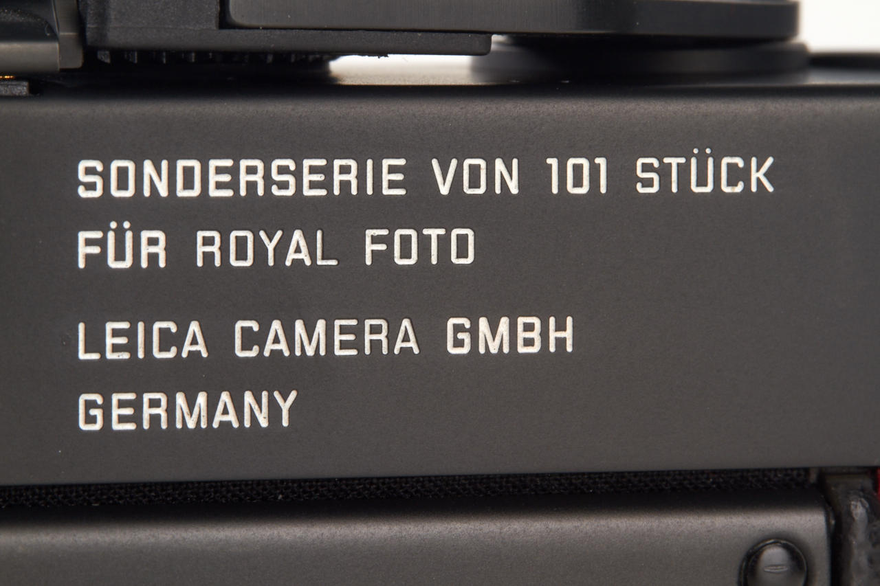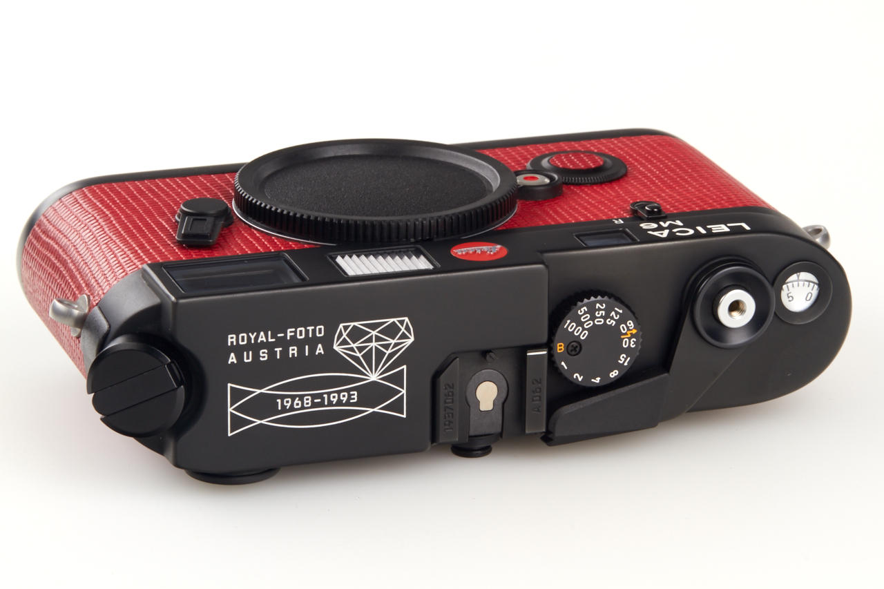 from a limited edition of 101 black and chrome cameras (edition number A 062) made for Royal-Foto Austria, black anodized camera with red leather covering , with cap, strap, M6 maker's box (serial no.not matching)