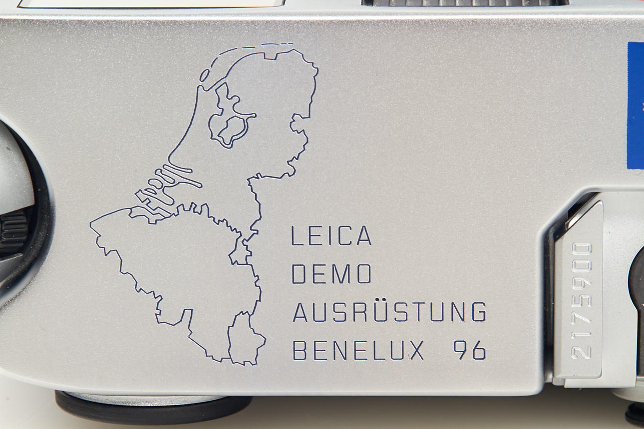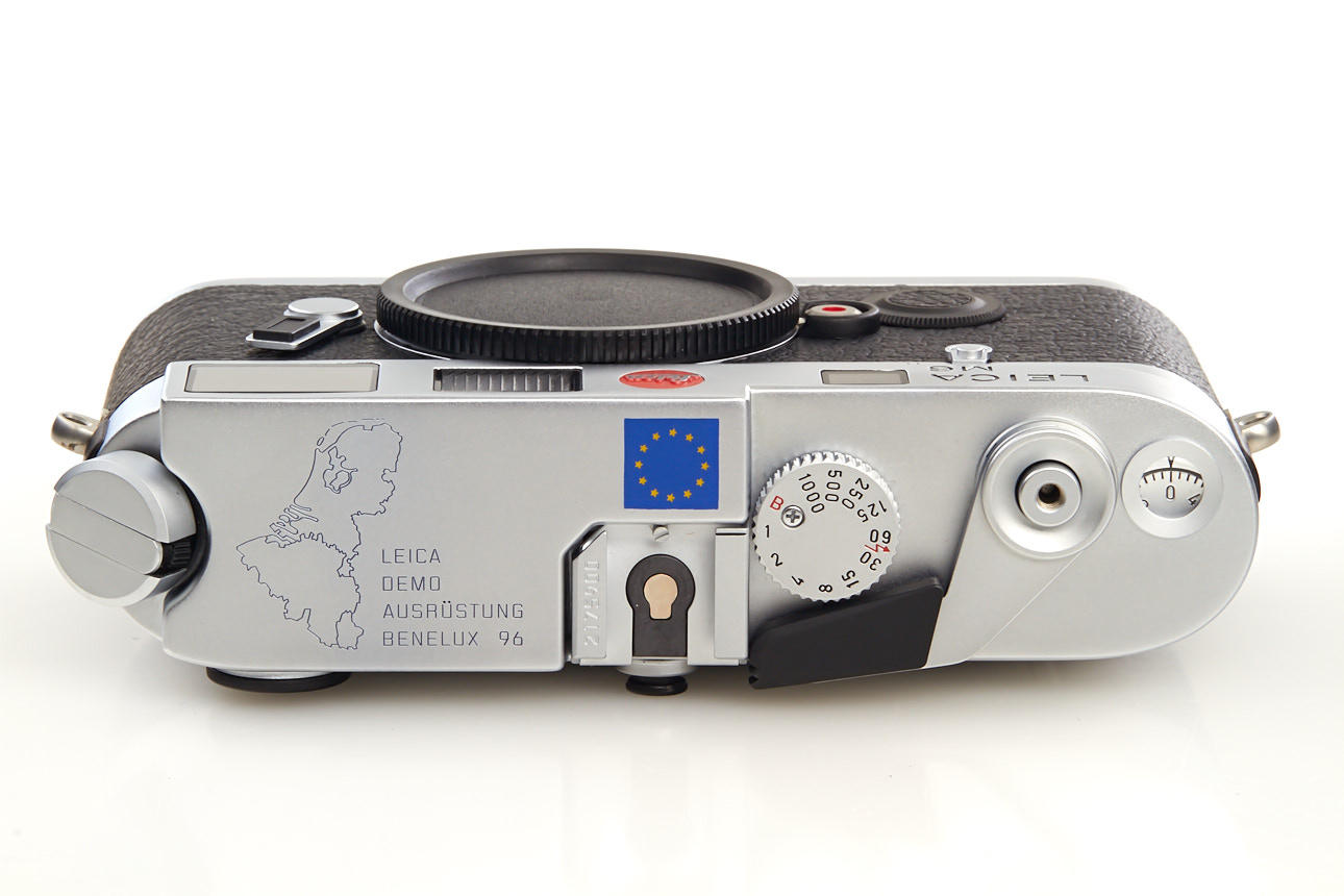 rare edition M6 from a batch of only 70 cameras, marked on top plate 'LEICA DEMO AUSRÜSTUNG BENELUX 96' and European flag, like new, complete with cap, strap, papers and maker's box with matching number
