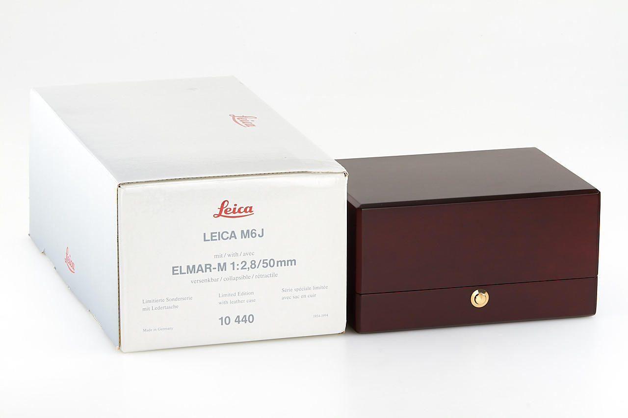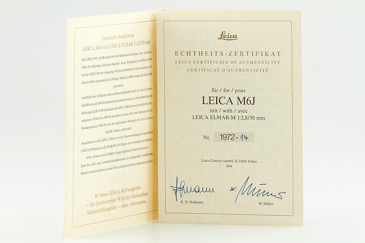 from a special edition of 1640 cameras made to celebrate 40th anniversary of Leica M (40 pieces for each production year), the camera combines features od the M3 and M6 cameras, complete set with camera with matching Elmar 2.8/50mm, brand new with case, papers, wooden presentation box, maker's boxes, in mint, unused condition