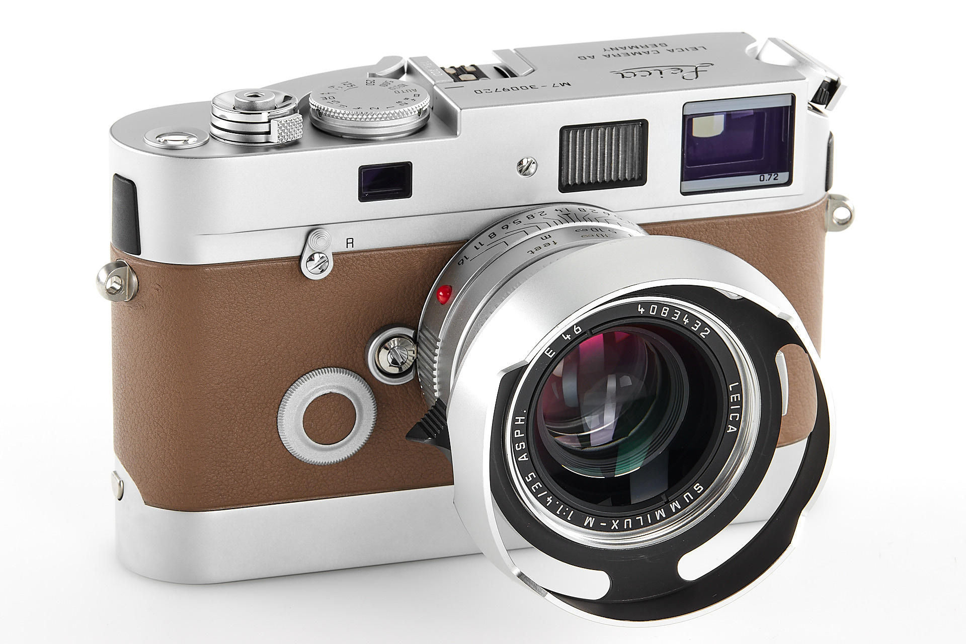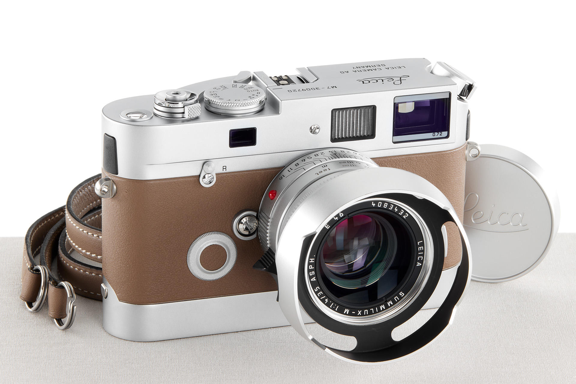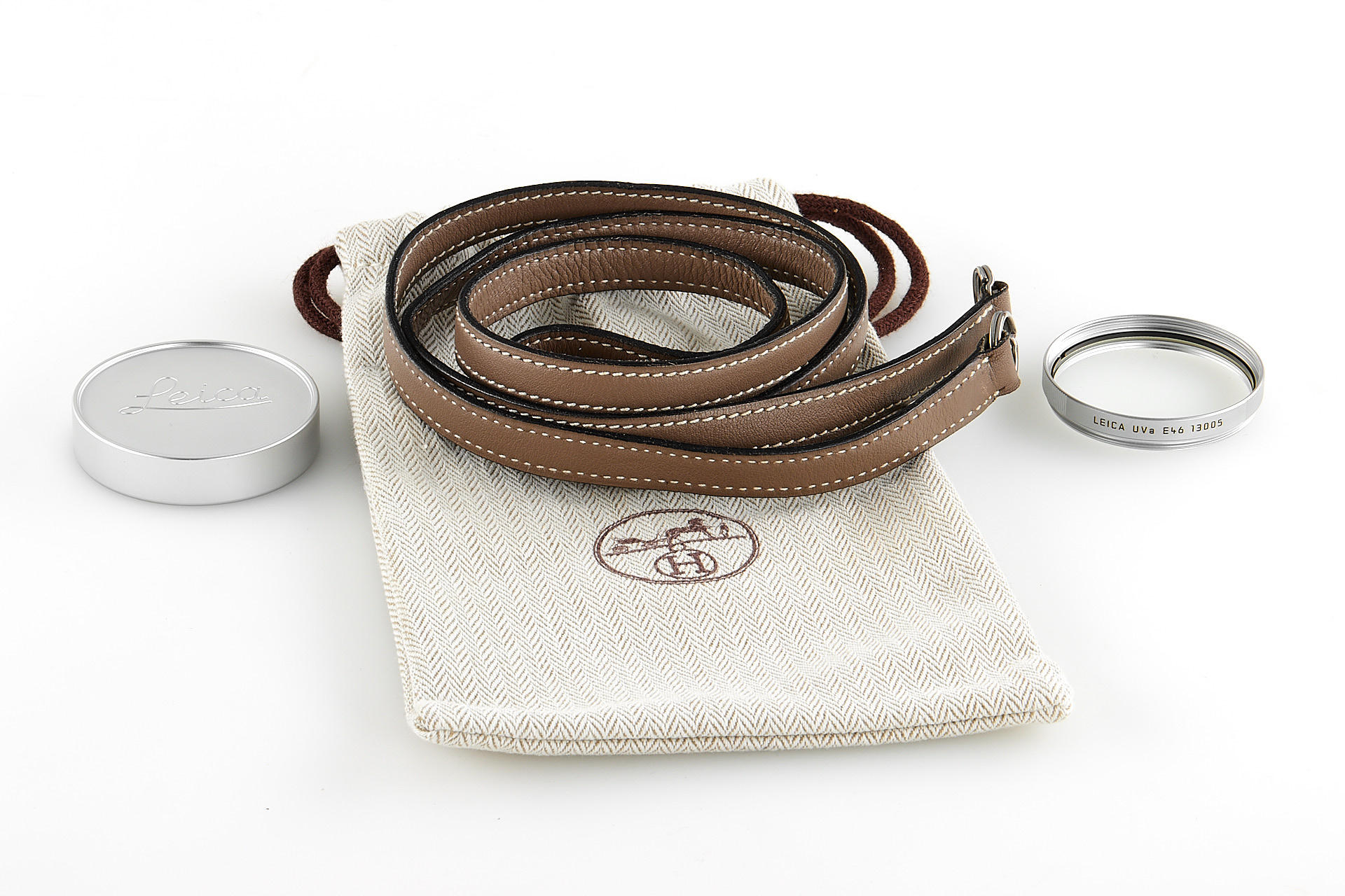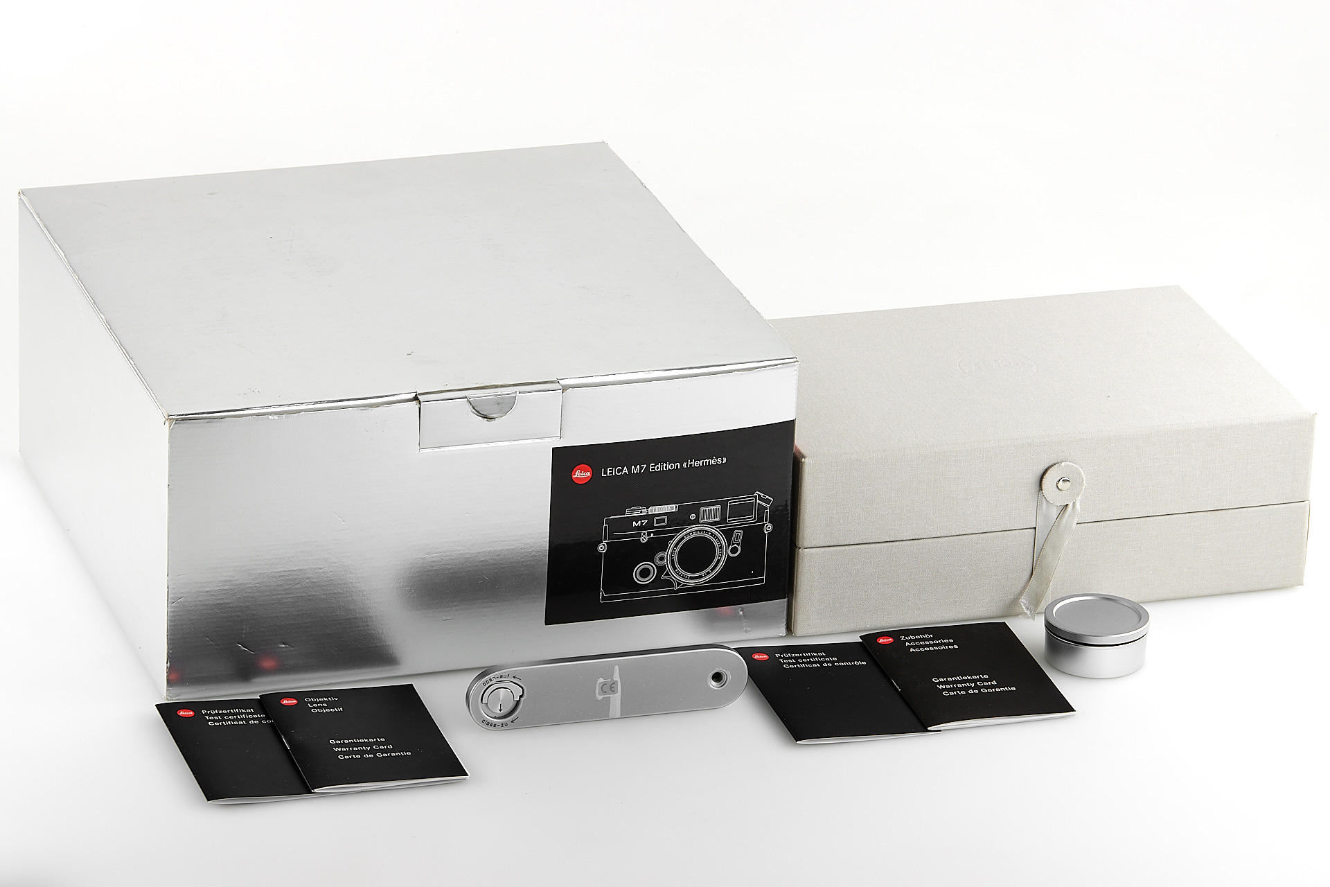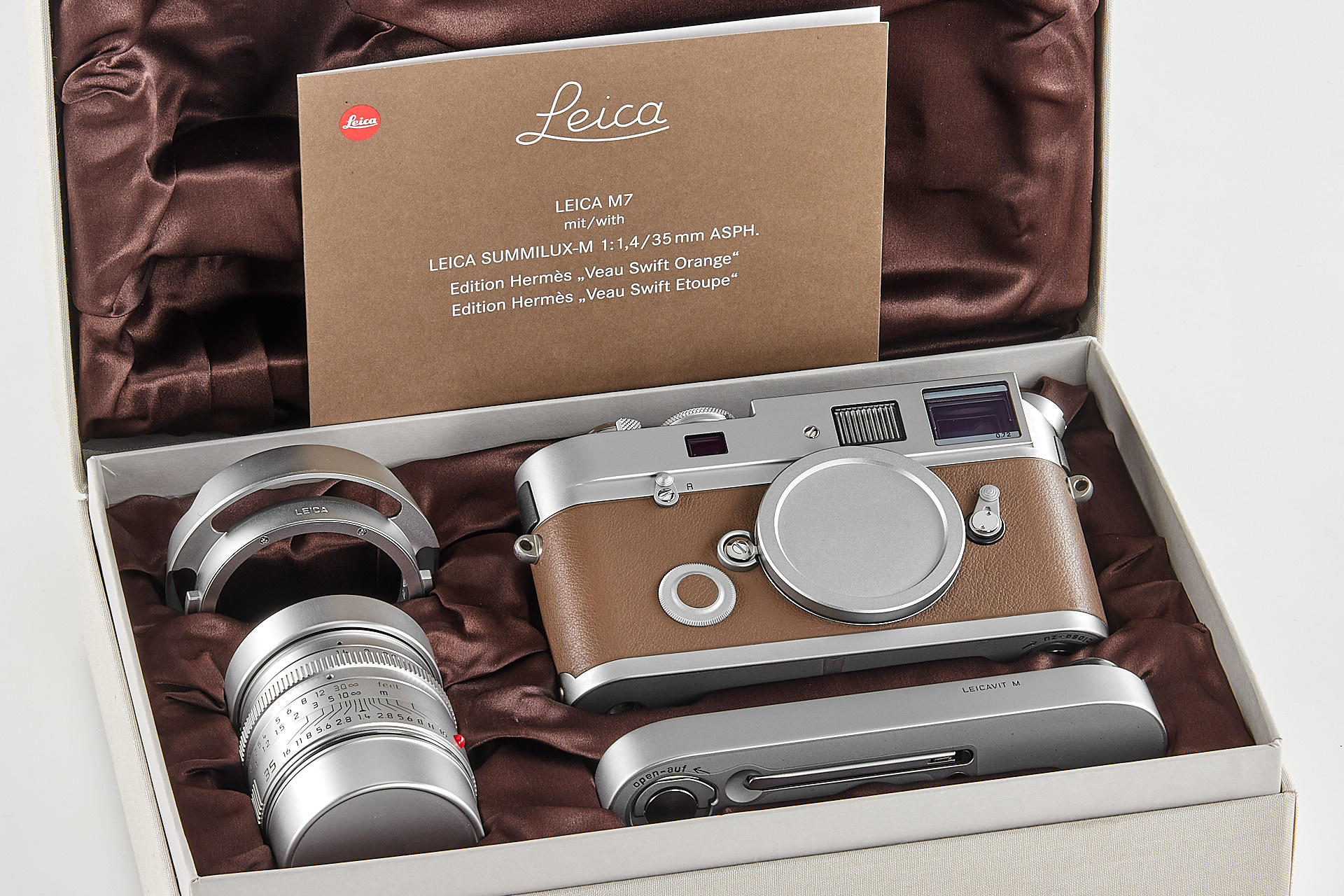 In 2009, Leica Camera AG announced a very special limited edition camera set: the Leica M7 Edition ‘Hermès’. As the successor to the ‘Leica MP Edition Hermès’ launched in 2003, this is the second series of cameras created in co-operation with Hermès. The strictly limited Leica M7 Edition ‘Hermès’ comes in silver chrome with a choice of two striking calfskin leather finishes – orange and étoupe – supplied by Hermès. Just 100 of each colour. It includes a silver anodised Leica Summilux-m 35mm f/1.4 ASPH. With a matching classic vented lotus lens hood in silver anodised metal, manufactured specifically for these models, and a Leicavit m rapid winder in silver chrome. A leather carrying strap, handcrafted by atelier Hermès to match the colour of each camera. The offered set is in almost mint condition (tiny ding near the rewind knob), with a Leica M7 no.3009720, Summilux-M no.4083432, including all papers and accessories.