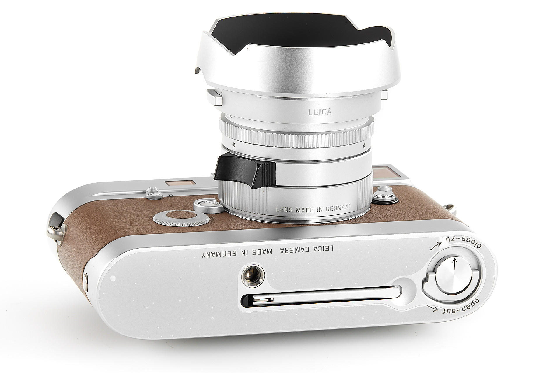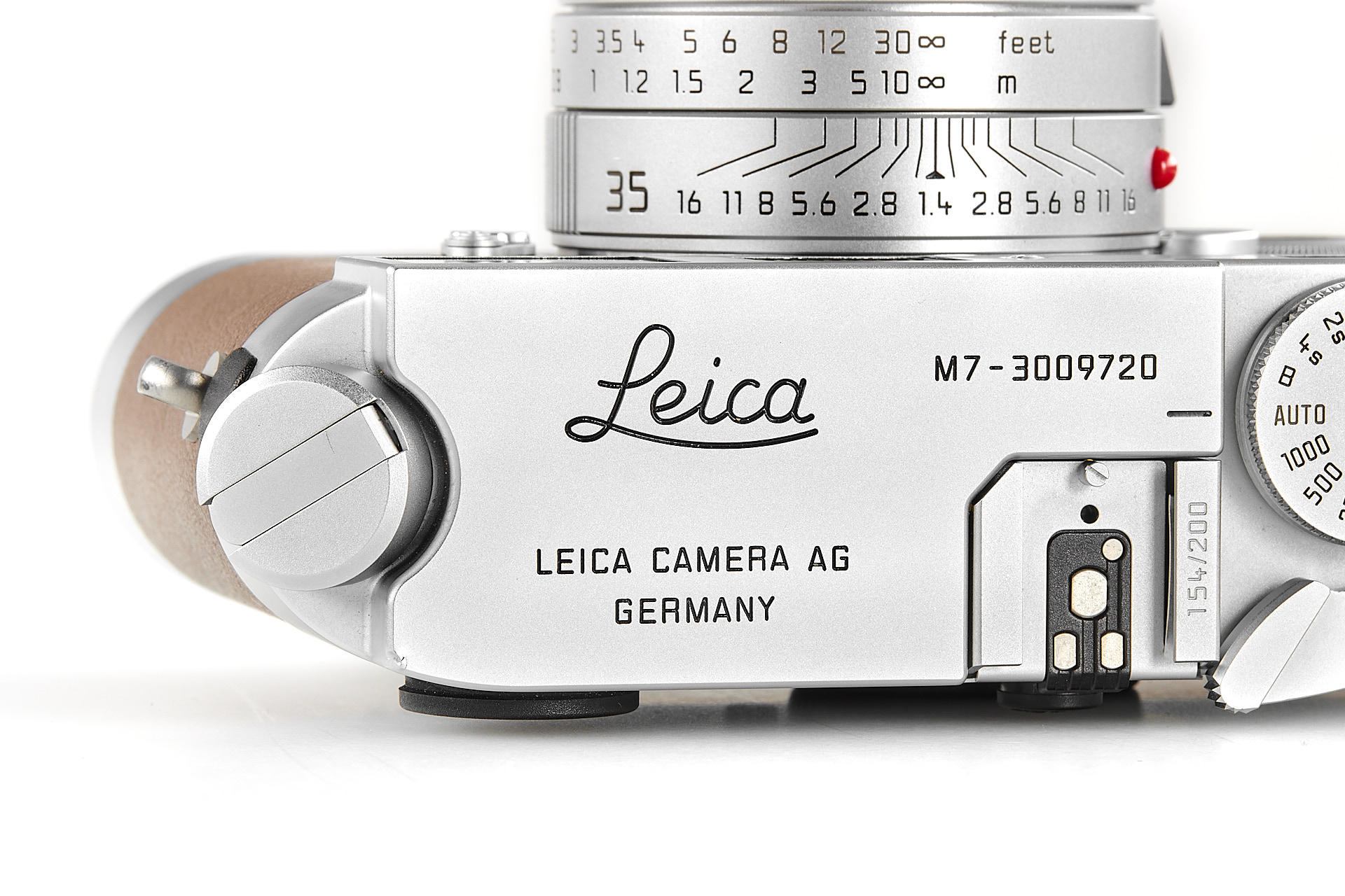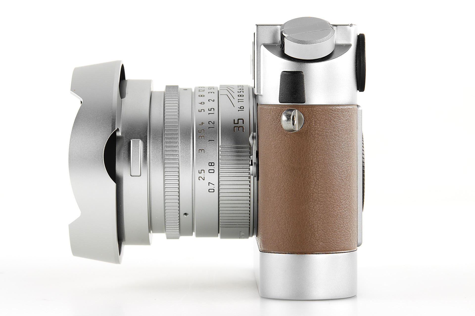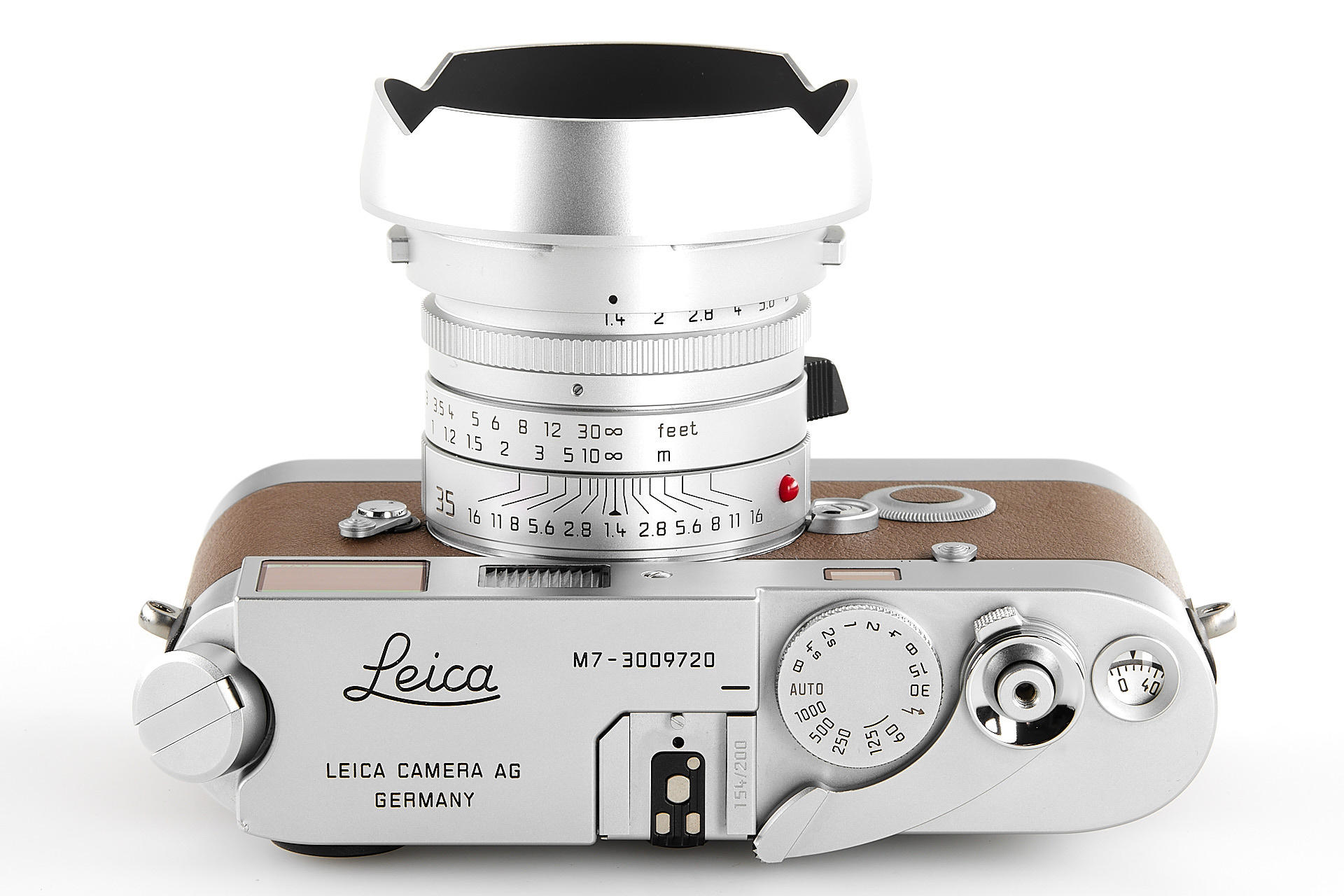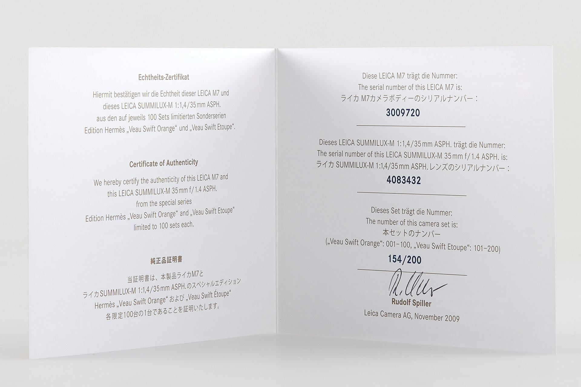 In 2009, Leica Camera AG announced a very special limited edition camera set: the Leica M7 Edition ‘Hermès’. As the successor to the ‘Leica MP Edition Hermès’ launched in 2003, this is the second series of cameras created in co-operation with Hermès. The strictly limited Leica M7 Edition ‘Hermès’ comes in silver chrome with a choice of two striking calfskin leather finishes – orange and étoupe – supplied by Hermès. Just 100 of each colour. It includes a silver anodised Leica Summilux-m 35mm f/1.4 ASPH. With a matching classic vented lotus lens hood in silver anodised metal, manufactured specifically for these models, and a Leicavit m rapid winder in silver chrome. A leather carrying strap, handcrafted by atelier Hermès to match the colour of each camera. The offered set is in almost mint condition (tiny ding near the rewind knob), with a Leica M7 no.3009720, Summilux-M no.4083432, including all papers and accessories.