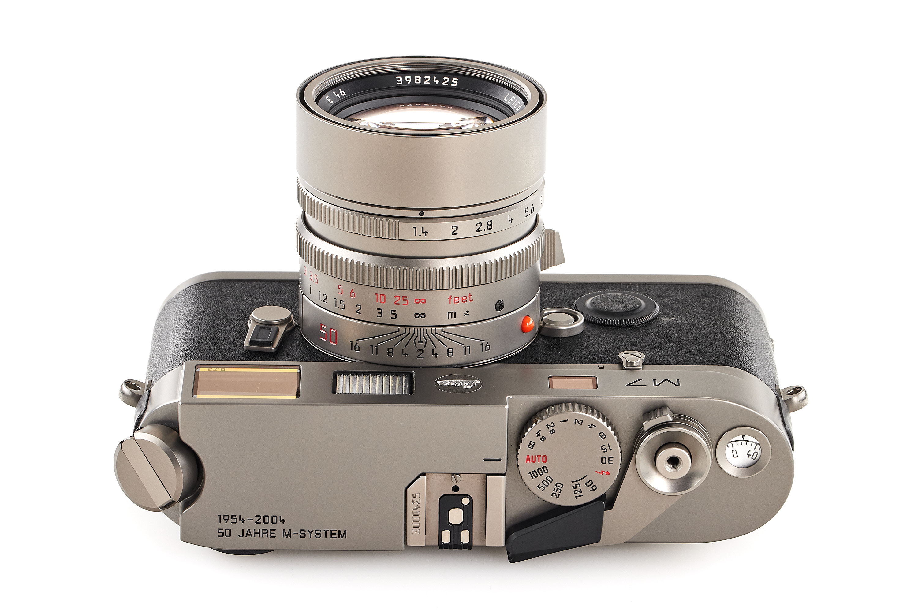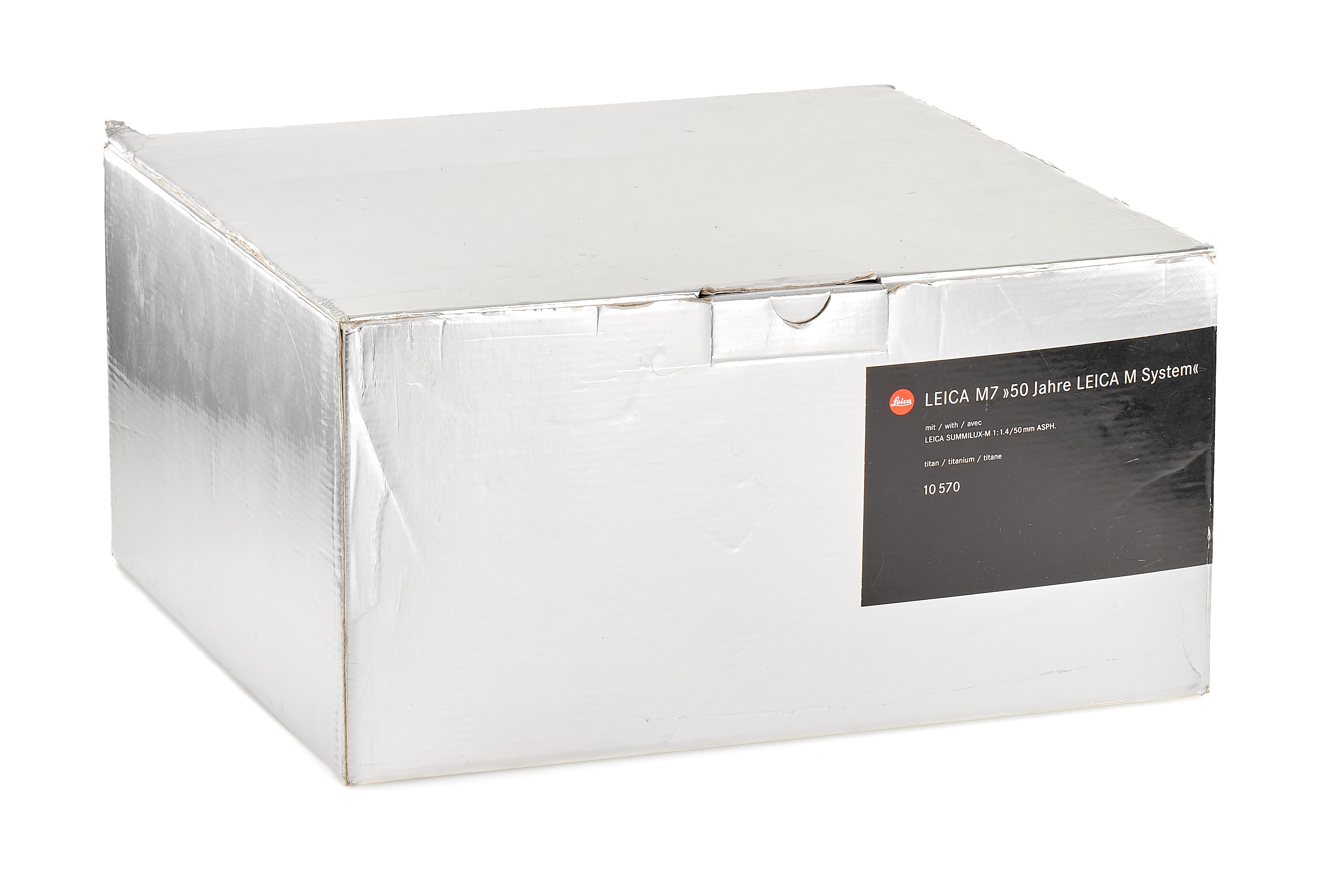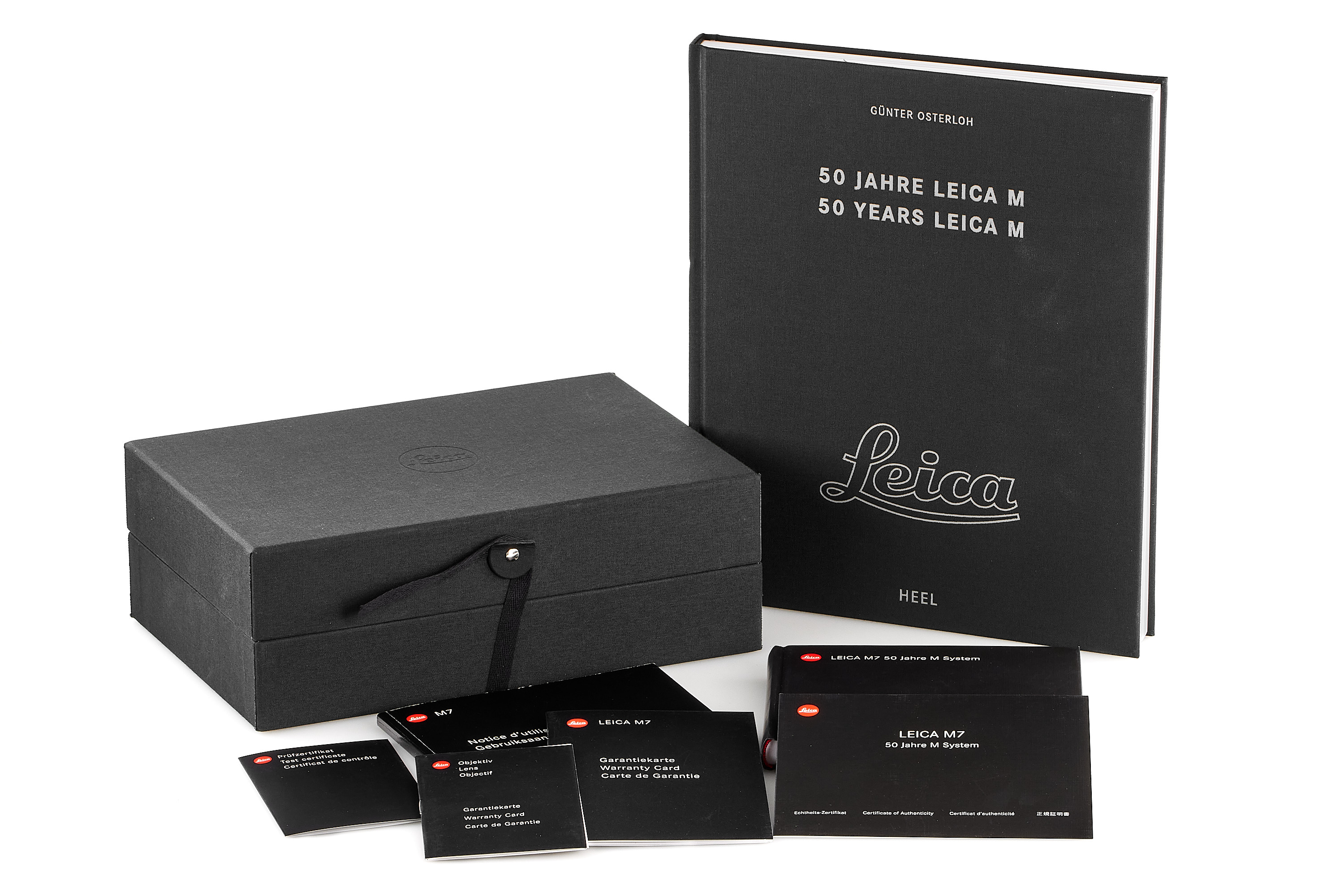 Beautiful limited edition M7 in titanium finish produced at 500 units to celebrate the 50th anniversary of the Leica M system, with special engravings on the top plate, in near-mint condition, showing some lack of paint on the rear door and light scratches on the front panel, in working order, with matching Summilux-M 1.4/50mm Asph. no.3982425 later 6-bit coded, complete set with all caps, strap, papers, leather pouch, Günther Osterloh '50 Years Leica M' book, presentation and maker's boxes.