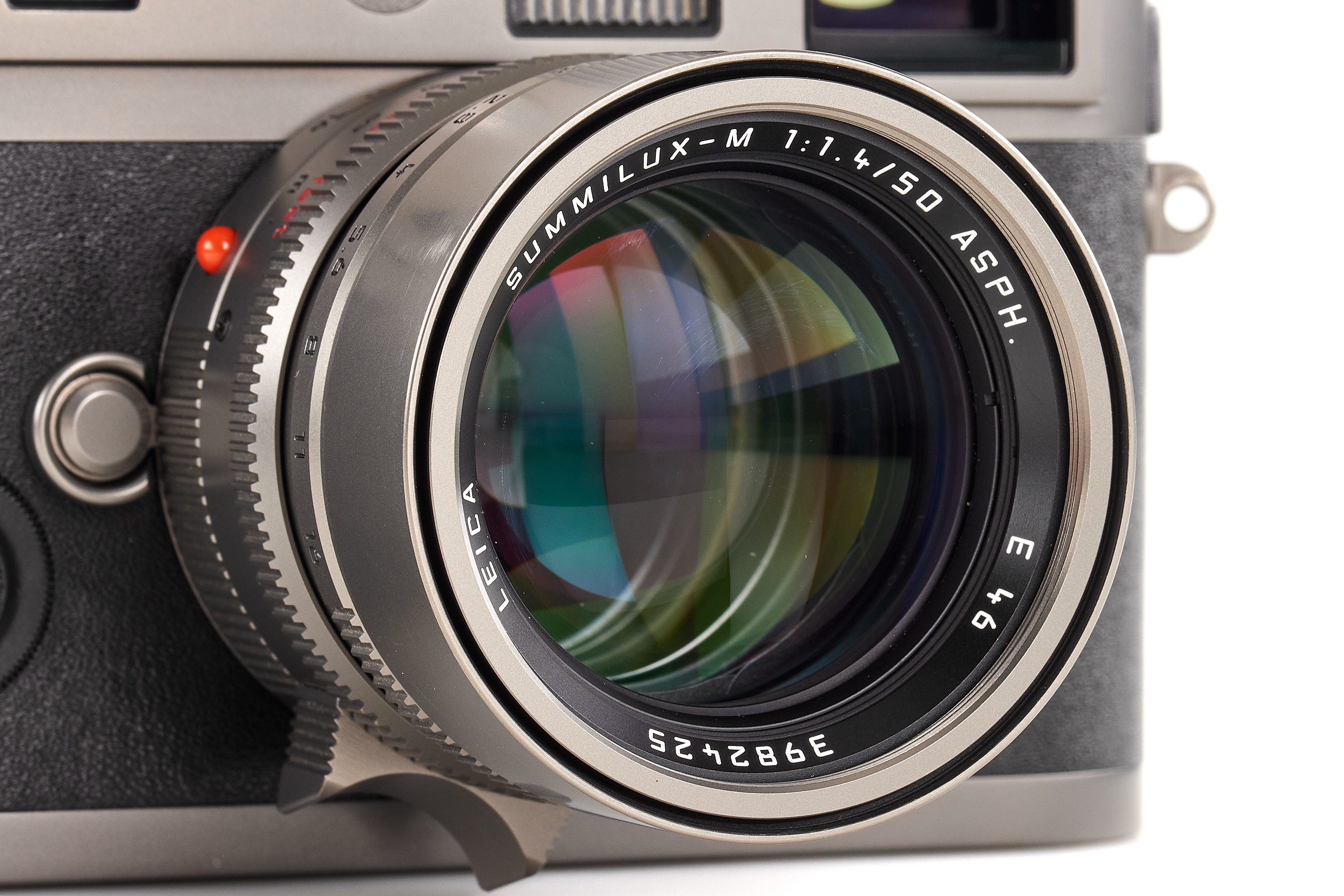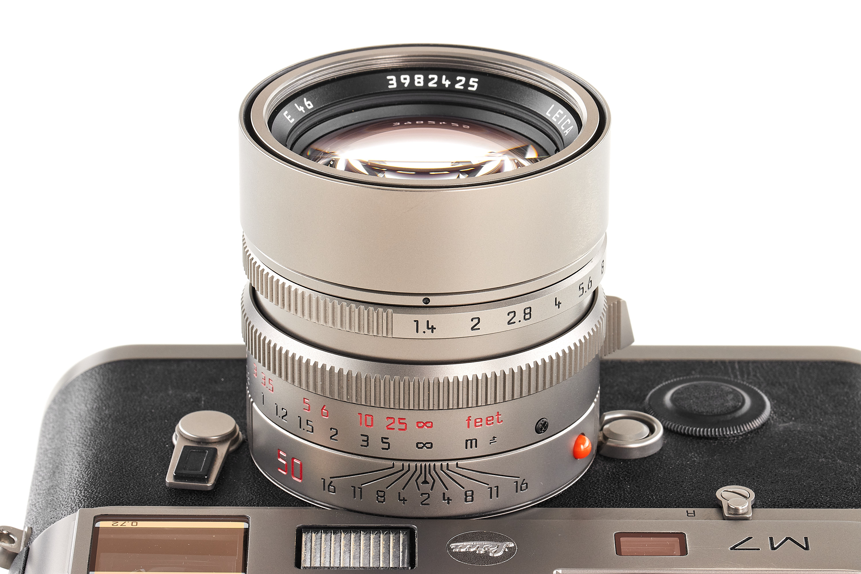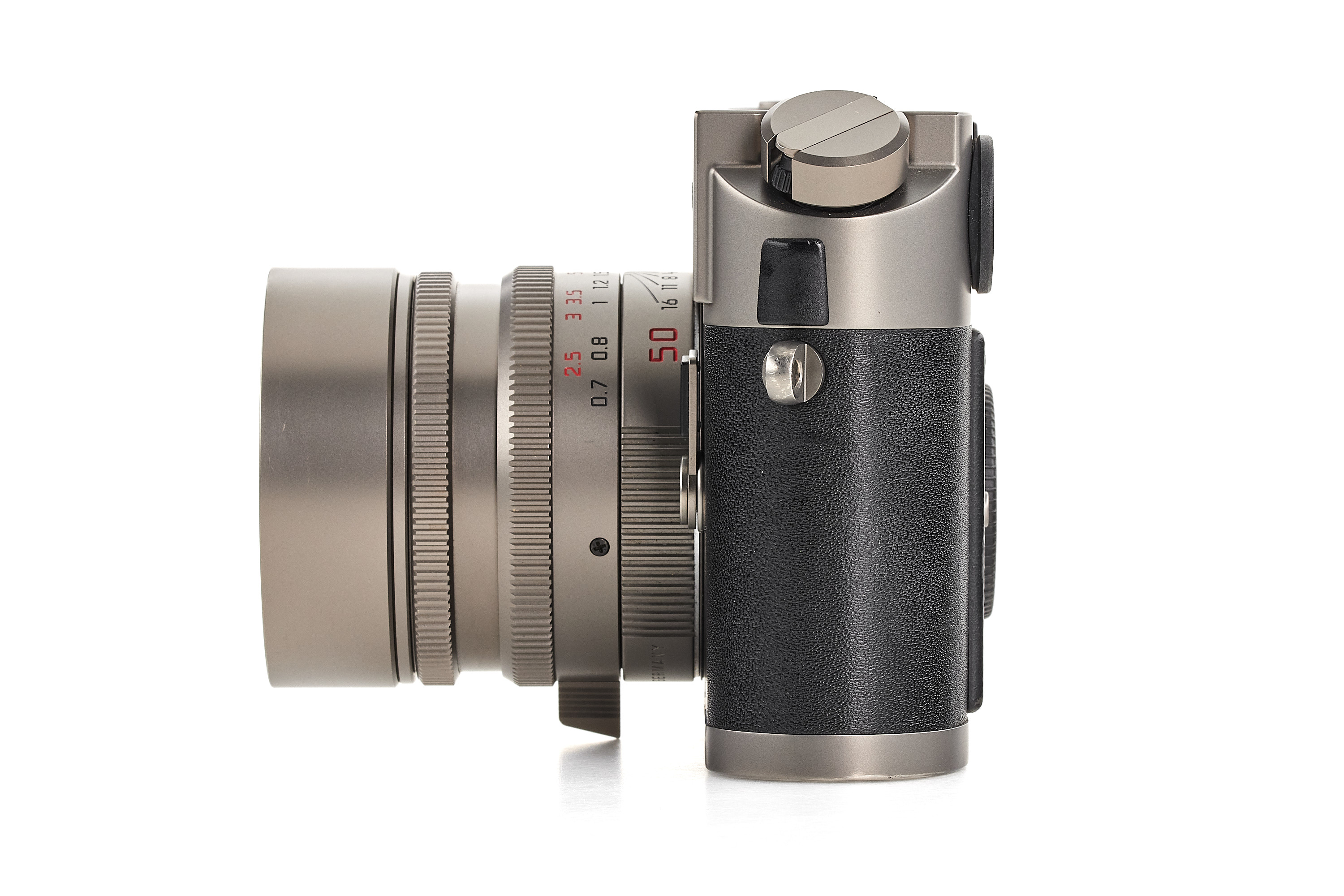 Beautiful limited edition M7 in titanium finish produced at 500 units to celebrate the 50th anniversary of the Leica M system, with special engravings on the top plate, in near-mint condition, showing some lack of paint on the rear door and light scratches on the front panel, in working order, with matching Summilux-M 1.4/50mm Asph. no.3982425 later 6-bit coded, complete set with all caps, strap, papers, leather pouch, Günther Osterloh '50 Years Leica M' book, presentation and maker's boxes.