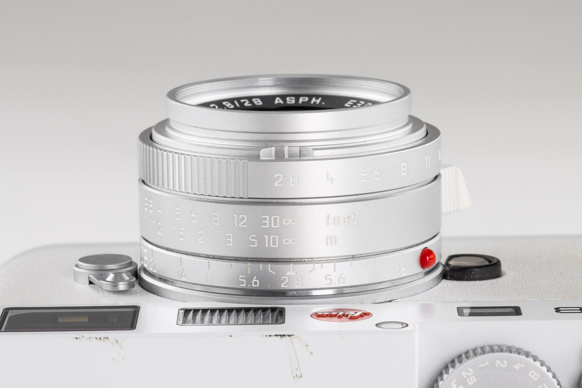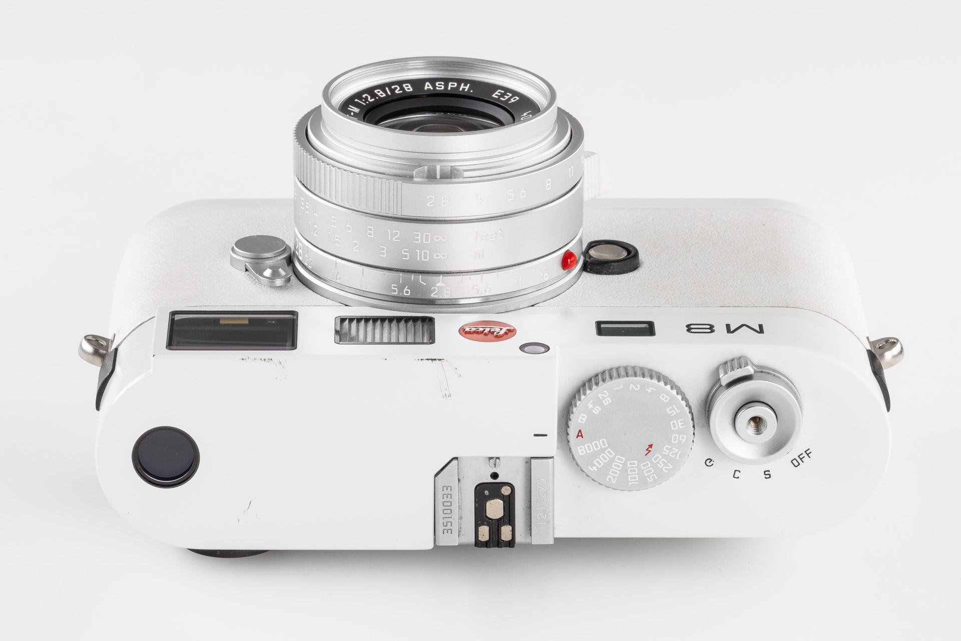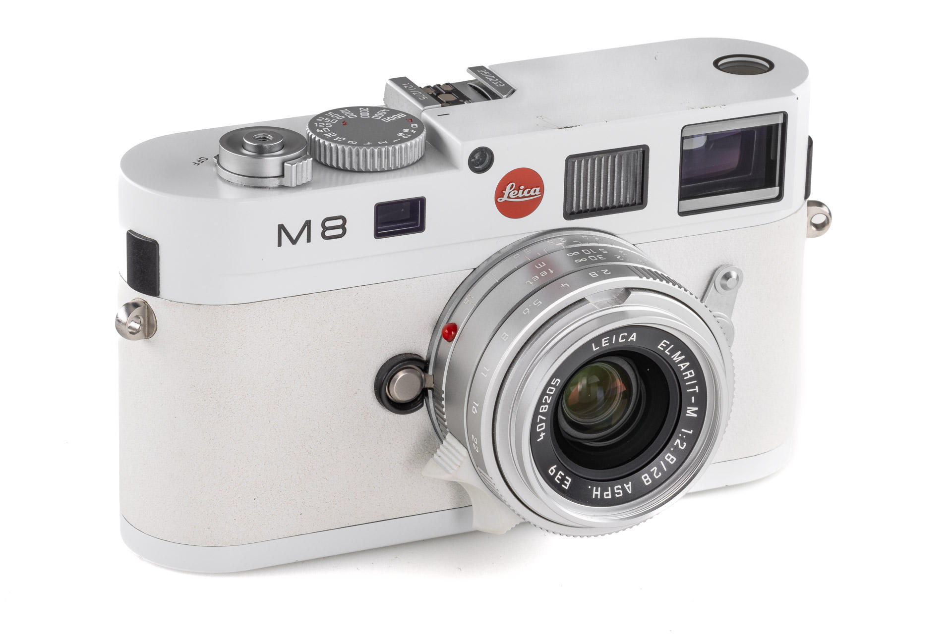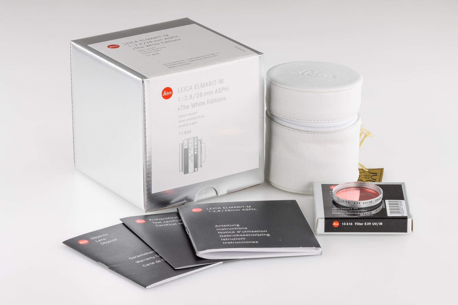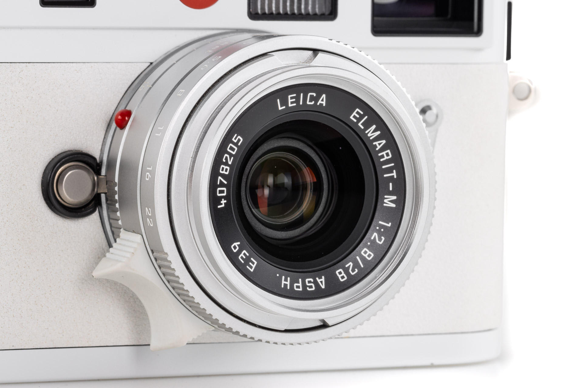 From a limited edition of 275 cameras, with body no.3510033 in near mint condition, showing some scratches in the paint on the bottom plate, together with matching silver anodized Elmarit-M 2.8/28mm Asph. no.4078205 (clean and clear lenses), with all accessories except the original white leather strap, papers, certificate and maker's box