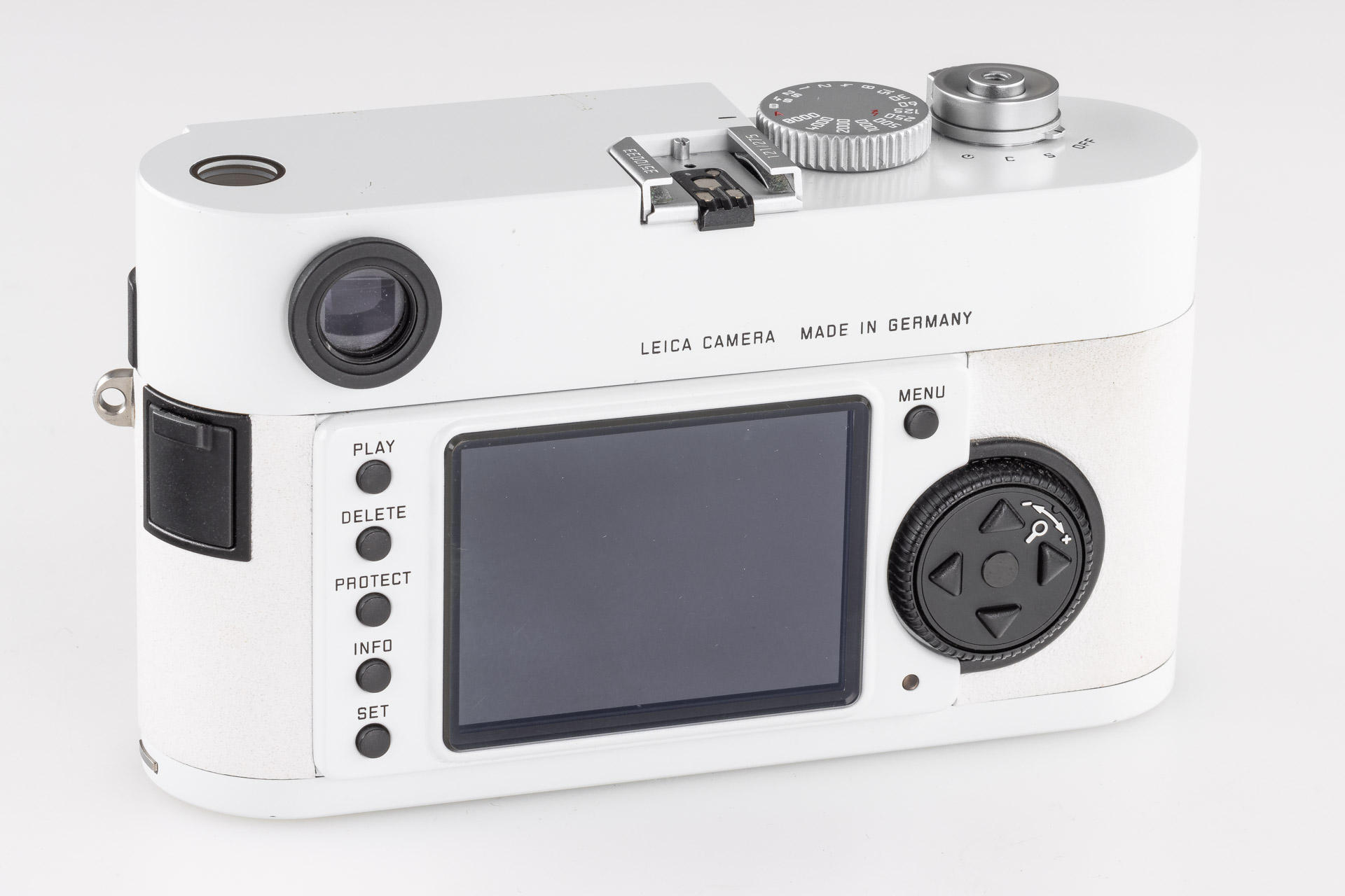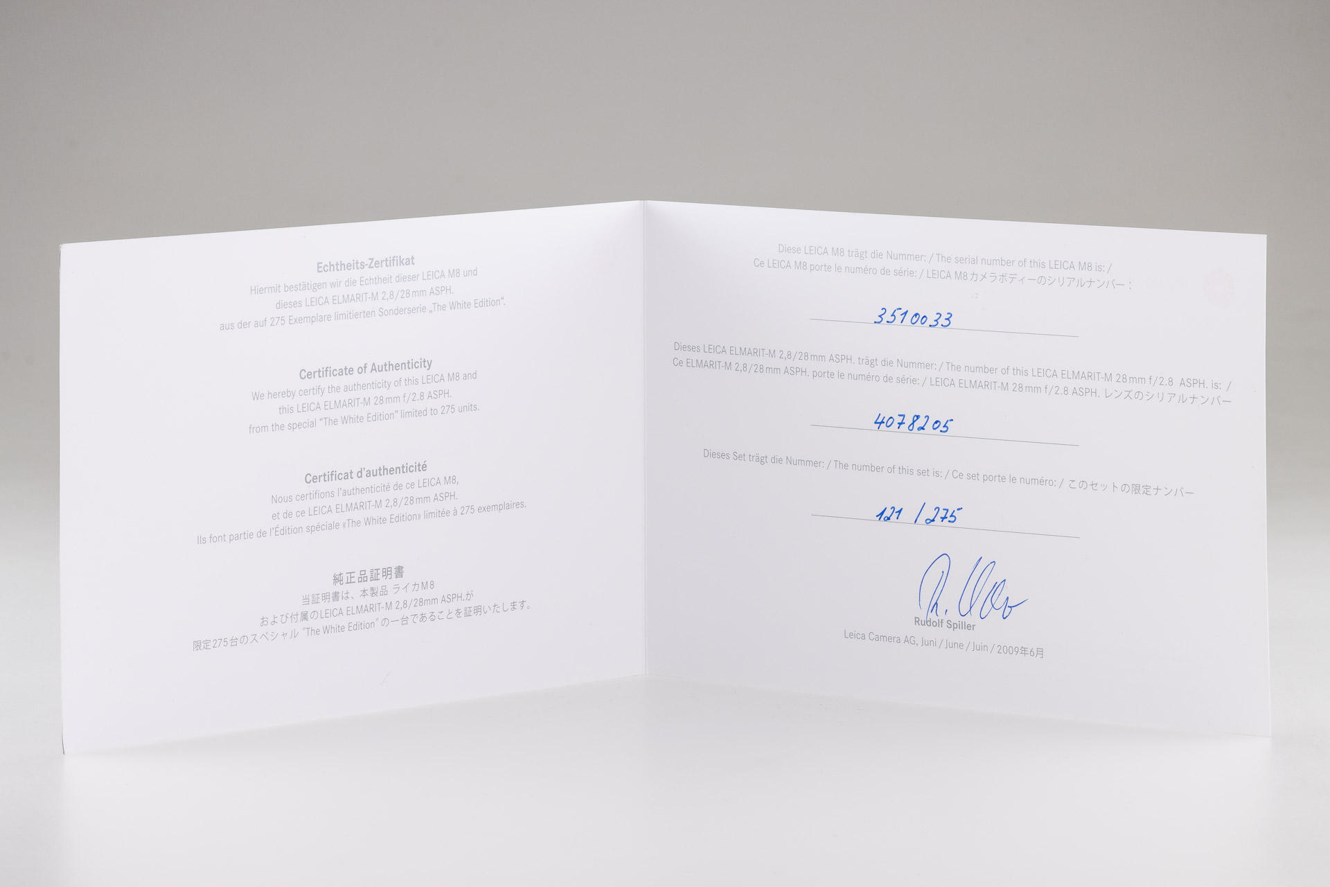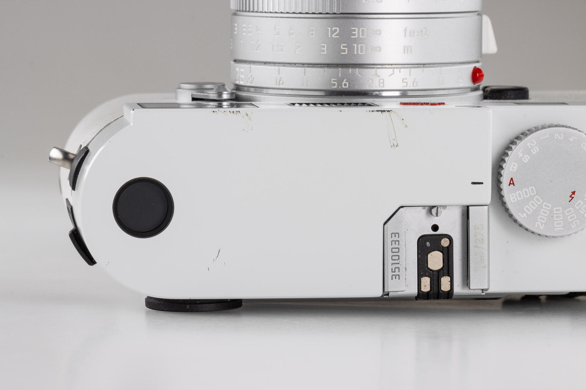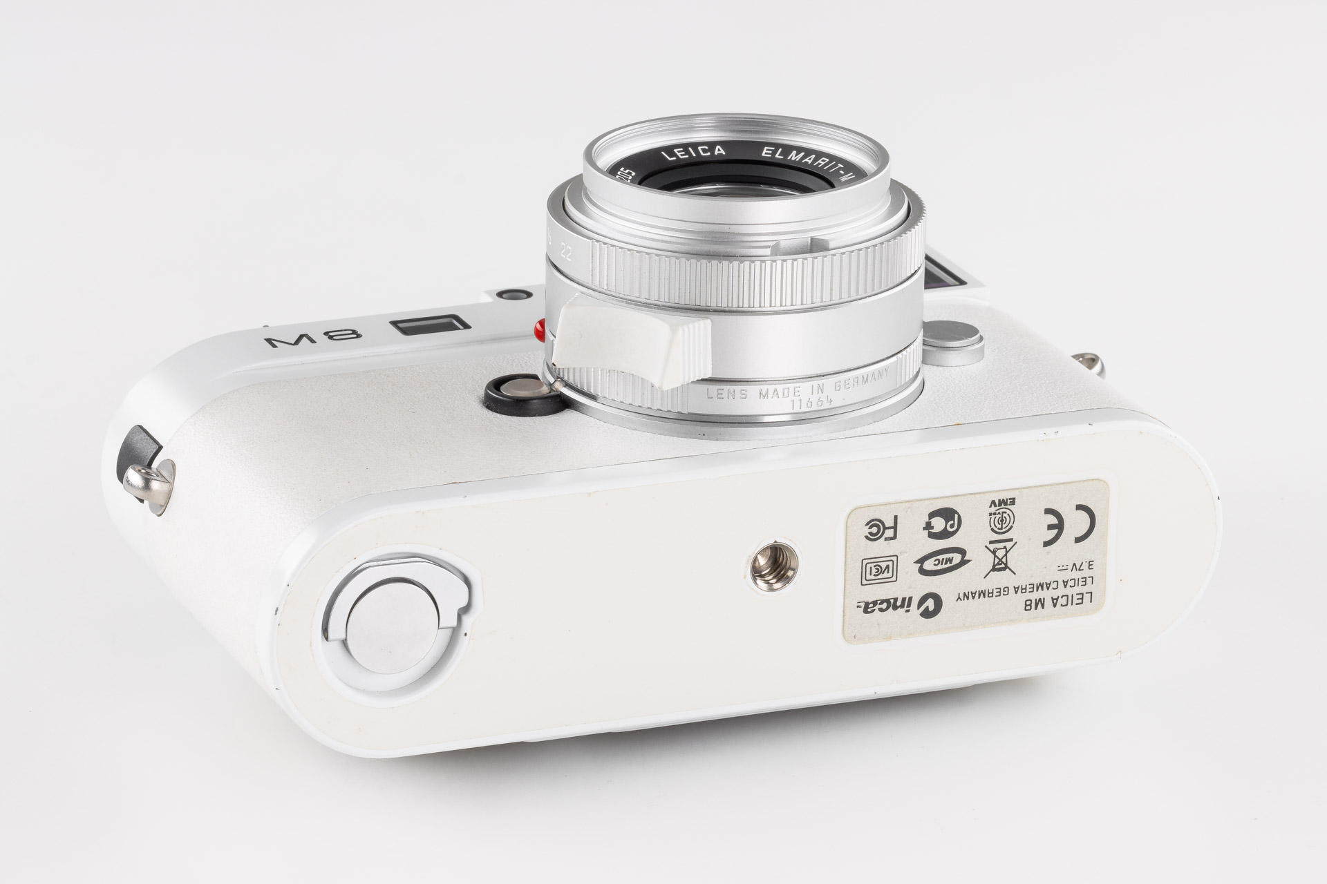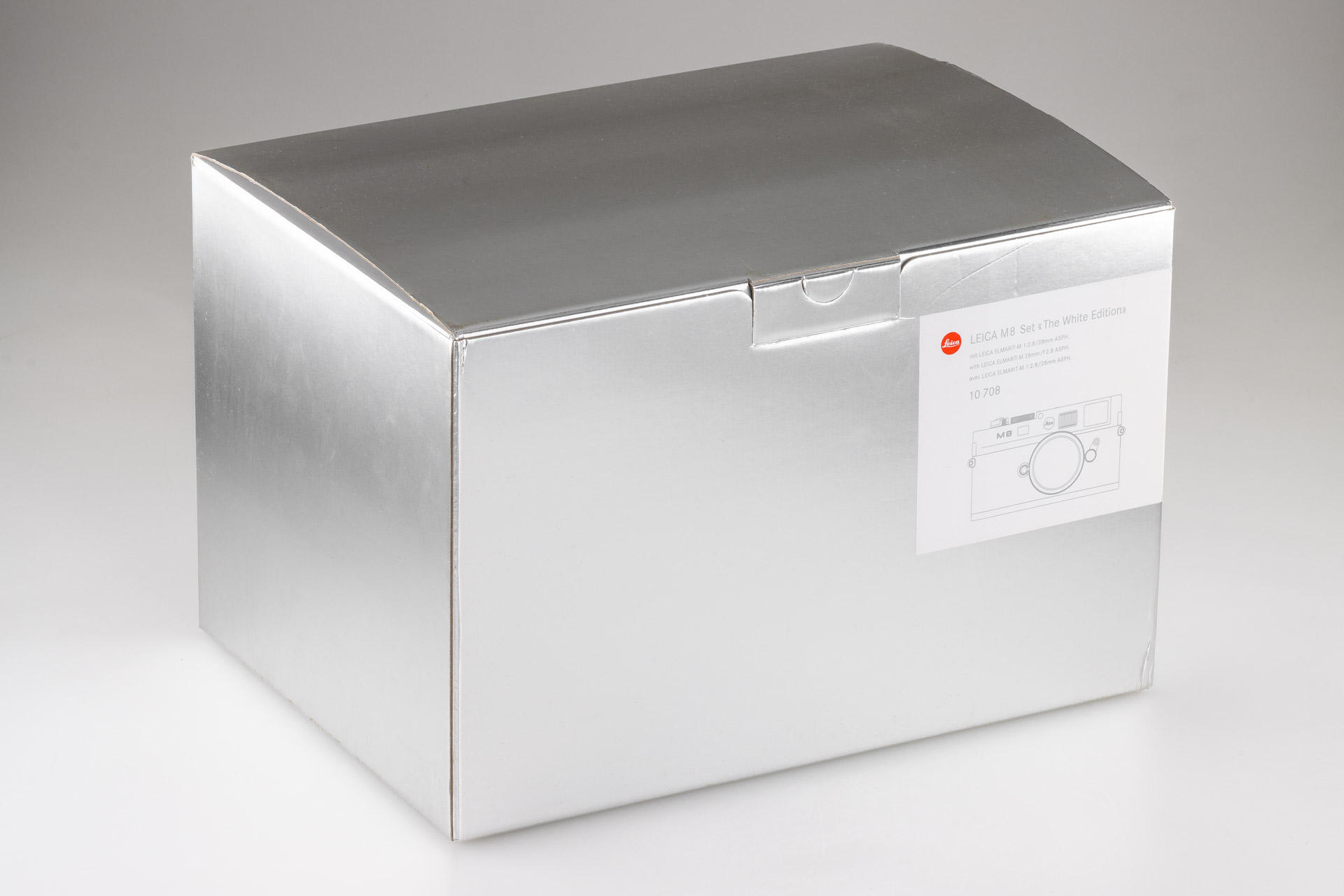 From a limited edition of 275 cameras, with body no.3510033 in near mint condition, showing some scratches in the paint on the bottom plate, together with matching silver anodized Elmarit-M 2.8/28mm Asph. no.4078205 (clean and clear lenses), with all accessories except the original white leather strap, papers, certificate and maker's box