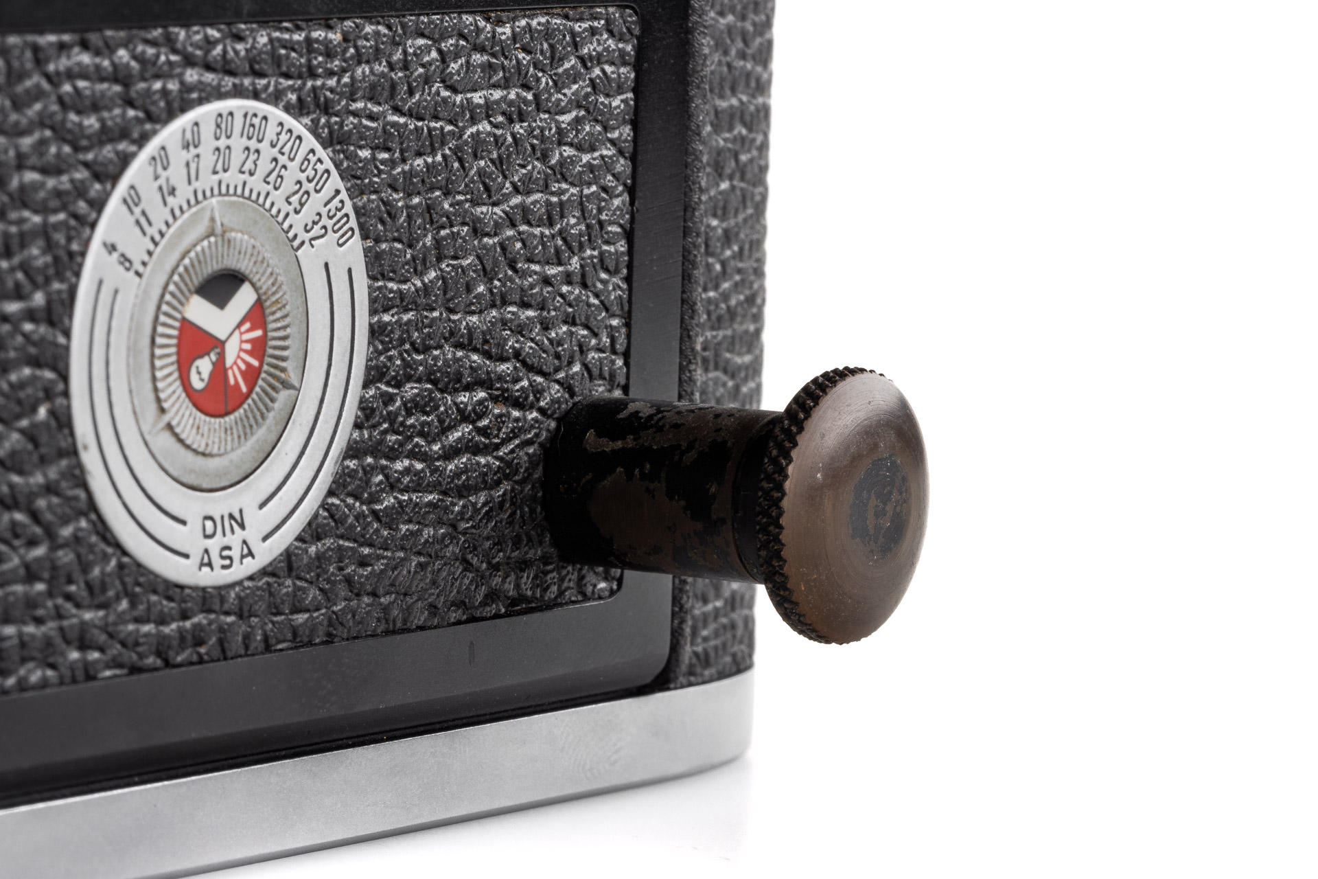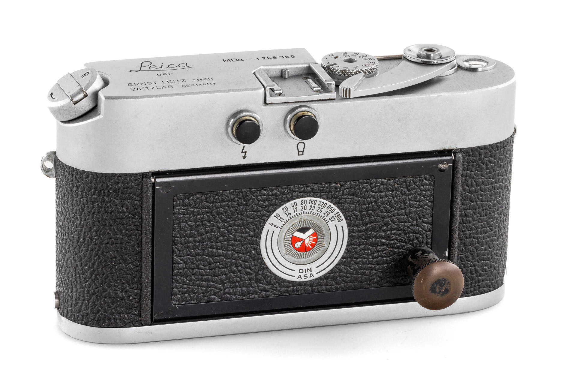 an interesting MDa, modified for scientific use, with an oversized rewind lever, and a unique film locking knob on the film back, excellent working condition