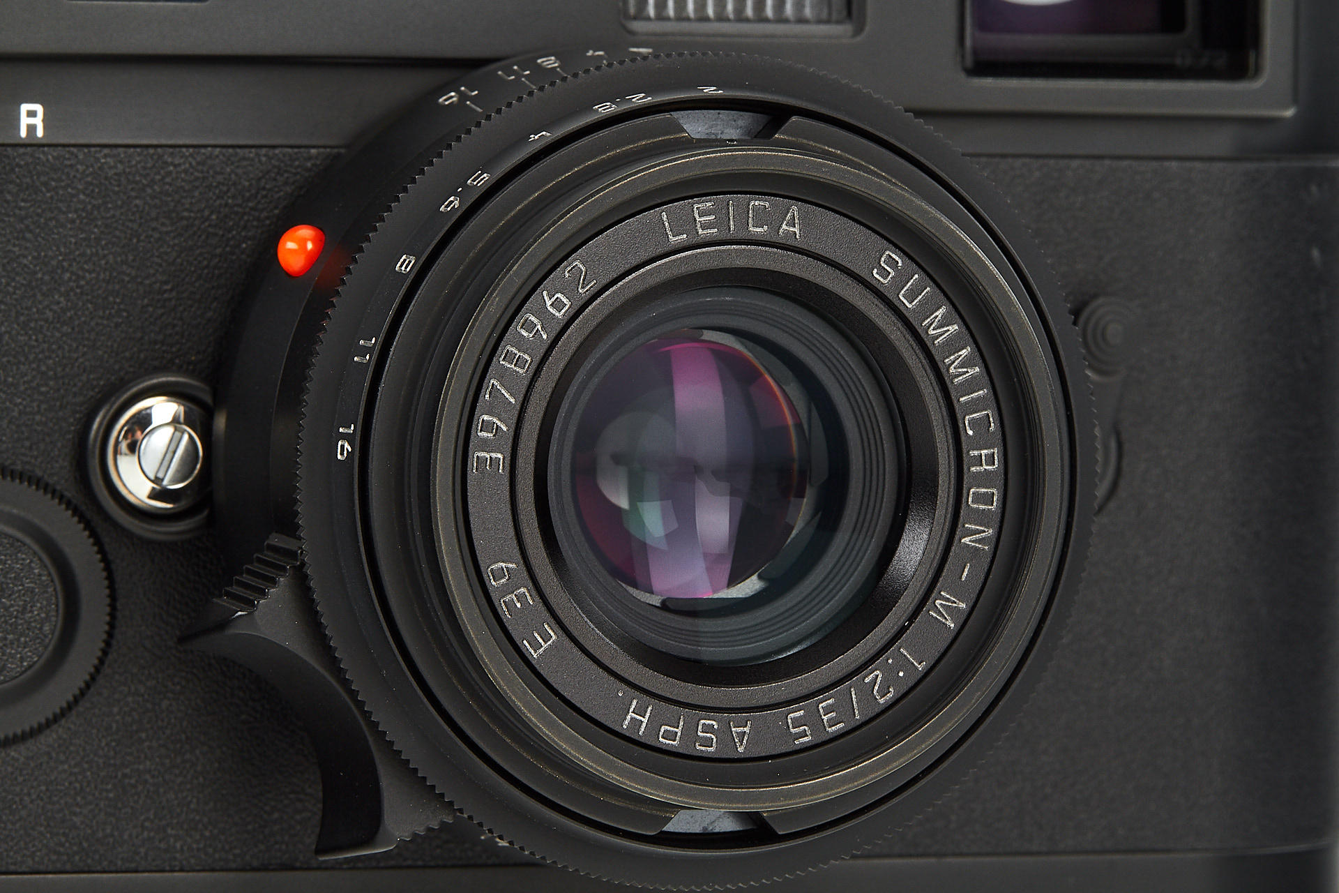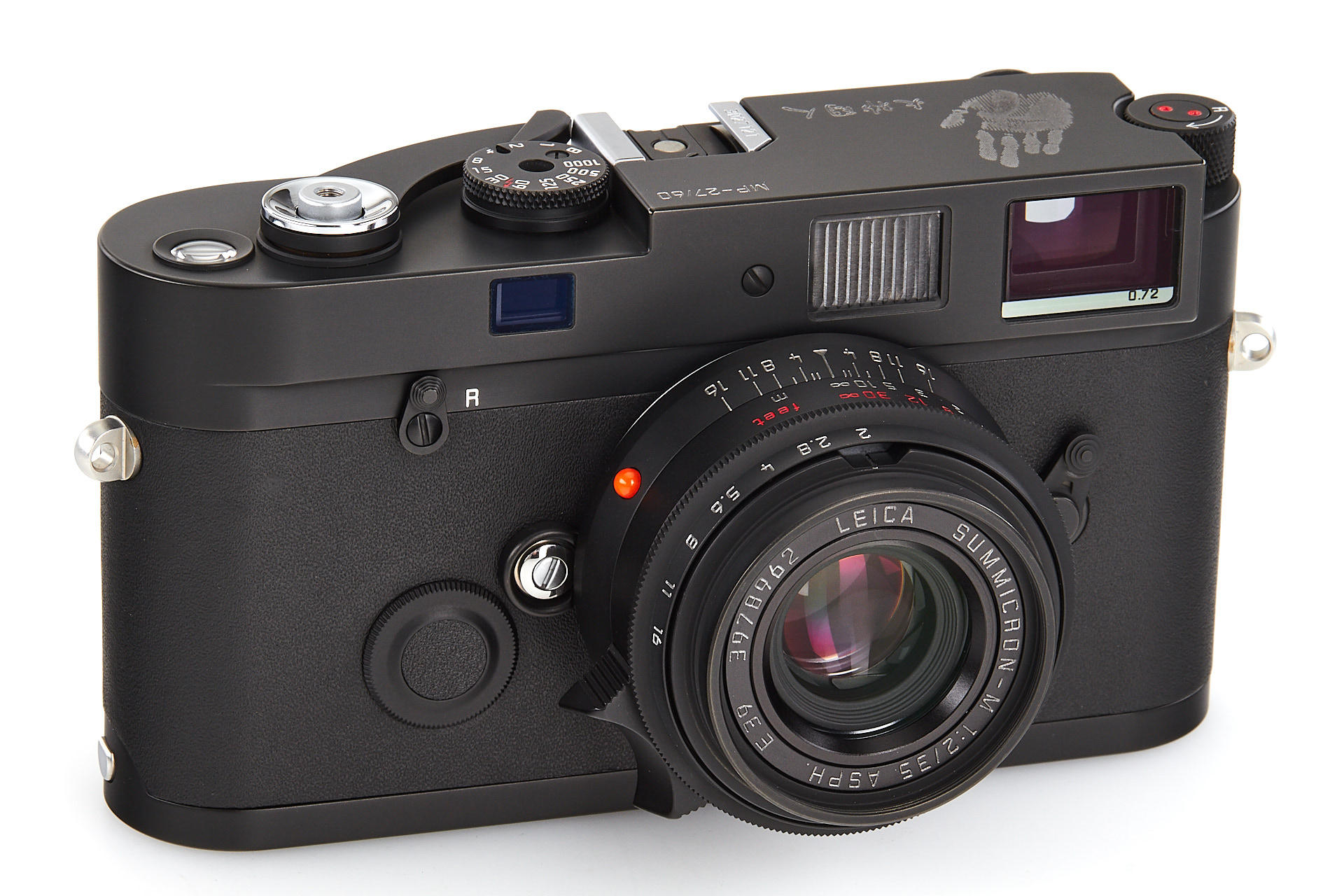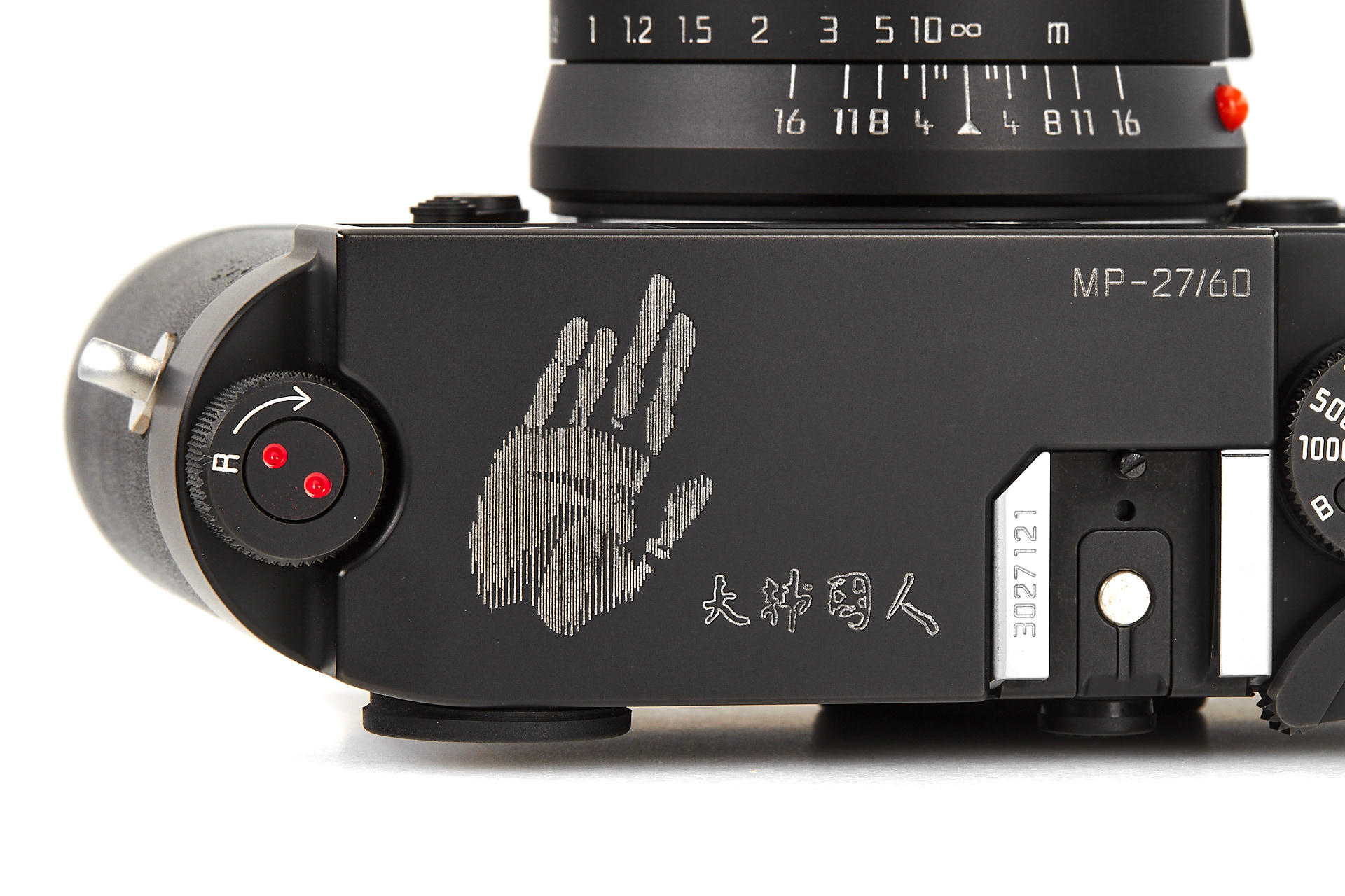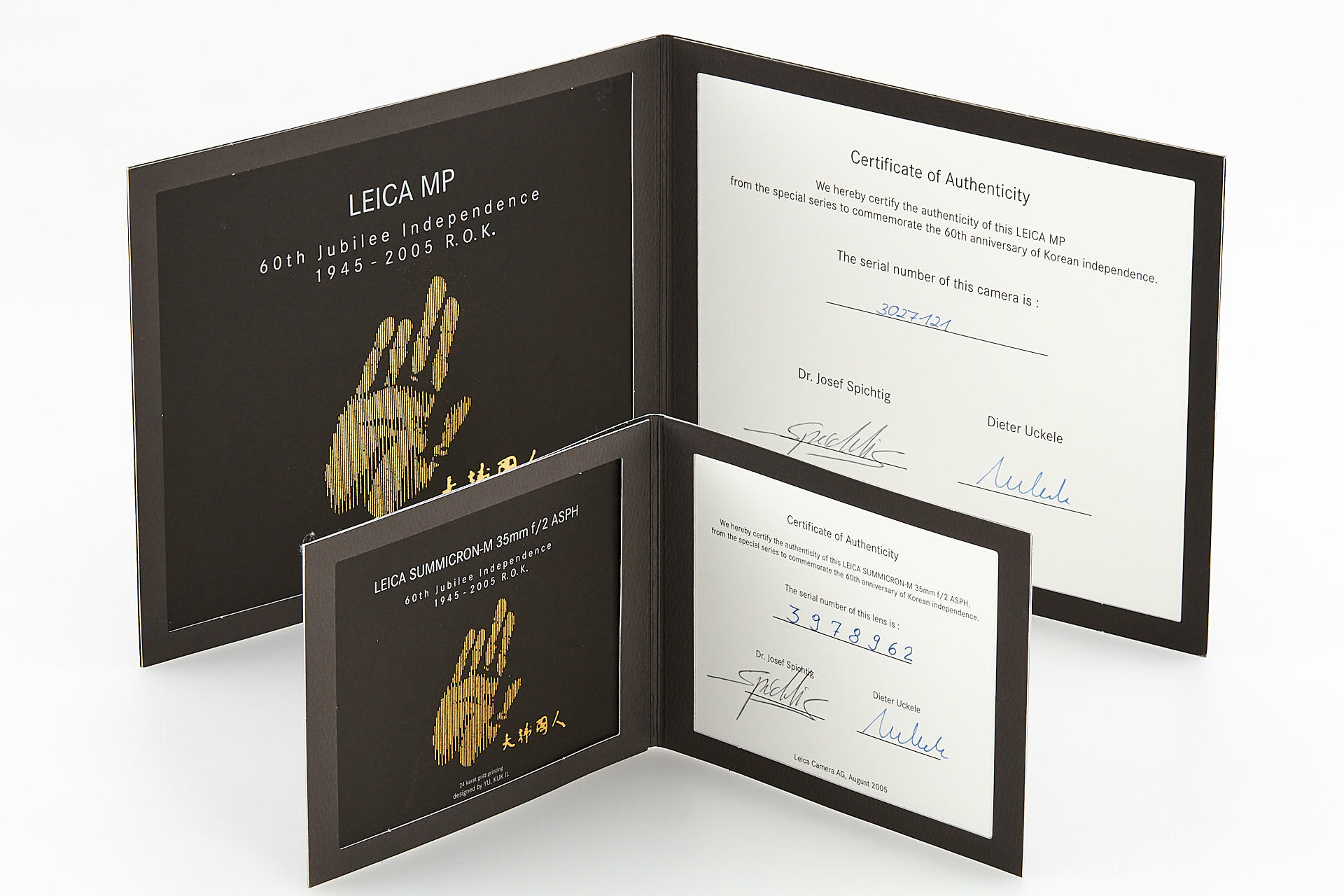 special edition Leica MP, issued in 2005 to commemorate the 60th anniversary of Korean independence, black body no.3027121, with special engraving and black leather covering, a certificate with 24 karat gold printing, all papers and maker's box, incl. matching Summicron-M 2/35mm ASPH. no.3978962, in a special black chrome finish, with certificate and maker's box