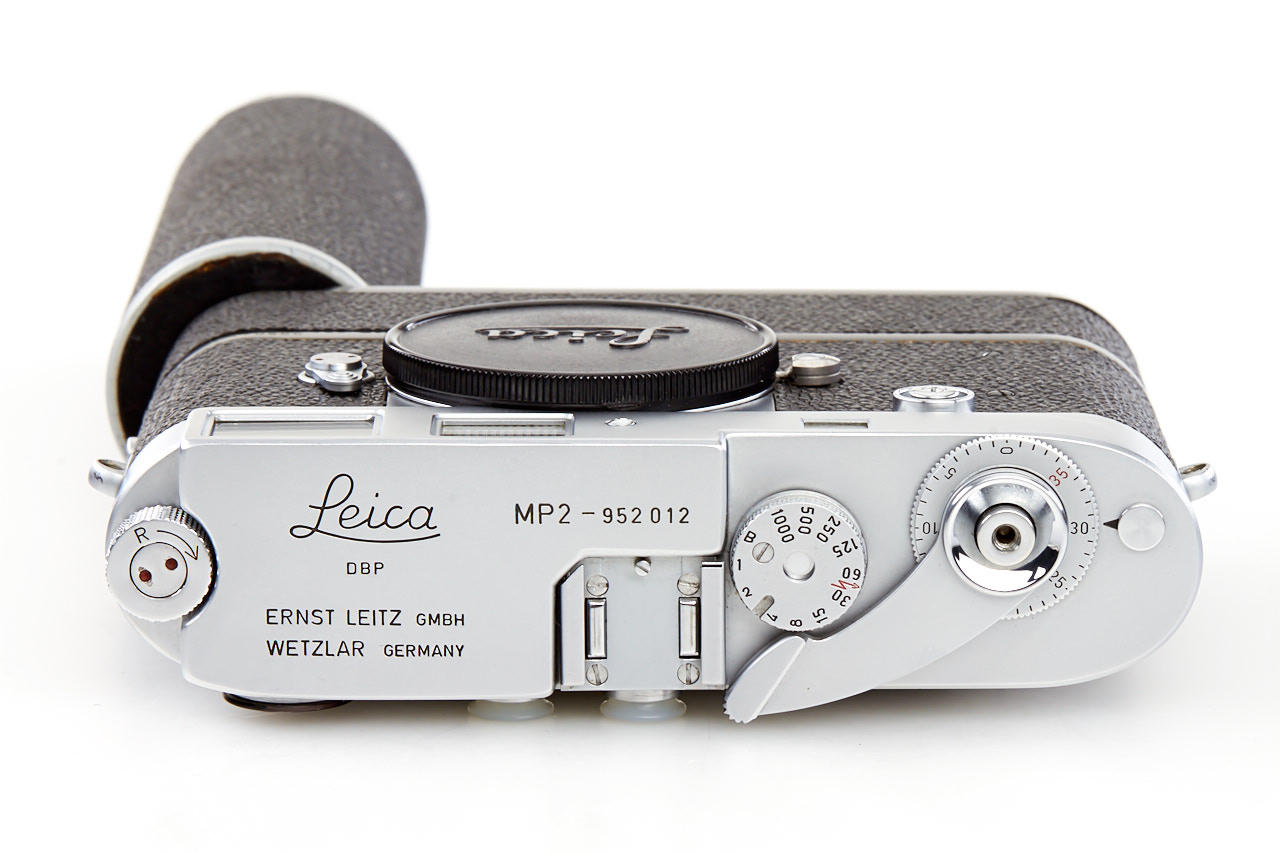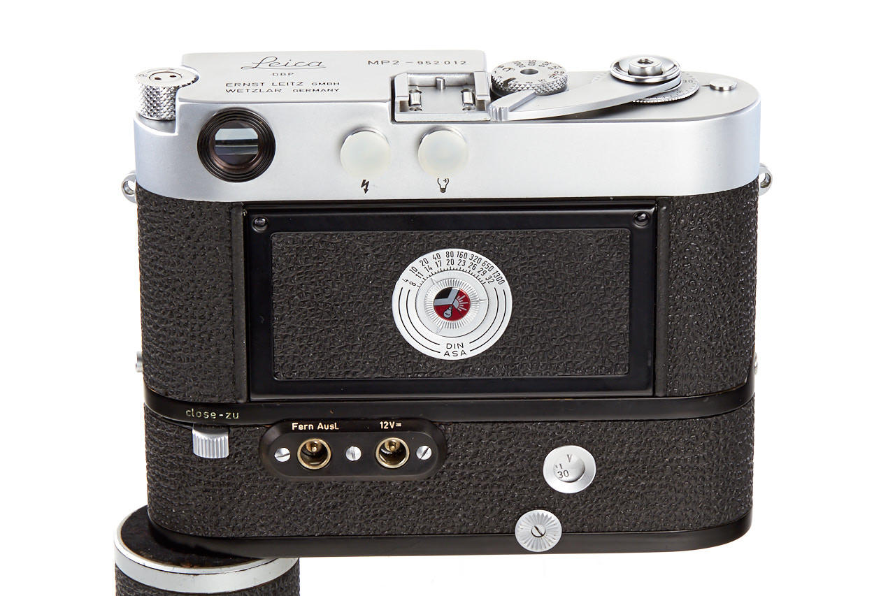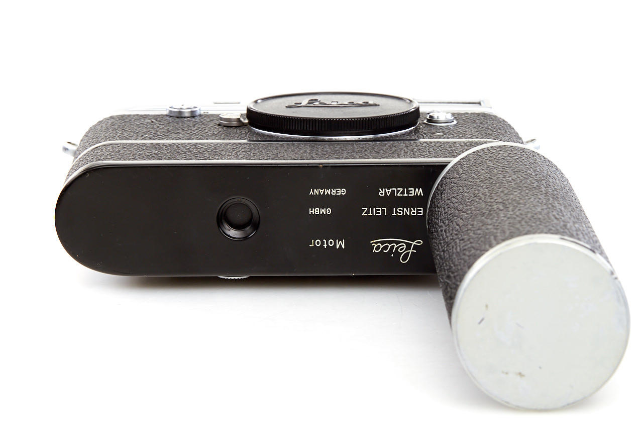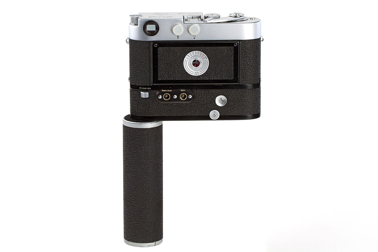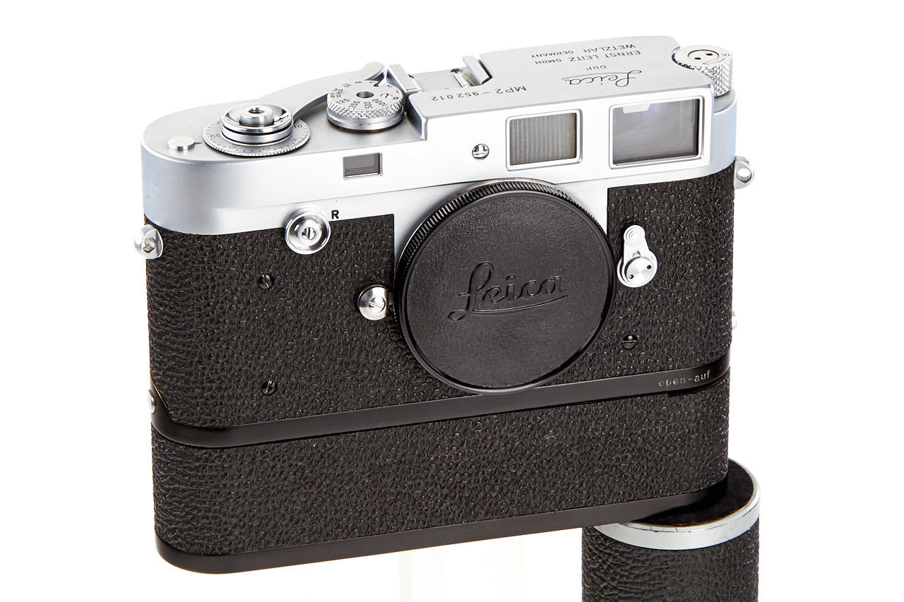 The MP-2 was the first experimental M cameras with electric motor drive built in the late 1950's, Only 21 chrome cameras were produced, less than 10 are known to exist with the original electric motor. It comes from the second batch of 15 cameras (nos.952001-952015). This offered camera is in almost new and fully original condition, with matching black Wetzlar electric motor drive and power source handle - for sure one of the most important M camera ever offered in auction ! Illustrated in Lager I page 212, ex Jim Jannard collection !