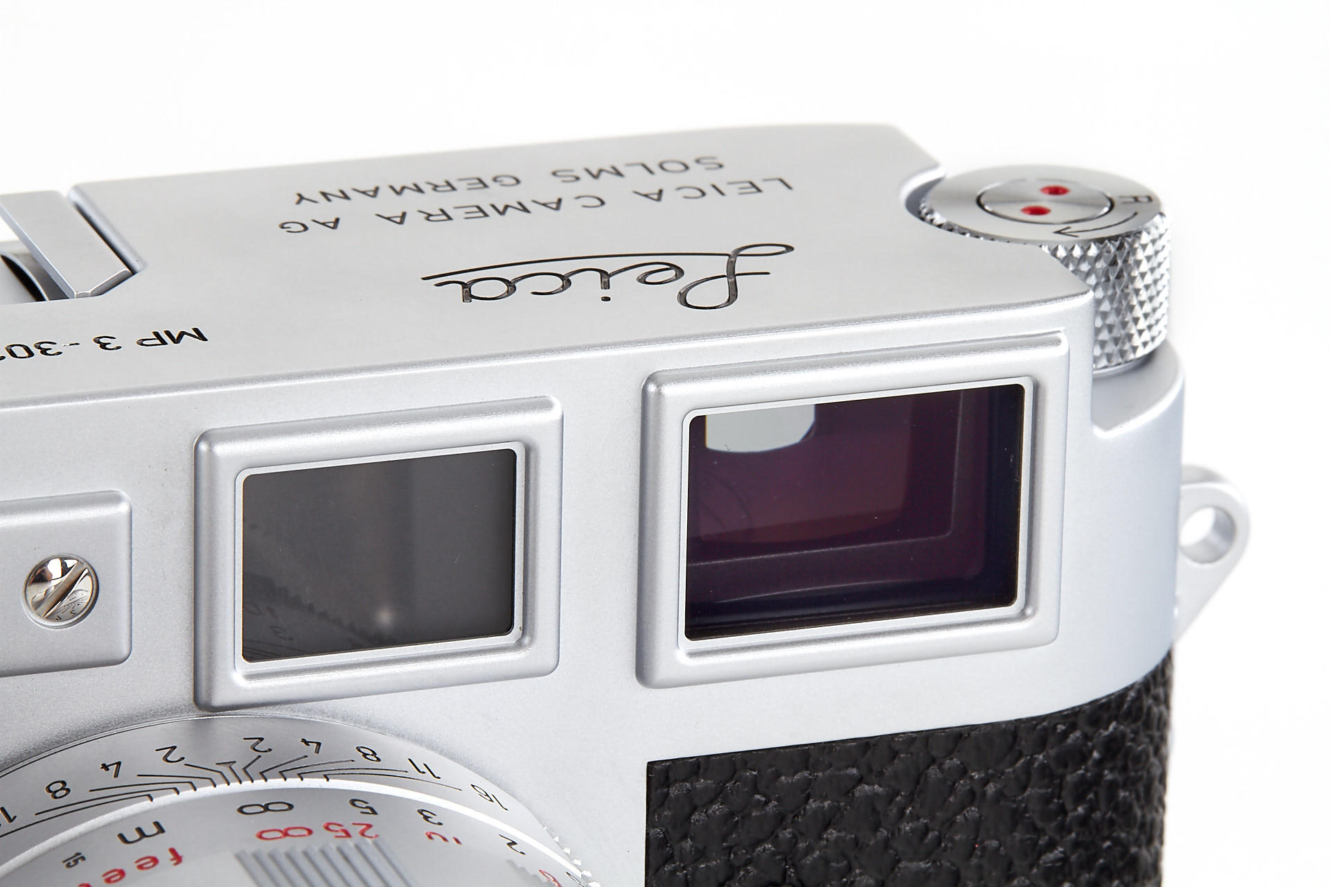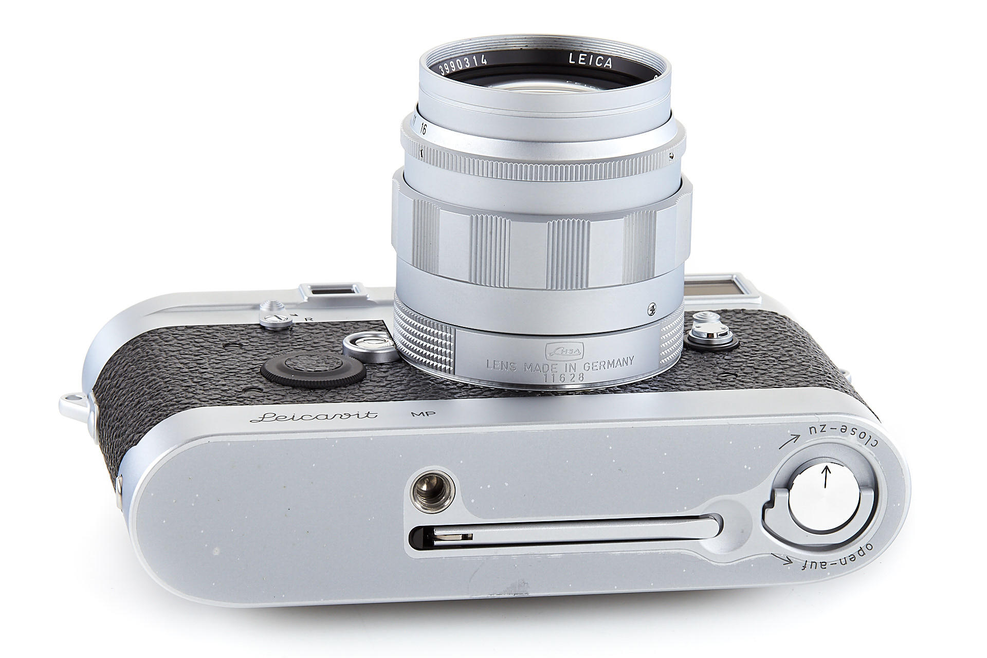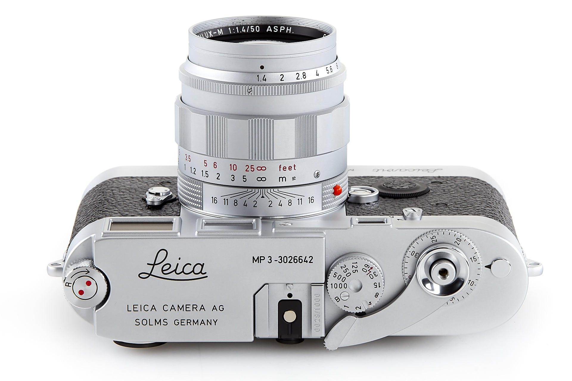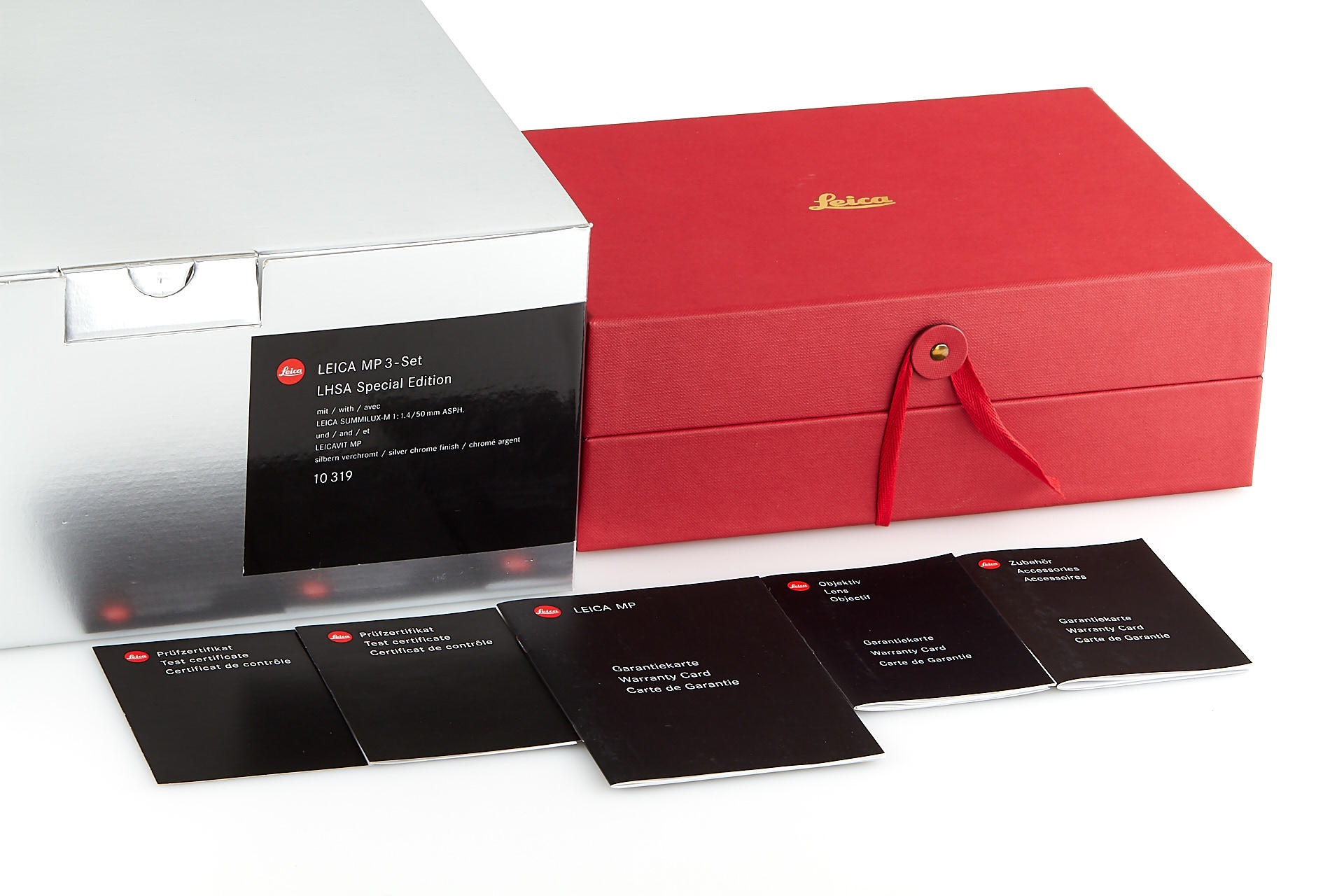 The complete set in new condition, from a limited edition of 500 chrome cameras, with body no.3026642, chrome Summilux-M ASPH. 1.4/50mm no.3990314, Leicavit MP LHSA no.00134 - all in a fitted red presentation box, with all papers and accessories, in maker's box