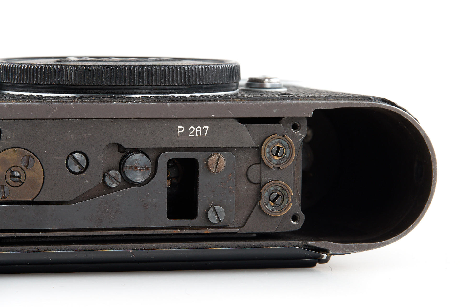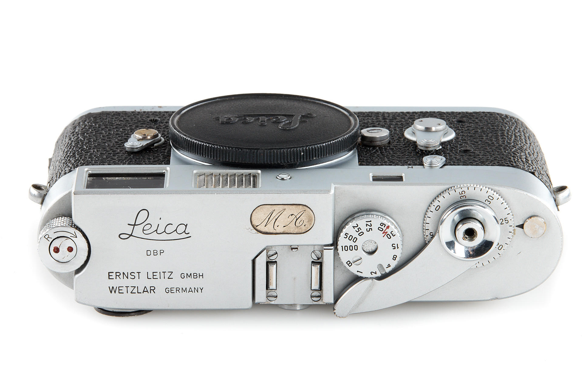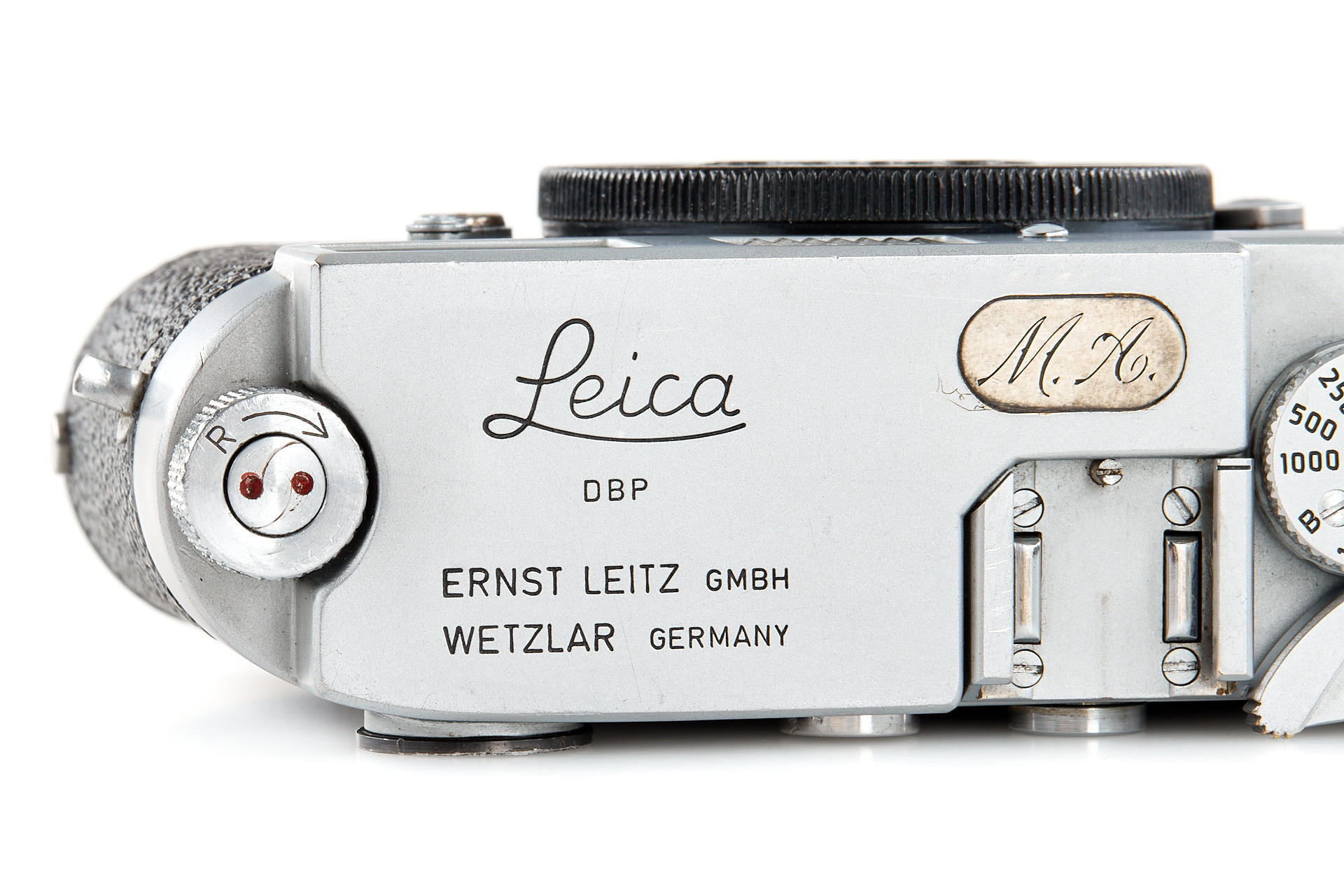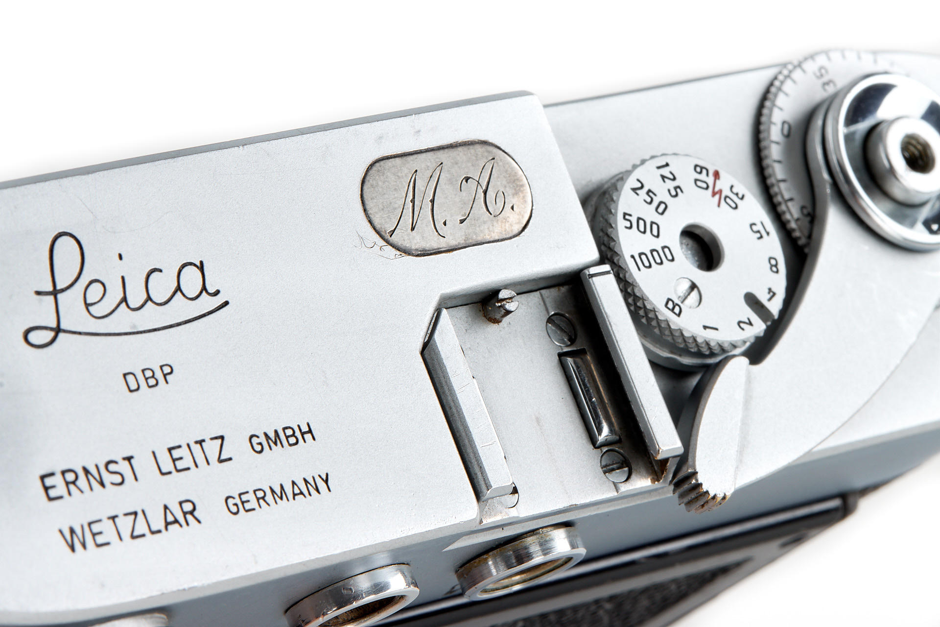 The MP SP was a very rare version of a Leica MP, made exclusively to special order, featuring M2 mechanics with special engraving on the top plate, there is 'P 267' serial number still engraved inside, the number of the top plate has been removed and replaced with a sterling silver plaque with initials 'A.M.'. The camera has been originally delivered to Manca, New York (delivery date 12.08.1957) as a Leica MP chrome and was later converted to a MP SP.