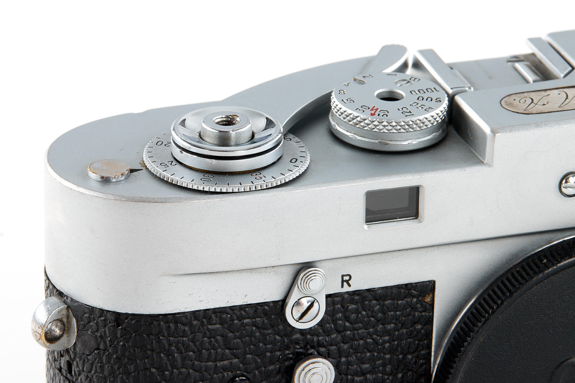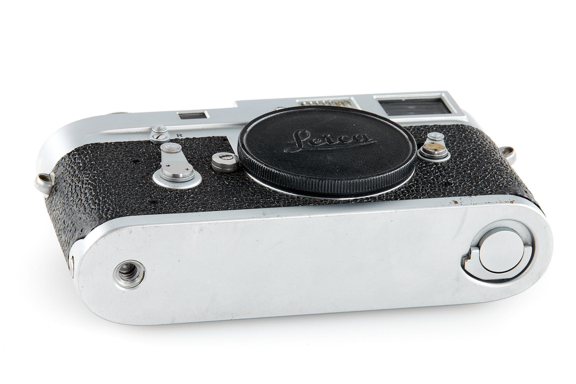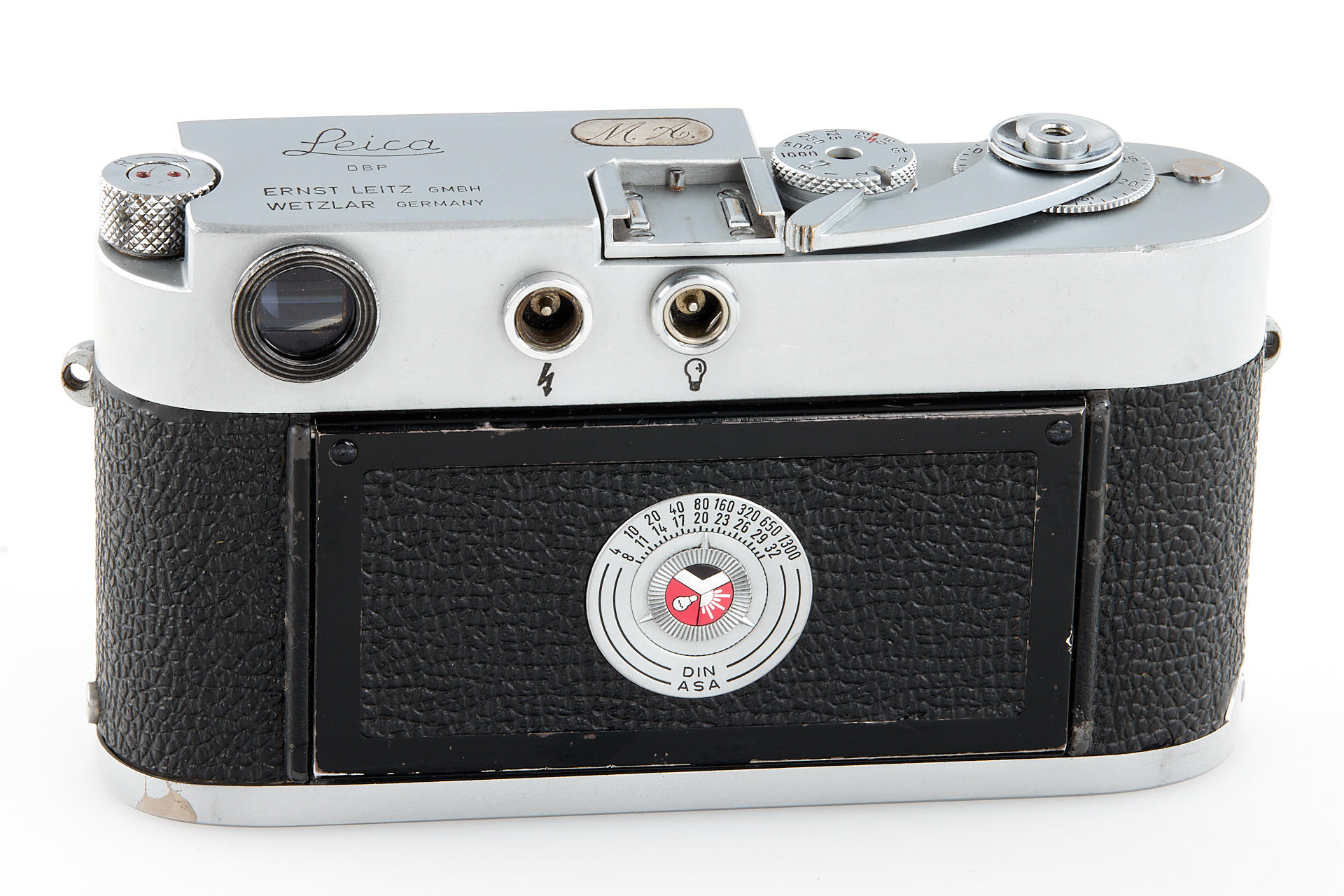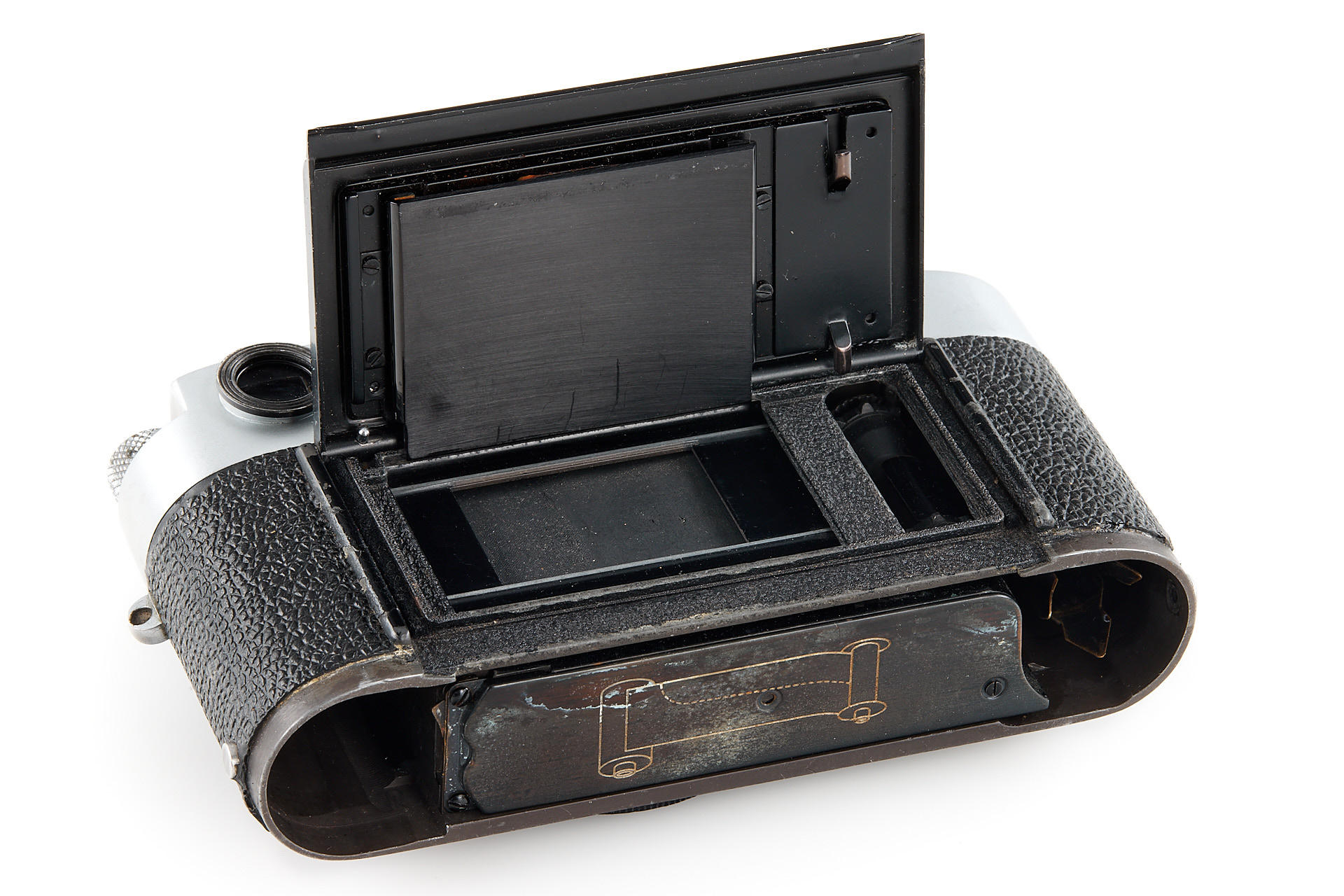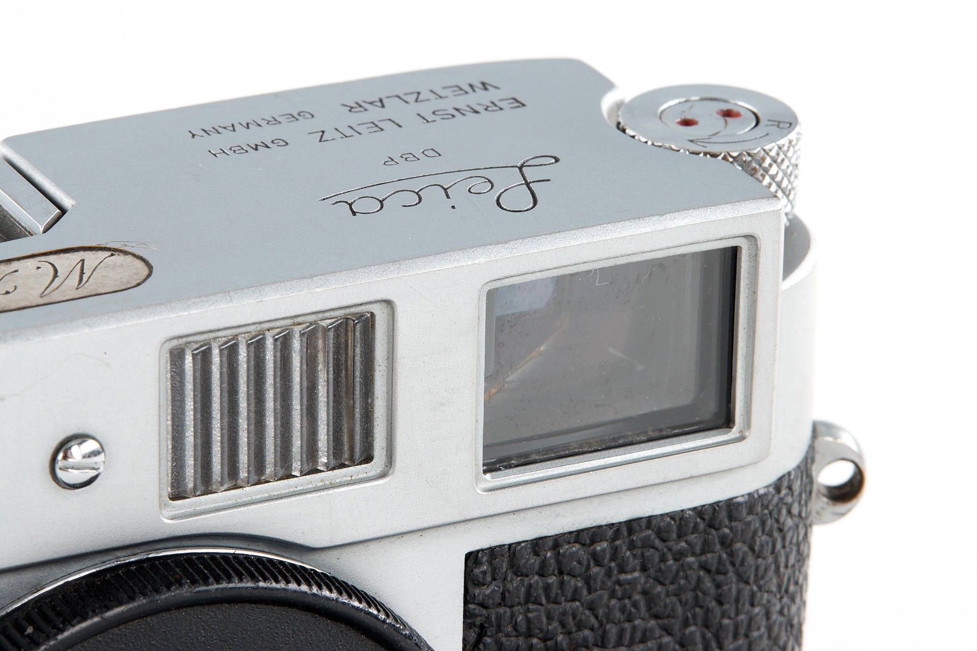 The MP SP was a very rare version of a Leica MP, made exclusively to special order, featuring M2 mechanics with special engraving on the top plate, there is 'P 267' serial number still engraved inside, the number of the top plate has been removed and replaced with a sterling silver plaque with initials 'A.M.'. The camera has been originally delivered to Manca, New York (delivery date 12.08.1957) as a Leica MP chrome and was later converted to a MP SP.