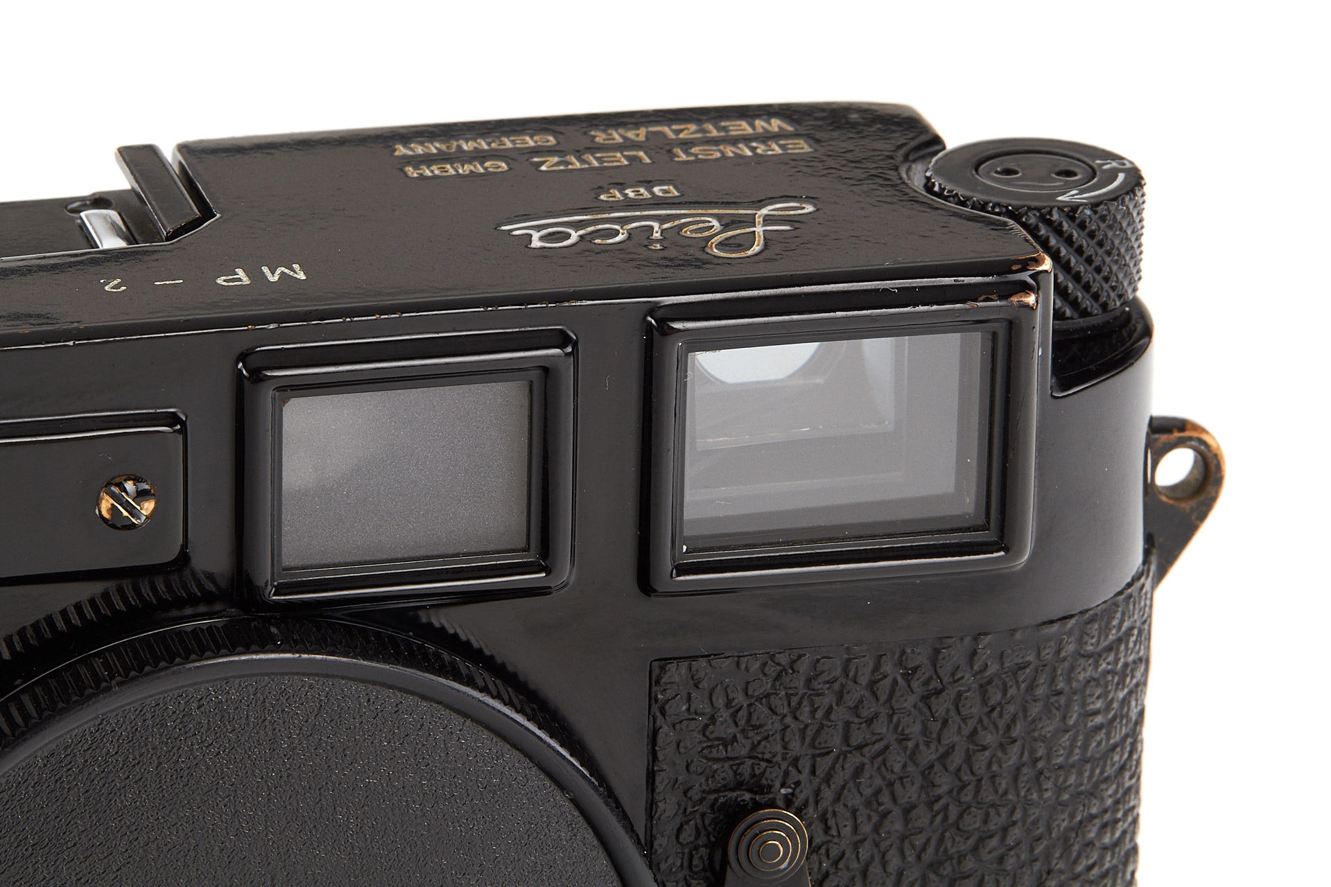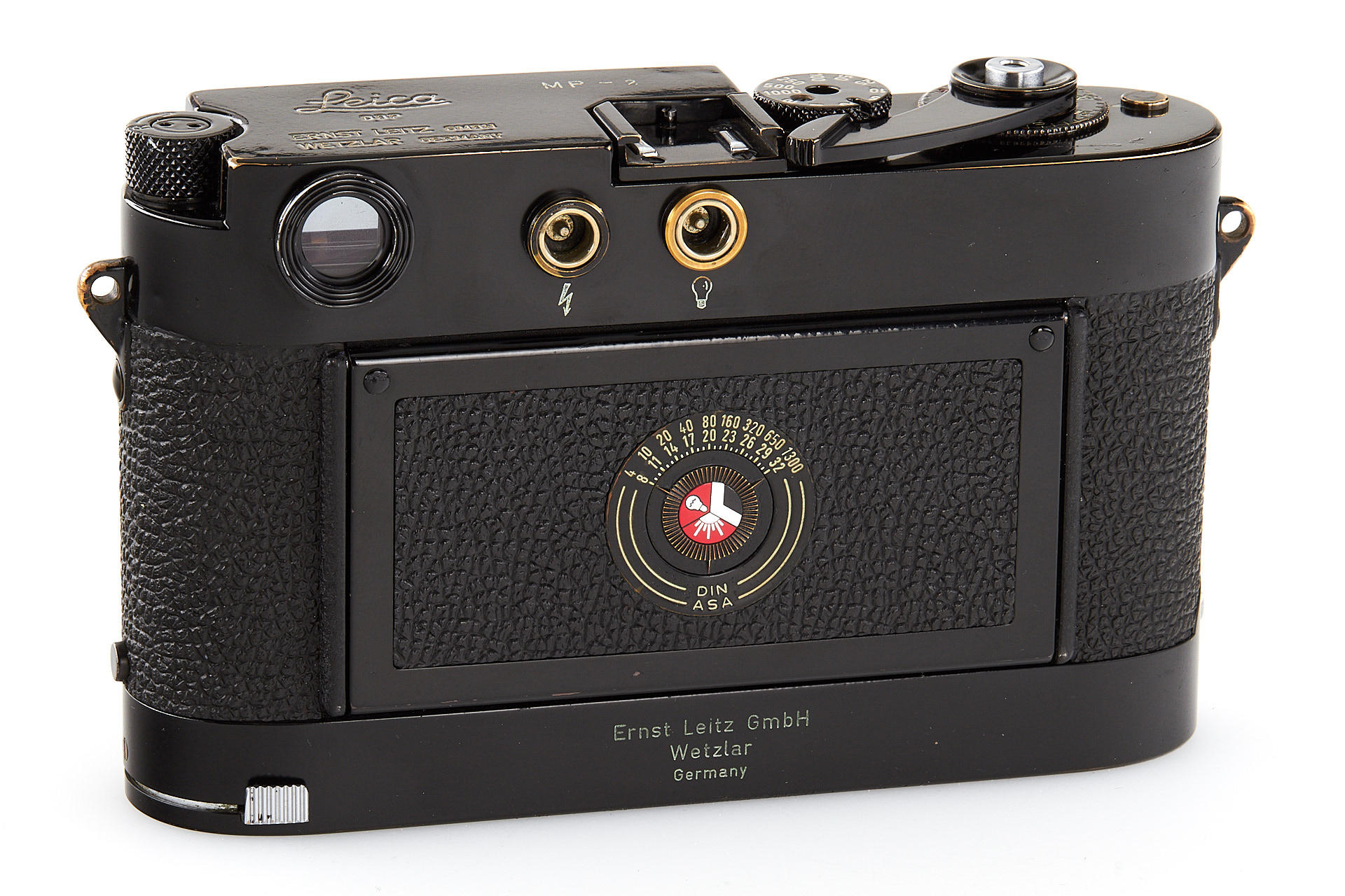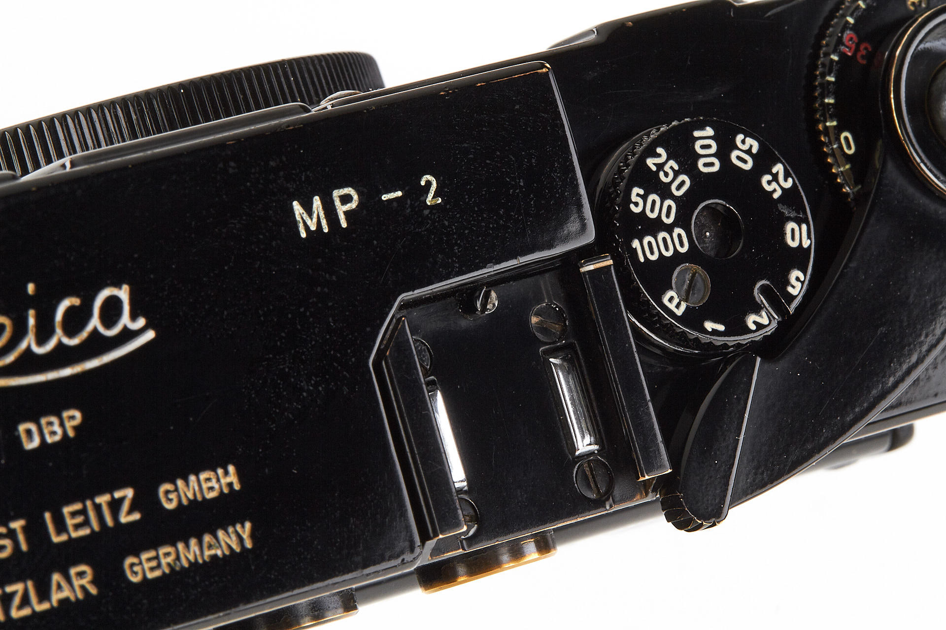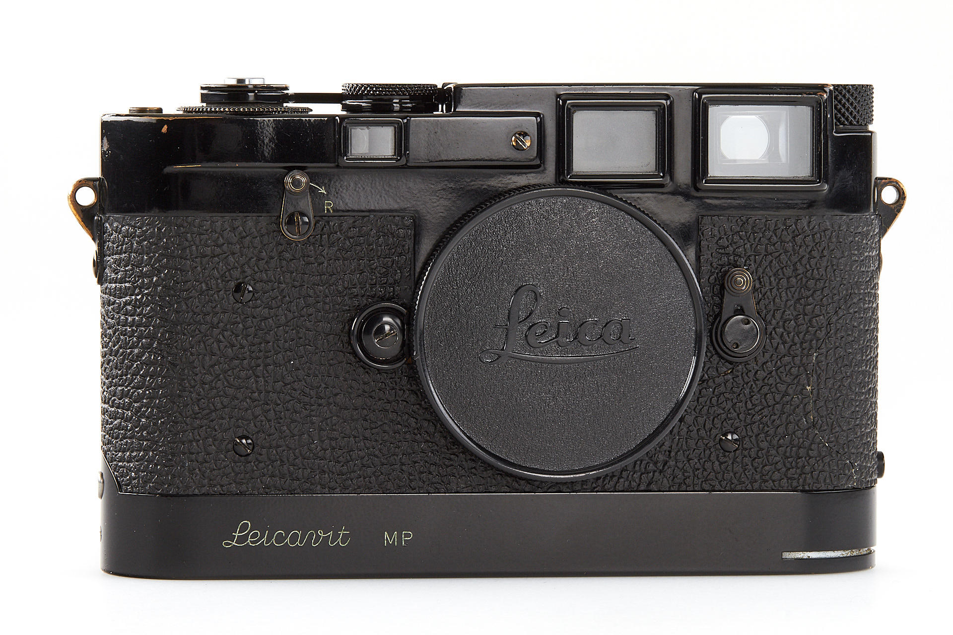 It was at the “Photokina” fair in Cologne in 1956 when the new Leica MP was introduced to the public. It was much more than a mere variation of the Leica M3. It was the only serial model which has an individual number, differing fundamentally from the usual fabrication numbers of all other Leica cameras. With a total number of only 412 units produced, the MP is among the rarest Leica models of all time. The black-paint version was produced only 141 times and acquired mainly by professional photographers. Many of the famous Magnum photographers used MP cameras. Today it is among the most sought-after Leicas of all. The idea which led to the production of the MP model came from several well-known American press photographers, who wanted to make use of the advantages of the Leicavit (available at that time for IIIf only) on their Leica M cameras as well. It was mainly the suggestion of Alfred Eisenstaedt and David Douglas Duncan which aroused the interest of Dr. Ludwig Leitz, who was the director of the development and construction department in 1955. The camera offered here is the second Leica MP ever made and the first one in black finish. It is in beautiful condition, with only minimal signs of use around the edges. During a service at Leitz it has received a later type back door (black paint), a quick film loading system and coupling for the New York electric motor drive (a very unusual upgrade!). The camera has been initially delivered to New York press photographer Bob Schwalberg (delivery date 08.10.1956). It comes with a Leicavit MP in black paint finish (with a Bob Schwalberg sticker inside). The camera is also included in Hasbroeck's '150 Classic Cameras' on pages 172-173. Included is a written expertise from Ottmar Michaely. It is one of the most important Leica cameras made. And probably the one that started the trend of black paint M cameras being used by professionals and loved by collectors nowadays.