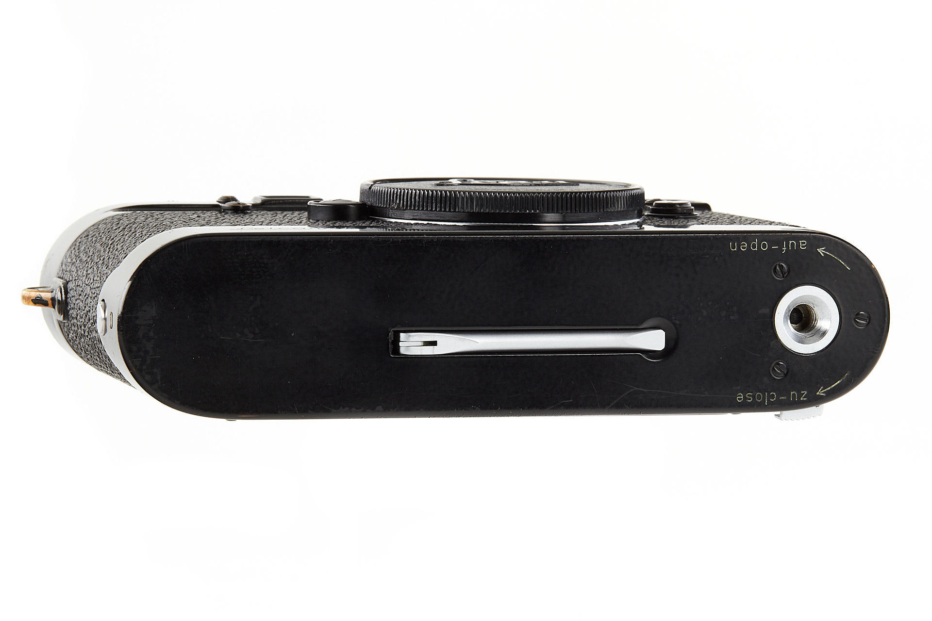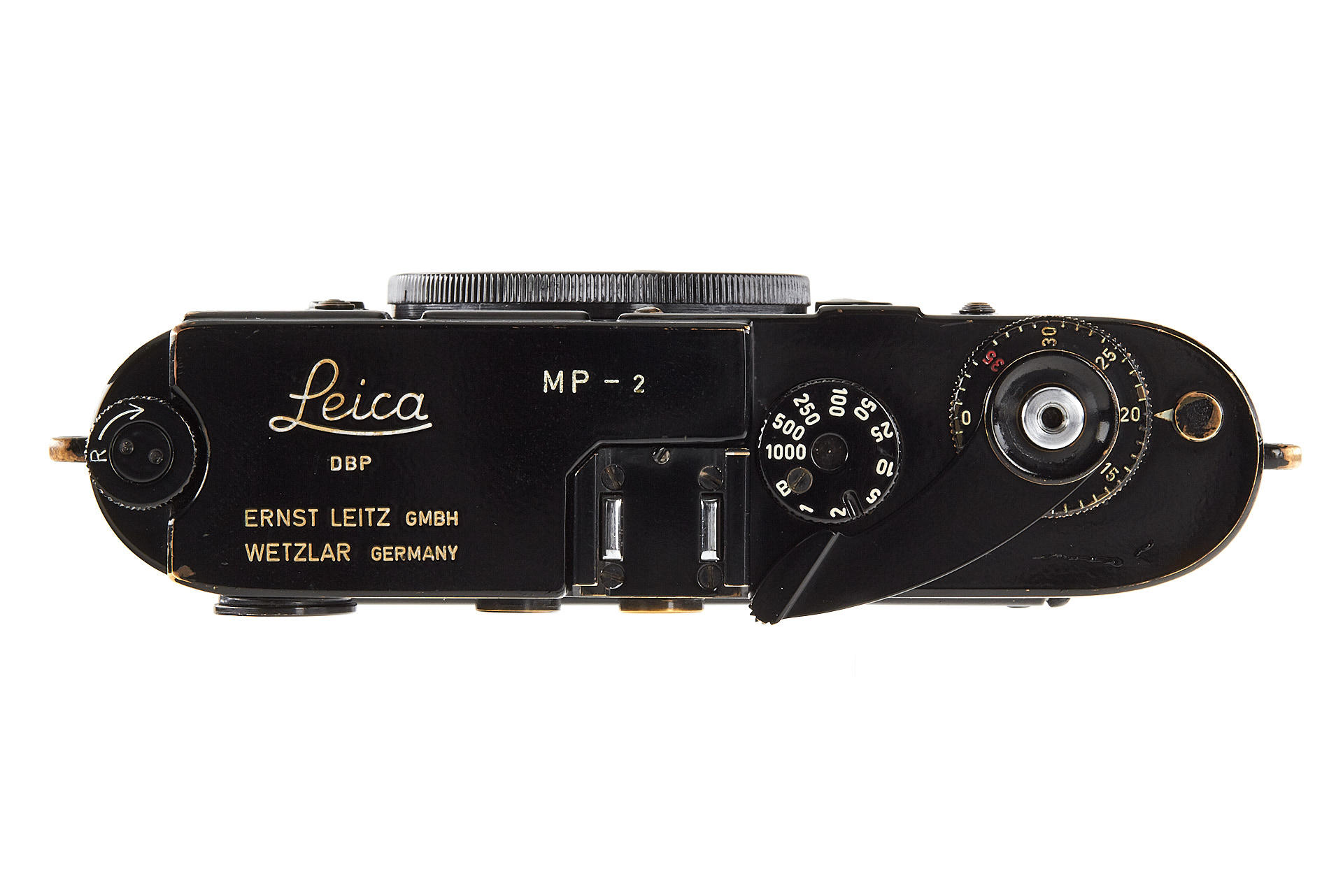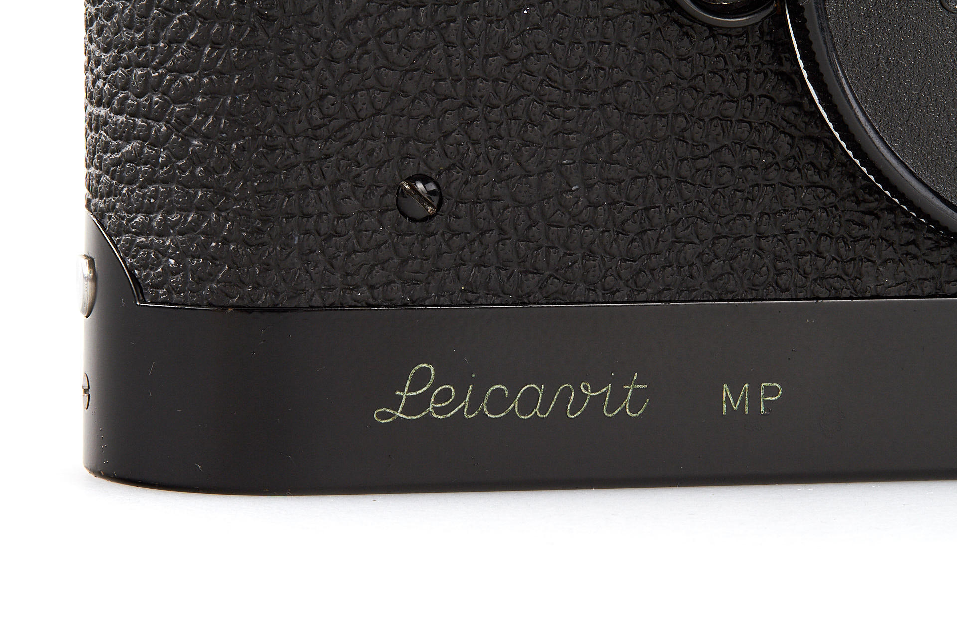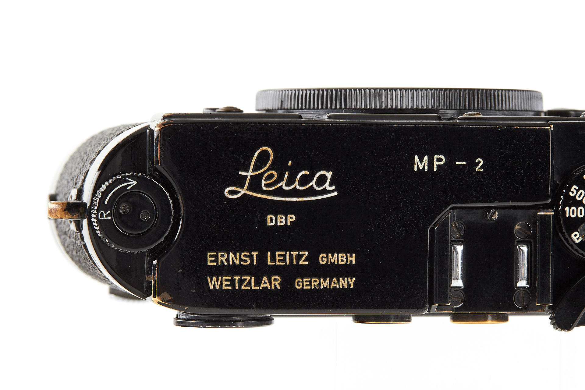 It was at the “Photokina” fair in Cologne in 1956 when the new Leica MP was introduced to the public. It was much more than a mere variation of the Leica M3. It was the only serial model which has an individual number, differing fundamentally from the usual fabrication numbers of all other Leica cameras. With a total number of only 412 units produced, the MP is among the rarest Leica models of all time. The black-paint version was produced only 141 times and acquired mainly by professional photographers. Many of the famous Magnum photographers used MP cameras. Today it is among the most sought-after Leicas of all. The idea which led to the production of the MP model came from several well-known American press photographers, who wanted to make use of the advantages of the Leicavit (available at that time for IIIf only) on their Leica M cameras as well. It was mainly the suggestion of Alfred Eisenstaedt and David Douglas Duncan which aroused the interest of Dr. Ludwig Leitz, who was the director of the development and construction department in 1955. The camera offered here is the second Leica MP ever made and the first one in black finish. It is in beautiful condition, with only minimal signs of use around the edges. During a service at Leitz it has received a later type back door (black paint), a quick film loading system and coupling for the New York electric motor drive (a very unusual upgrade!). The camera has been initially delivered to New York press photographer Bob Schwalberg (delivery date 08.10.1956). It comes with a Leicavit MP in black paint finish (with a Bob Schwalberg sticker inside). The camera is also included in Hasbroeck's '150 Classic Cameras' on pages 172-173. Included is a written expertise from Ottmar Michaely. It is one of the most important Leica cameras made. And probably the one that started the trend of black paint M cameras being used by professionals and loved by collectors nowadays.