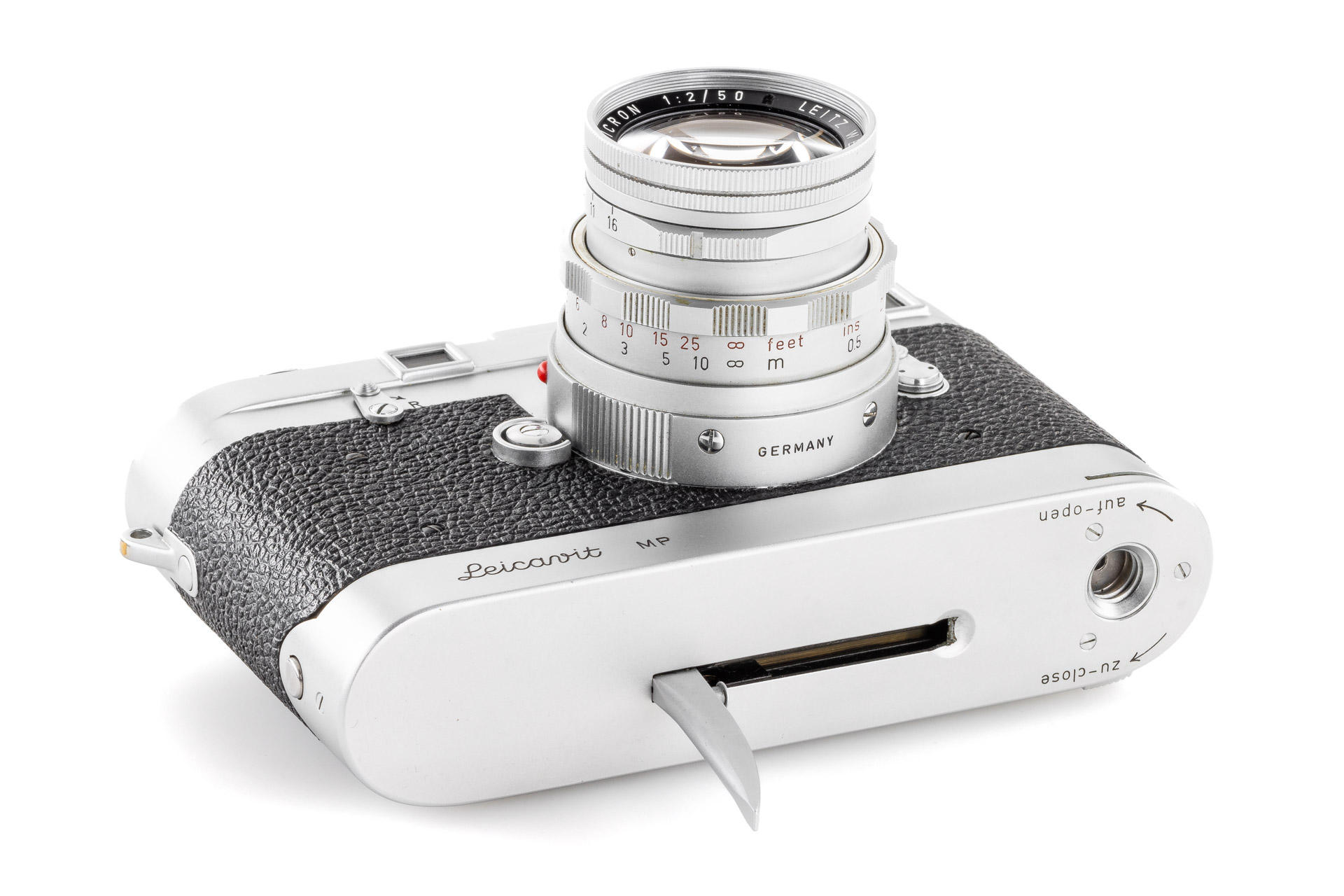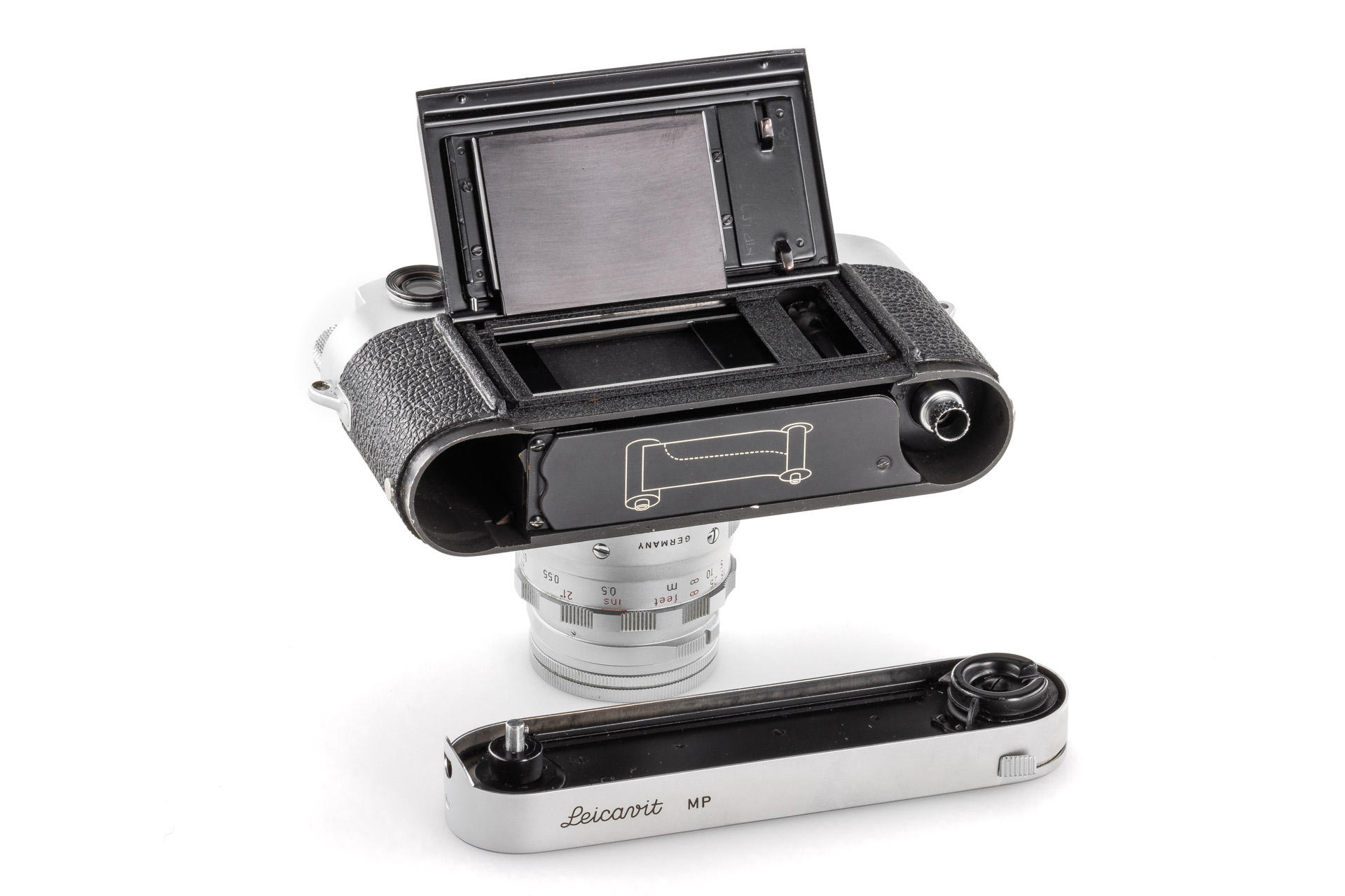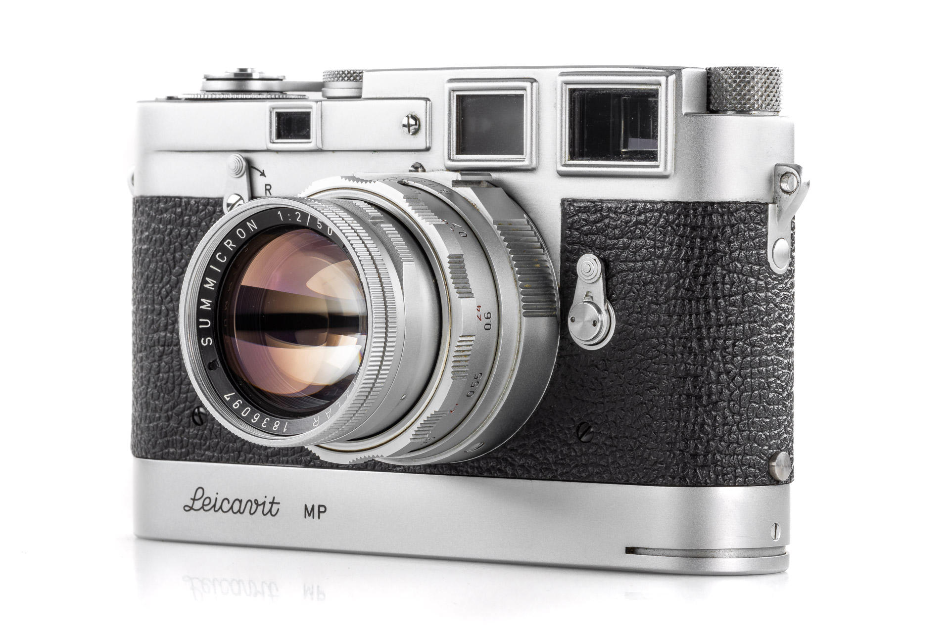 Original Leica MP in beautiful condition, dual stroke, with proper engraving inside 'P 157', comes with a chrome Leicavit MP. It has been initially delivered to Caracas on 29.07.1957 (codename 'IMOOP' = Leica MP with Leicavit-Base). Both camera and Leicavit in beautiful working condition, also included in this lot is a dual range Summicron 2/50mm no.1836097. The original Leica MP is one of the major rarities in the Leica world. The chassis of the camera was shown in the Lager 'Cameras' on page 194.