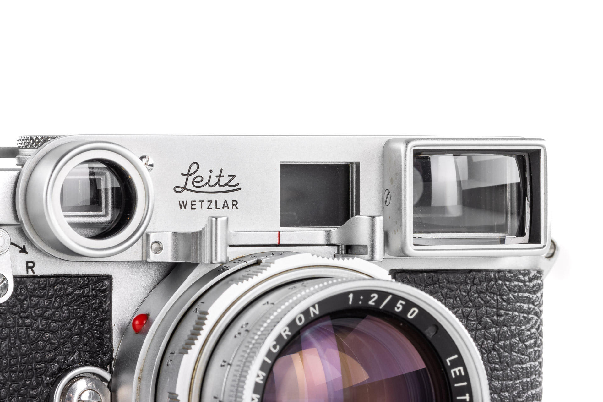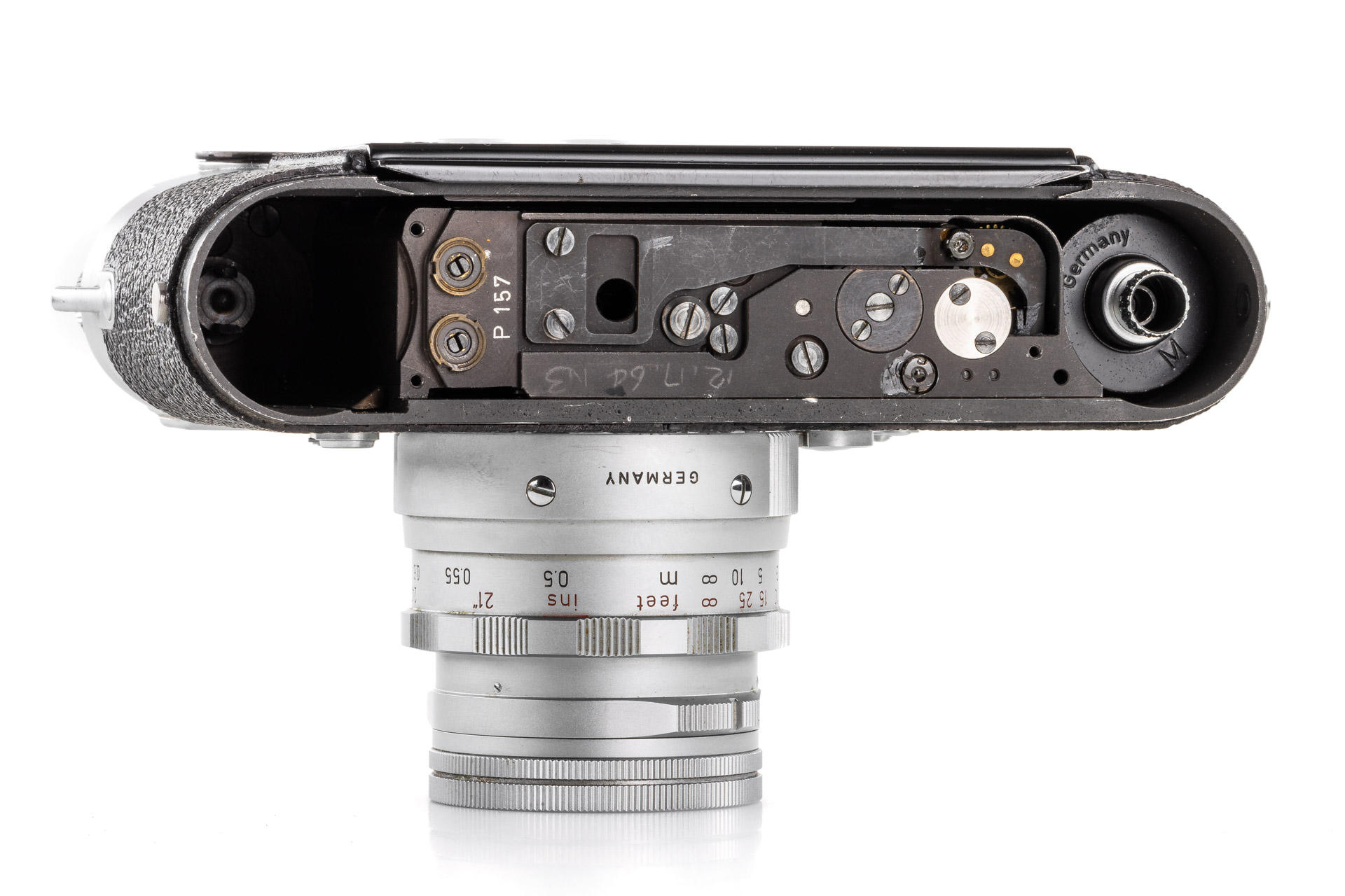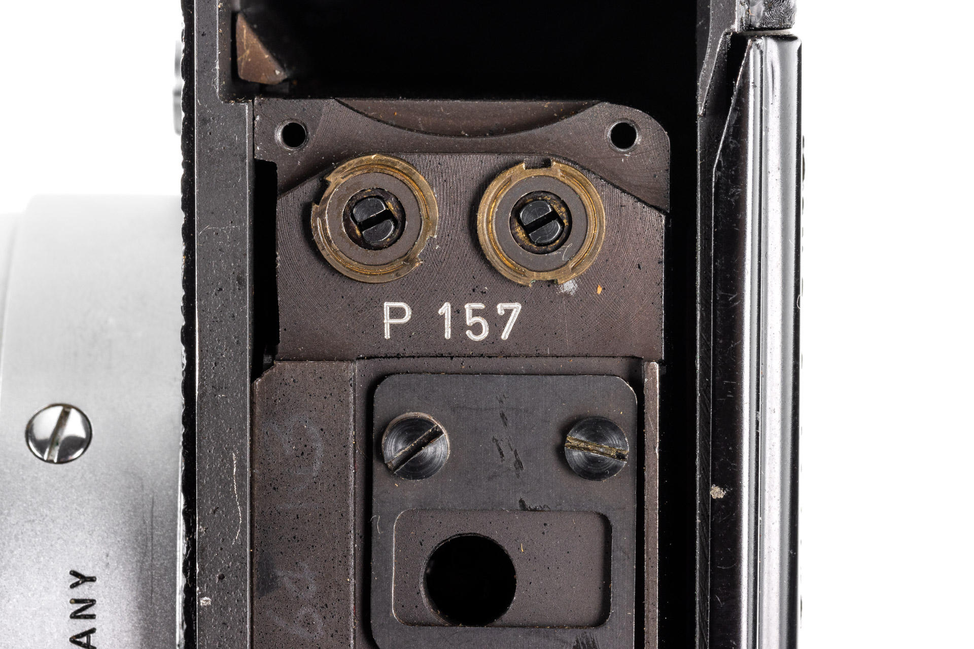 Original Leica MP in beautiful condition, dual stroke, with proper engraving inside 'P 157', comes with a chrome Leicavit MP. It has been initially delivered to Caracas on 29.07.1957 (codename 'IMOOP' = Leica MP with Leicavit-Base). Both camera and Leicavit in beautiful working condition, also included in this lot is a dual range Summicron 2/50mm no.1836097. The original Leica MP is one of the major rarities in the Leica world. The chassis of the camera was shown in the Lager 'Cameras' on page 194.