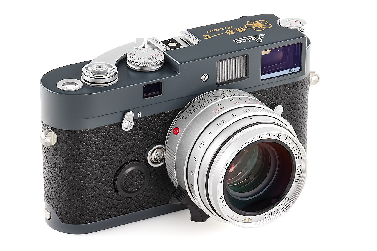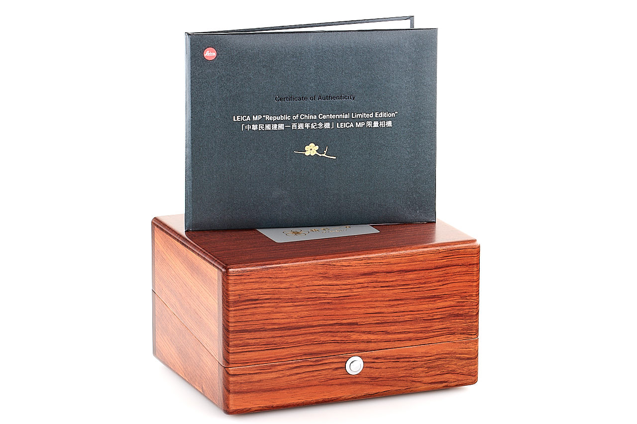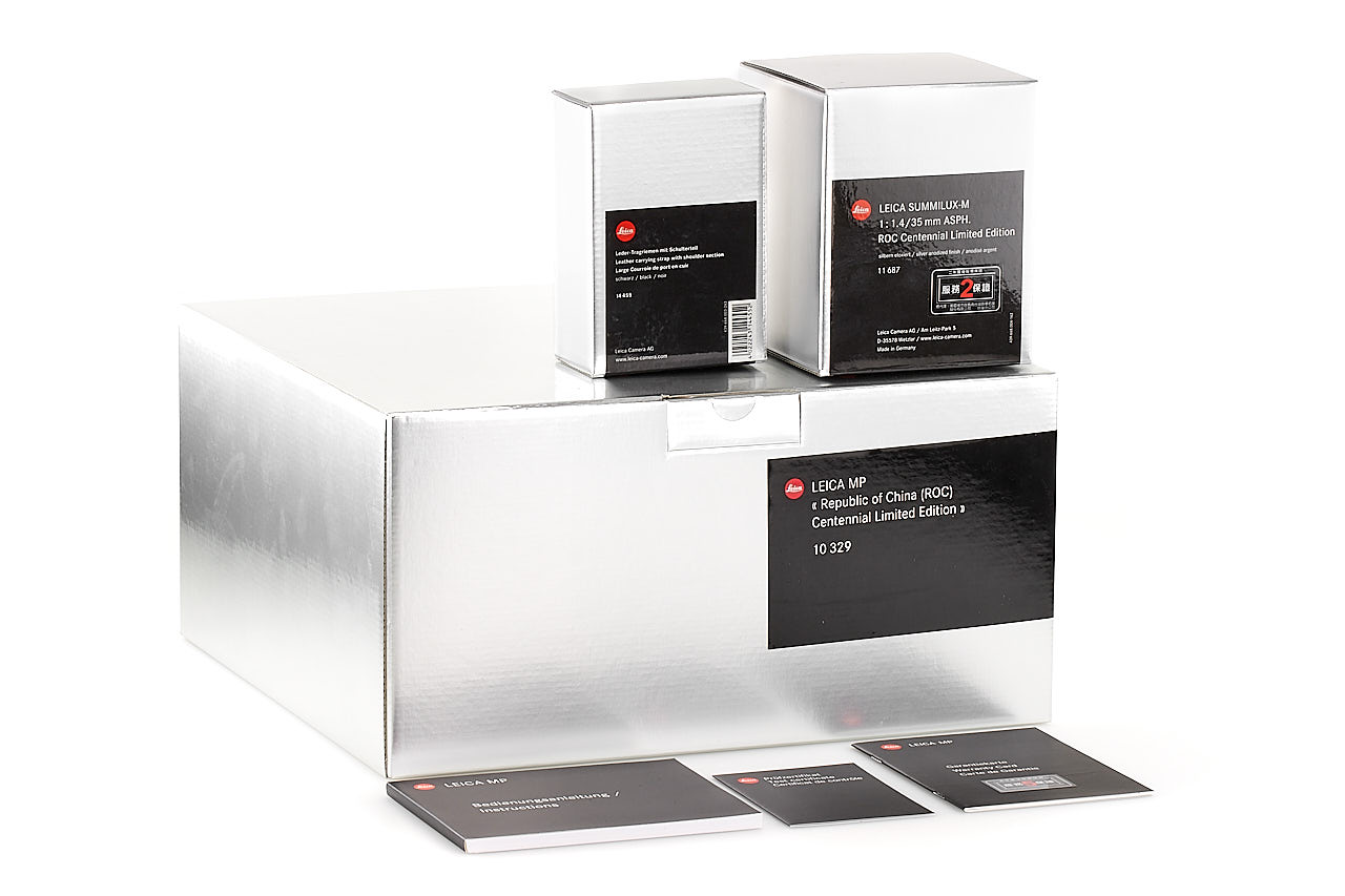 On the occasion of the Republic of China Centennial in 2012, Leica Camera AG produced 100 examples of special Leica MP, finished in gray (colour inspired by the famous Leica M2 gray), and engraved with plum blossom on the top plate. The offered set is in mint, unused condition and includes a body no.4414470 with matching Summilux -M 1.4/35mm ASPH. no.4320395 (matching special number 070/100, engraved with the plum blossom on the hood), complete with all papers accessories and boxes. It is, for sure one of the most attractive modern Leica editions.
