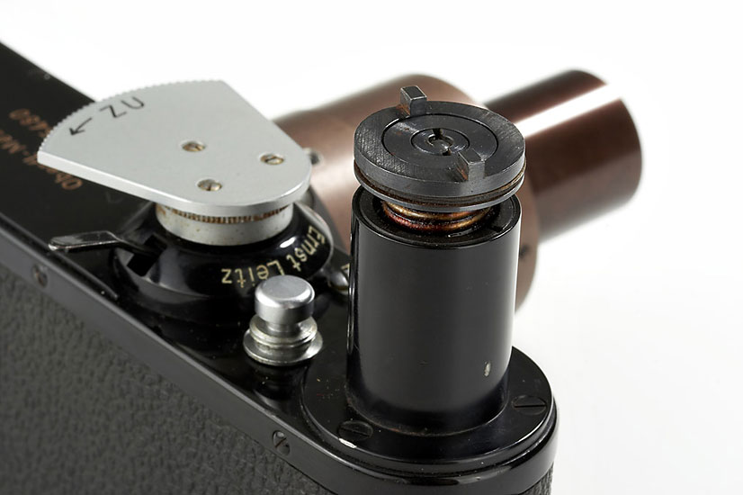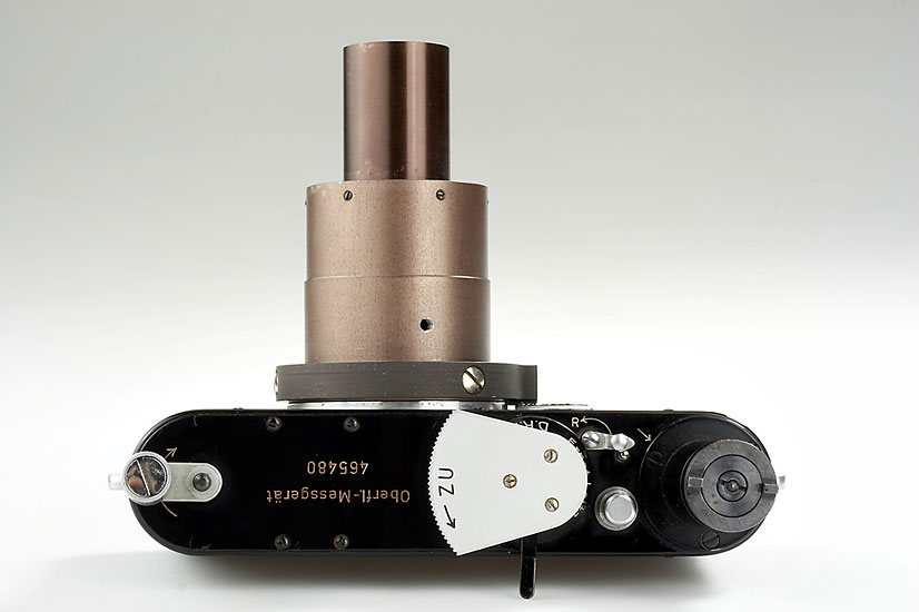 Leitz special scientific camera body, used for Leitz/Forster Oberflächenmessgerät, a surface measuring instrument. Film was wound through the camera at opened shutter, while light from the 'Oberflächenmessgerät' projected a magnified image of a mechanically crafted surface in order to show an enlarged "curve" of the surface irregulations horizontally on the film, extremely rare camera in fine condition