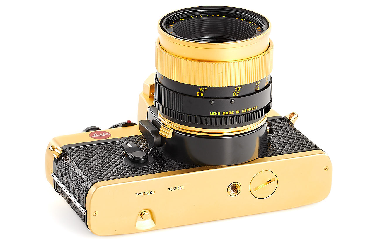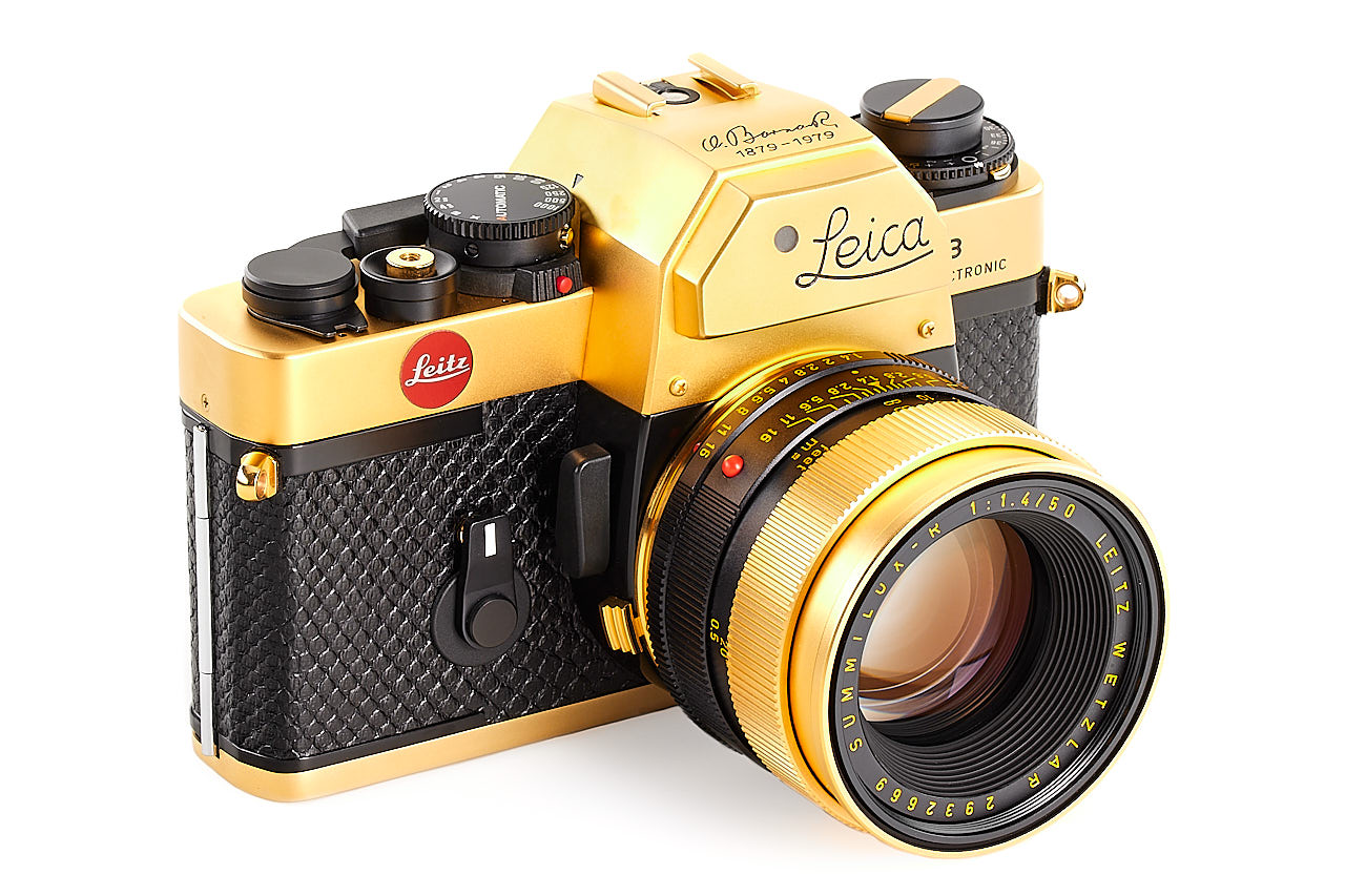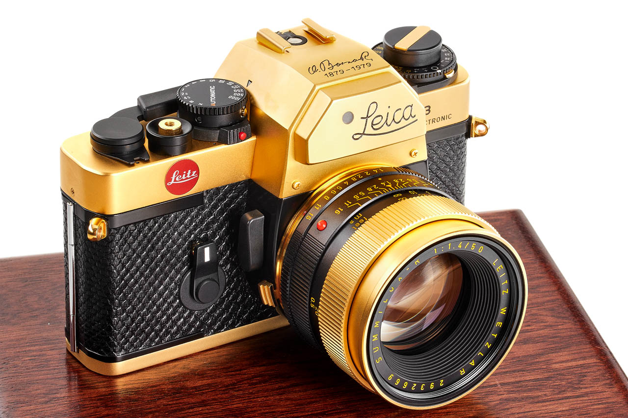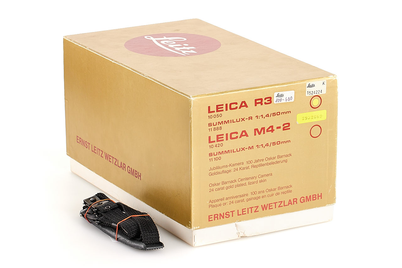 24 carats gold-plated R3, 1000 pieces produced for the 100th anniversary of the birth of the inventor of the Leica, Oskar Barnack, body no.1524224 with special number 100-680 engraved on the top plate, in unused condition, together with gold-plated Summilux-R 1.4/50mm no.2932669, with all caps, strap, papers and instructions, wooden presentation box and matching maker's box.