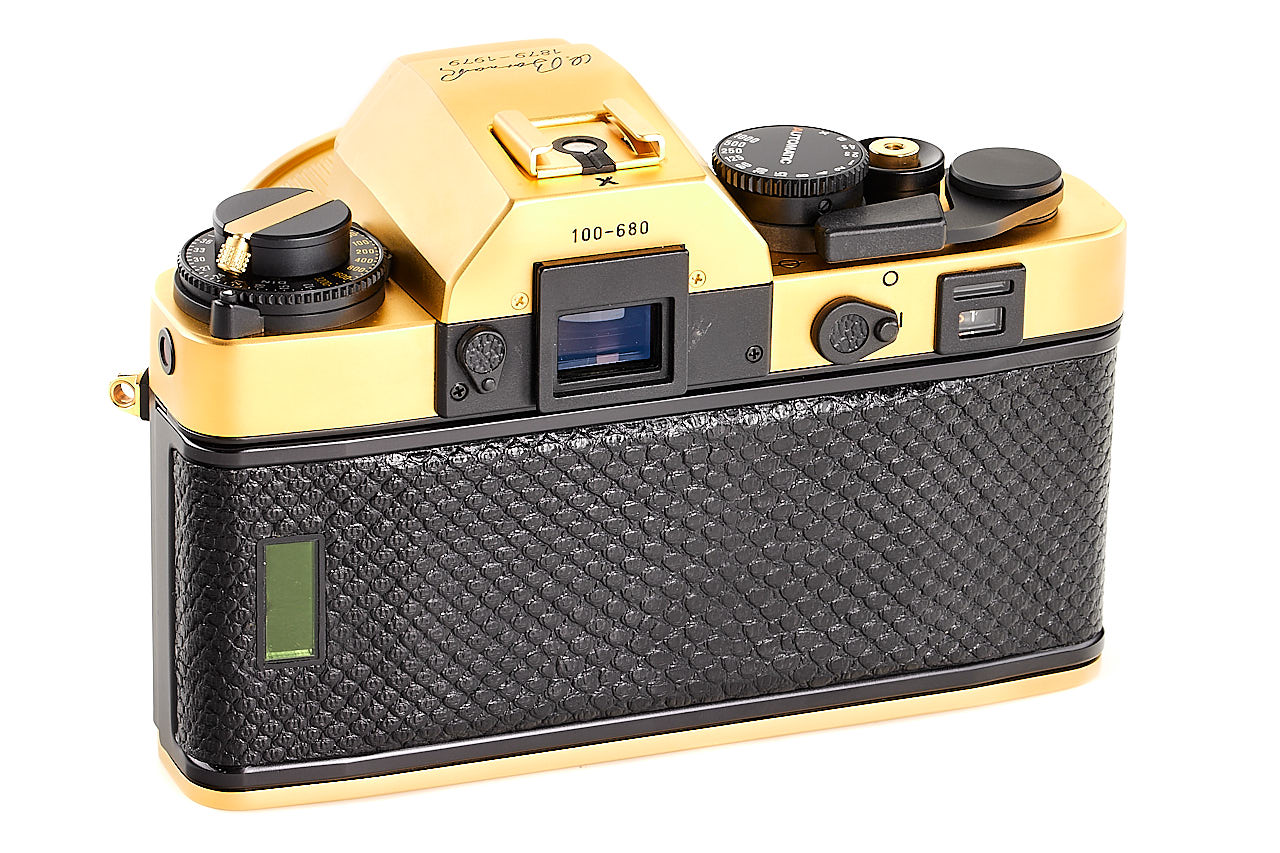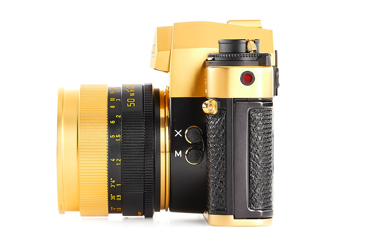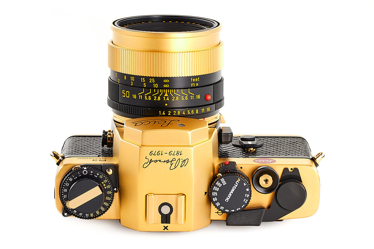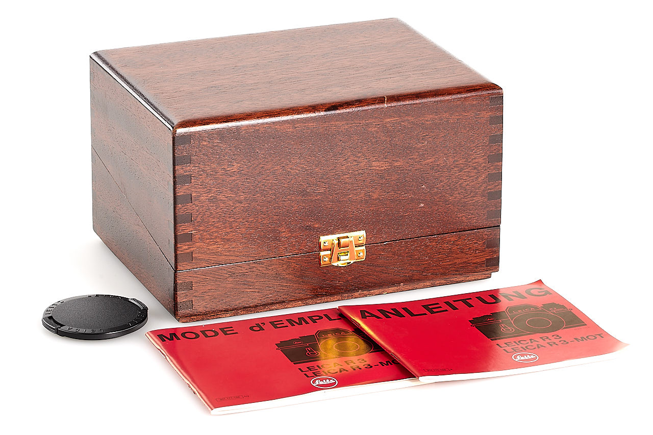 24 carats gold-plated R3, 1000 pieces produced for the 100th anniversary of the birth of the inventor of the Leica, Oskar Barnack, body no.1524224 with special number 100-680 engraved on the top plate, in unused condition, together with gold-plated Summilux-R 1.4/50mm no.2932669, with all caps, strap, papers and instructions, wooden presentation box and matching maker's box.