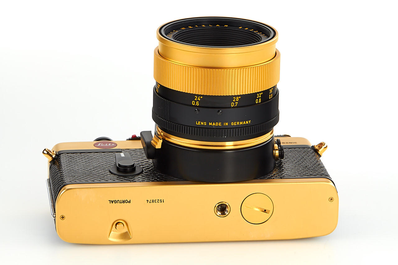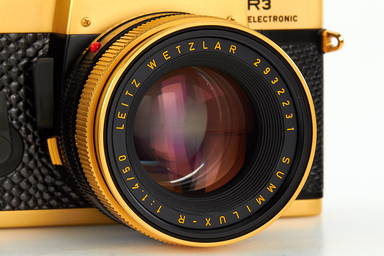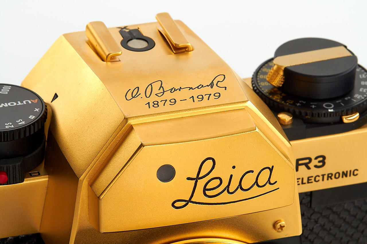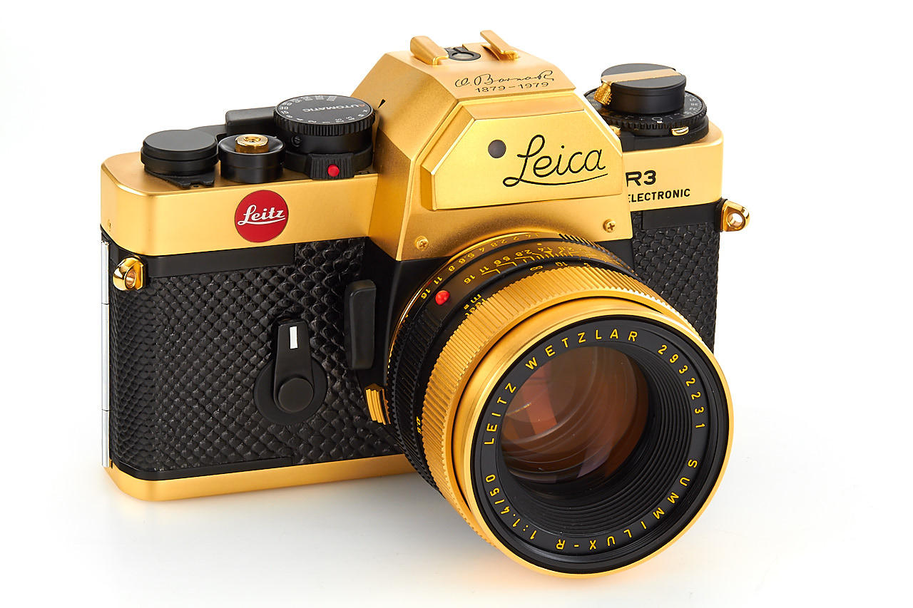 near mint 24 carat gold-plated R3 issued for the 100th anniversary of birth of the inventor of the Leica, Oskar Barnack, body no.1523874, gold-plated Summilux-R 1.4/50mm no.2932231, wooden presentation box