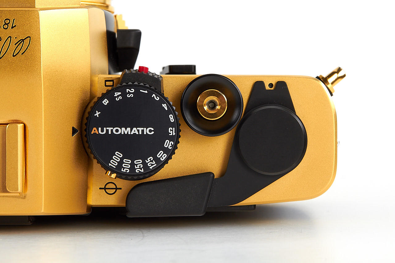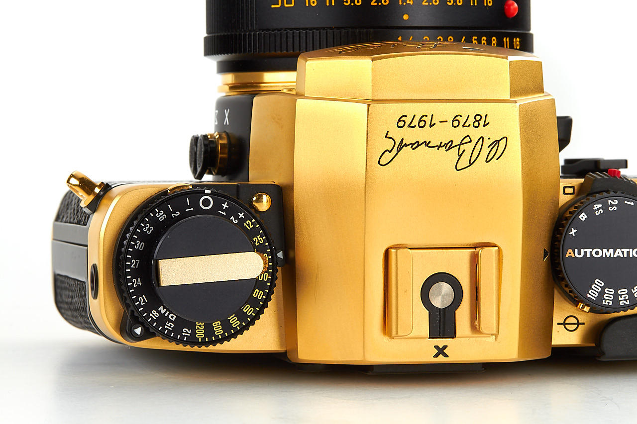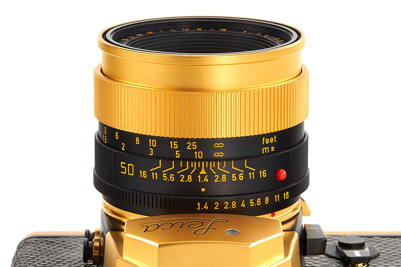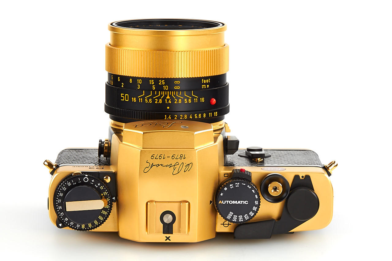 near mint 24 carat gold-plated R3 issued for the 100th anniversary of birth of the inventor of the Leica, Oskar Barnack, body no.1523874, gold-plated Summilux-R 1.4/50mm no.2932231, wooden presentation box