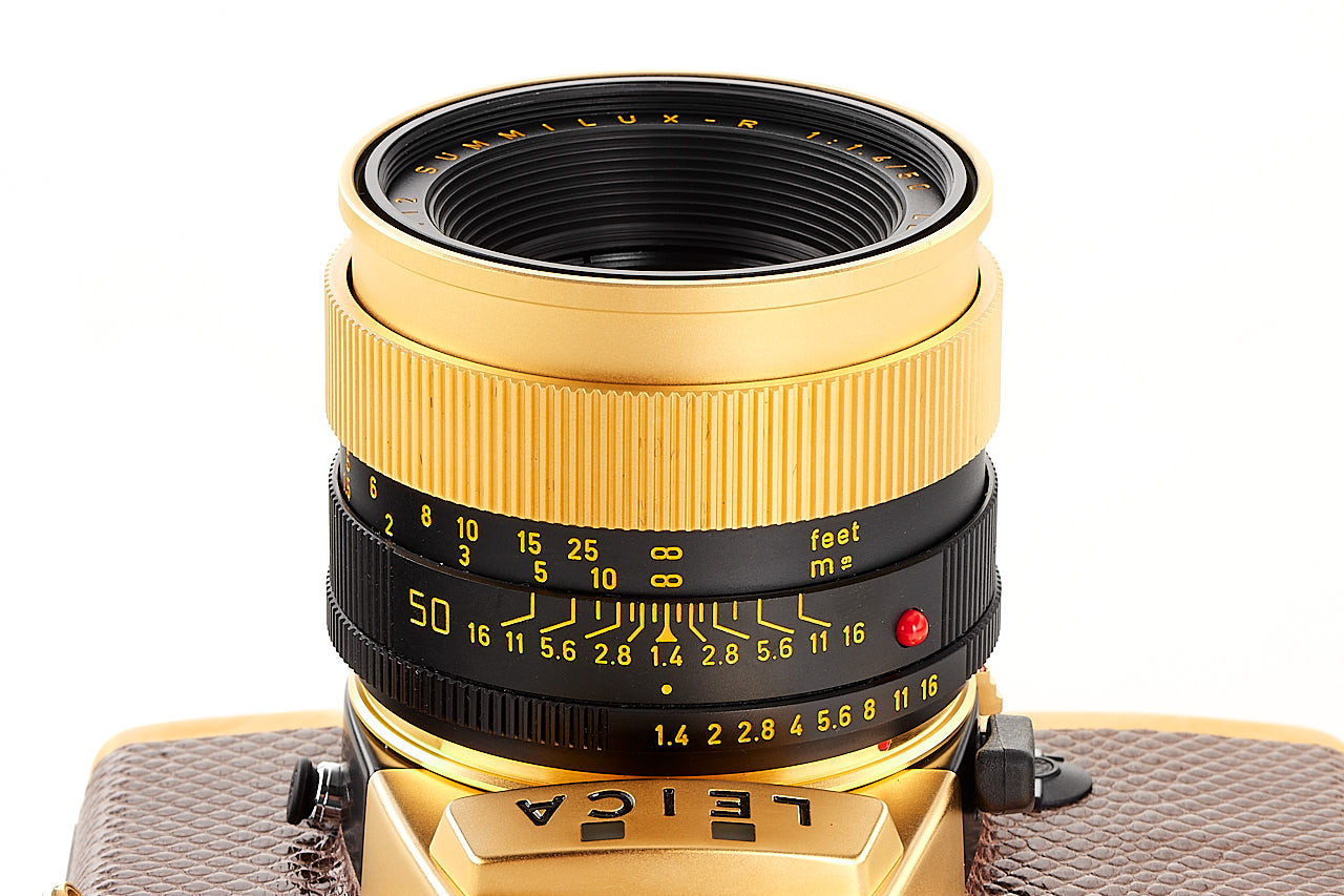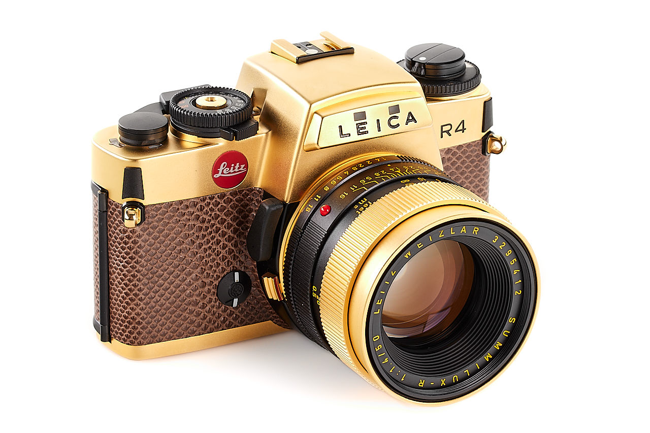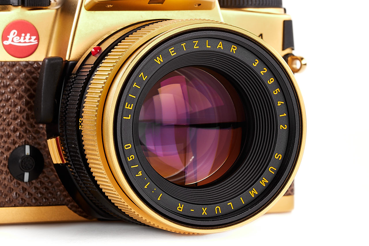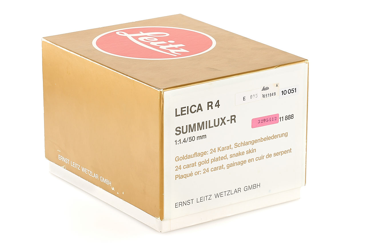 Limited edition gold plated Leica R4 (1000 pieces) with lizard skin covering, in unused condition, body no.1651949 with a golden plate on the back door engraved with 'E 095', together a with matching gold plated Summilux-R 1.4/50mm no.3295412, with front lens cap, strap, wooden presentation box and maker's box.