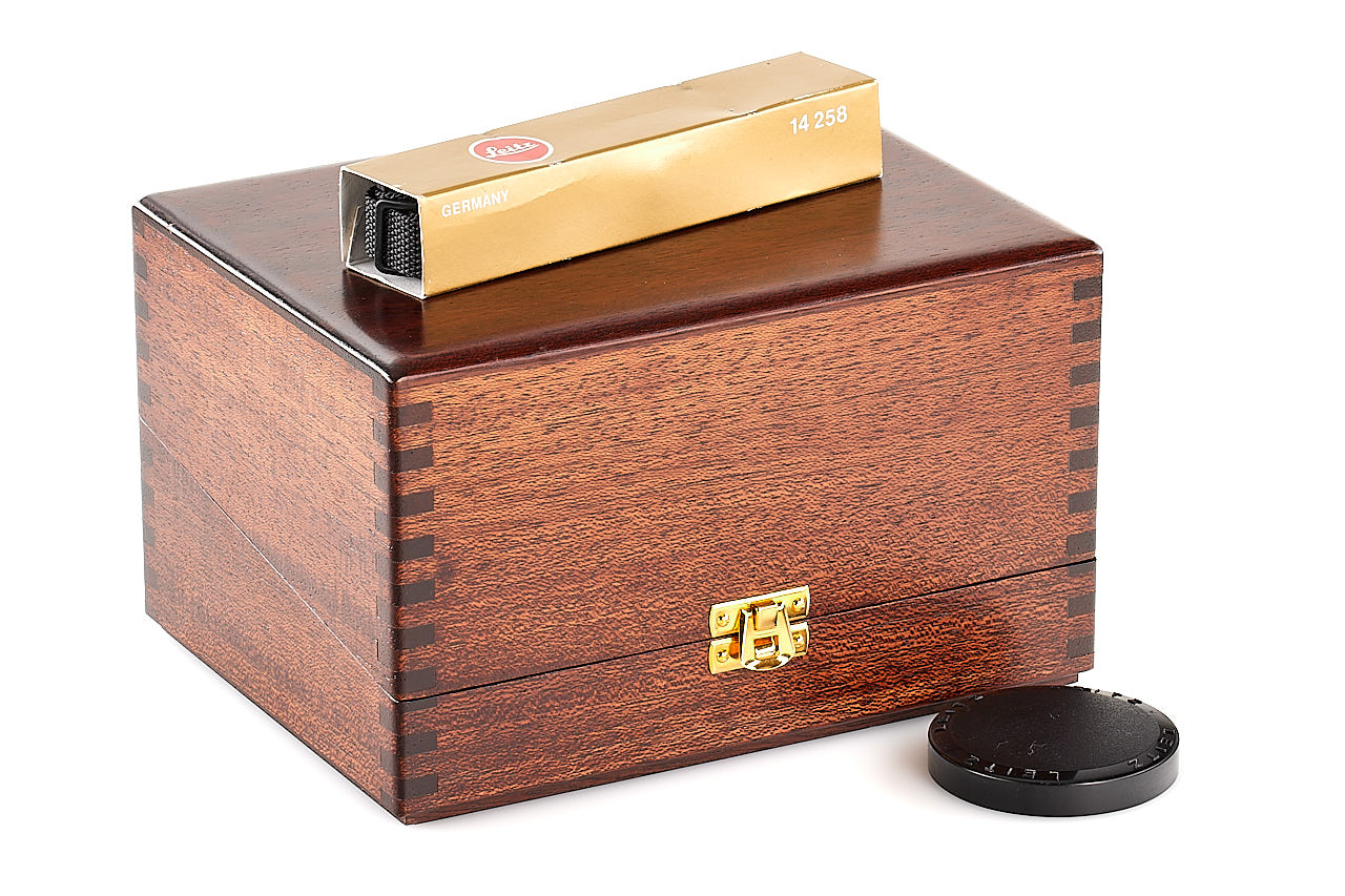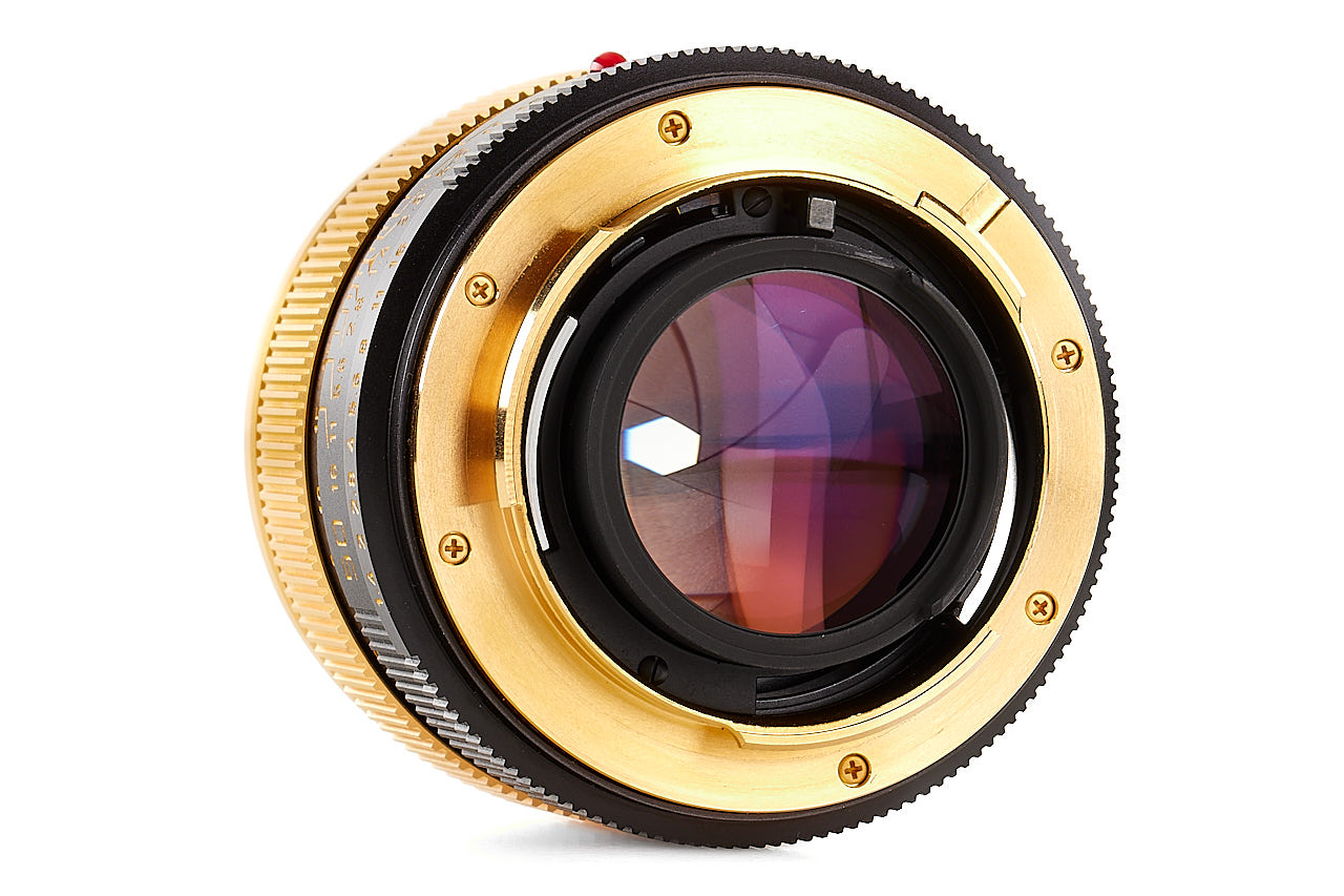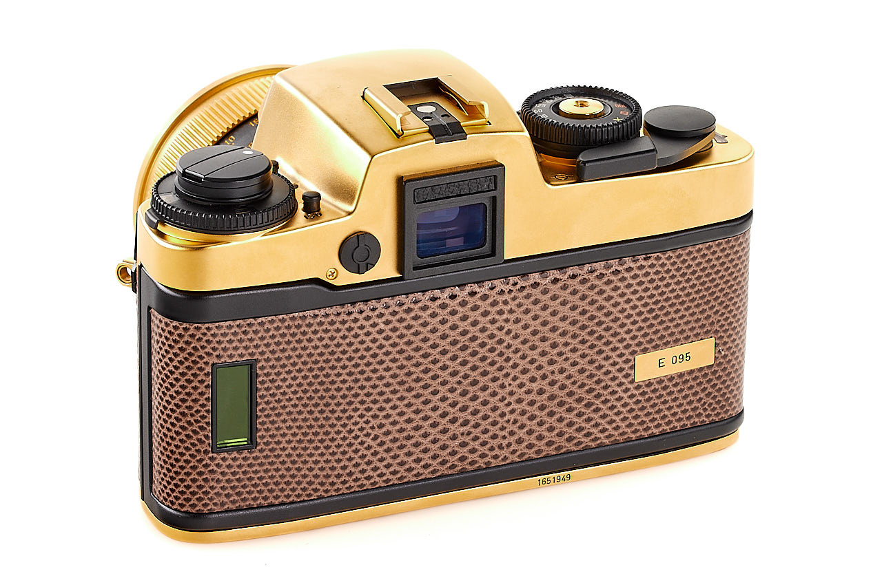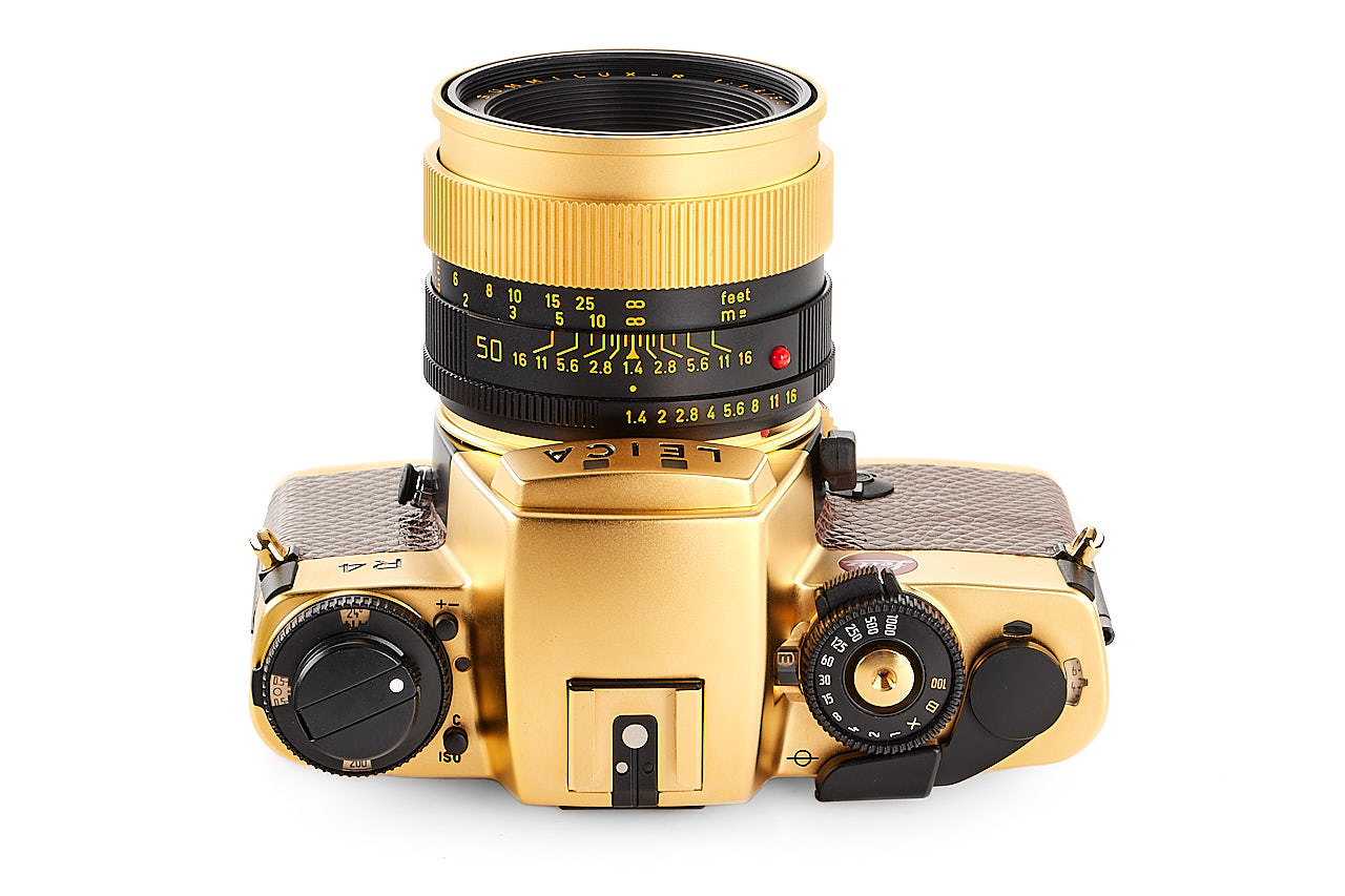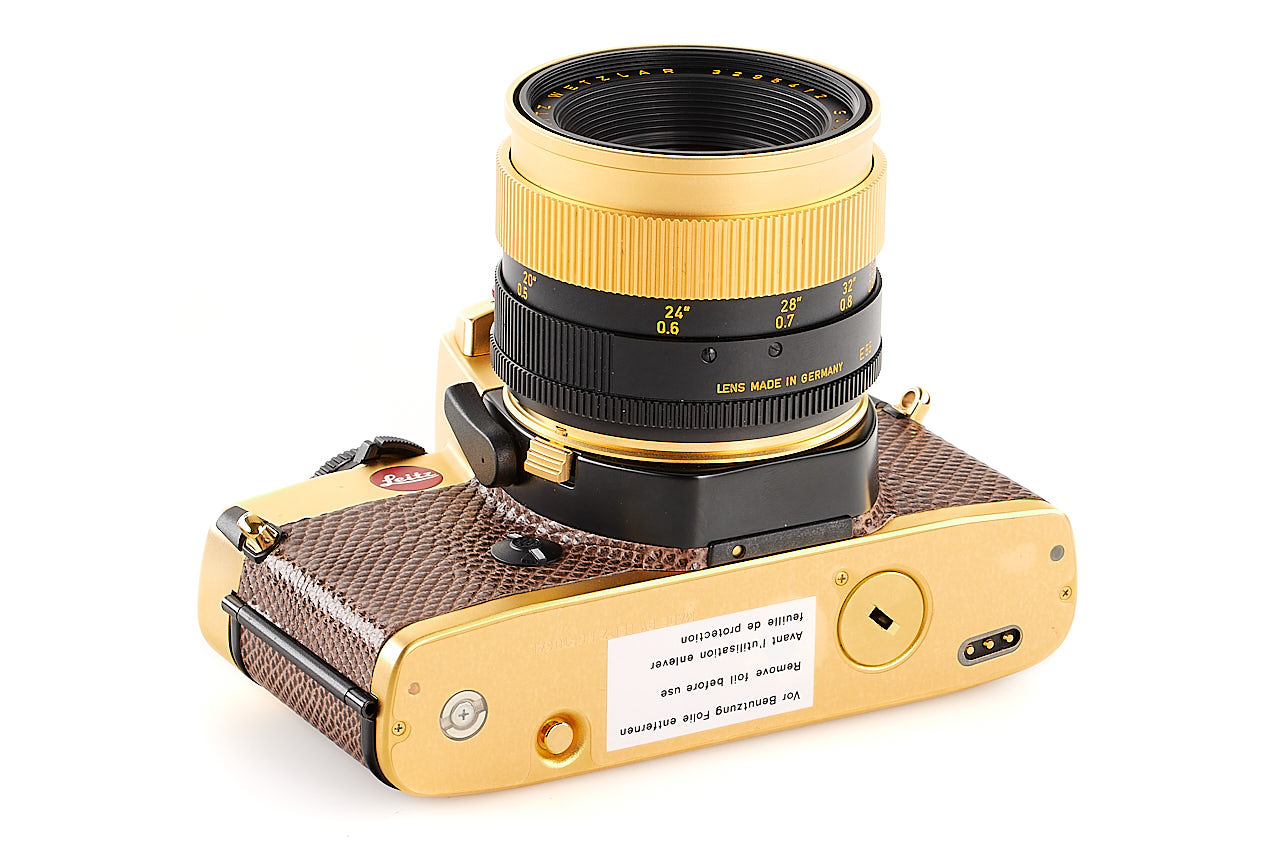 Limited edition gold plated Leica R4 (1000 pieces) with lizard skin covering, in unused condition, body no.1651949 with a golden plate on the back door engraved with 'E 095', together a with matching gold plated Summilux-R 1.4/50mm no.3295412, with front lens cap, strap, wooden presentation box and maker's box.