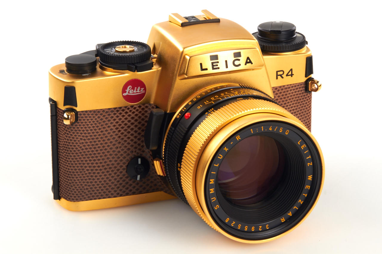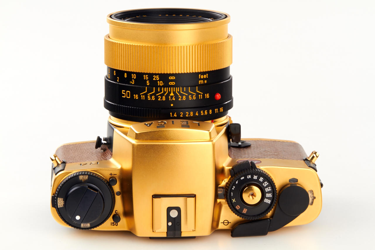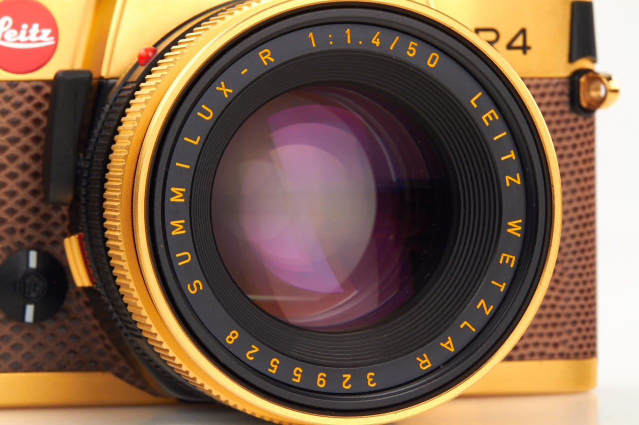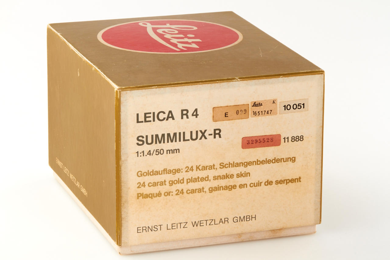new R4 gold edition with gold plated camera in snake skin covering no.1651747, gold plated Summilux-R 1.4/50mm no.3295528, complete with all accessories in original maker's box