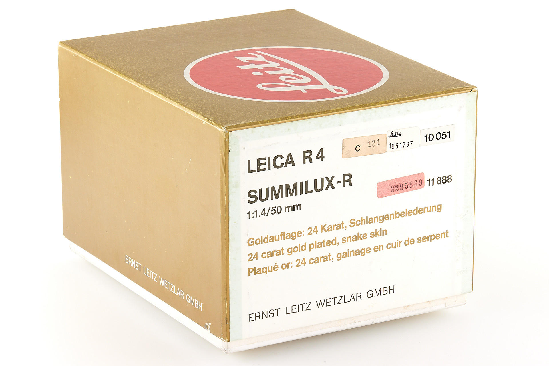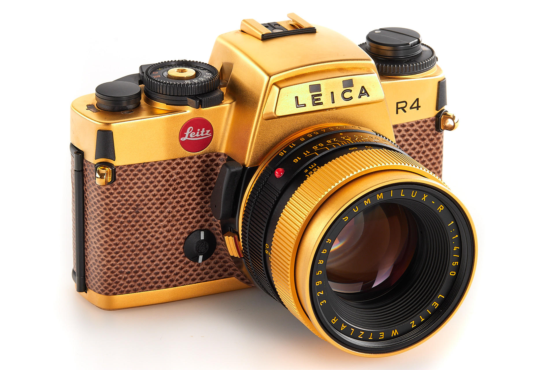 almost new R4 gold edition with gold plated camera in snake skin covering, body number 1651797, with matching gold-plated Summilux-R 1.4/50mm no.3295869, complete with all accessories in maker's box