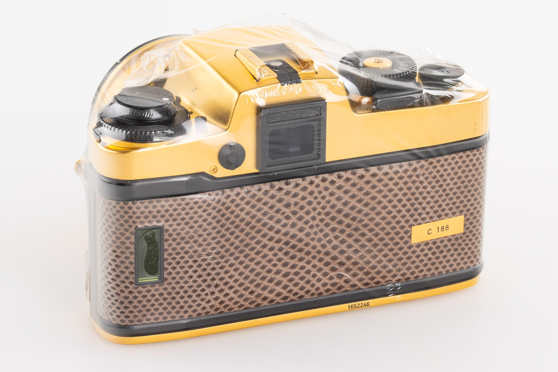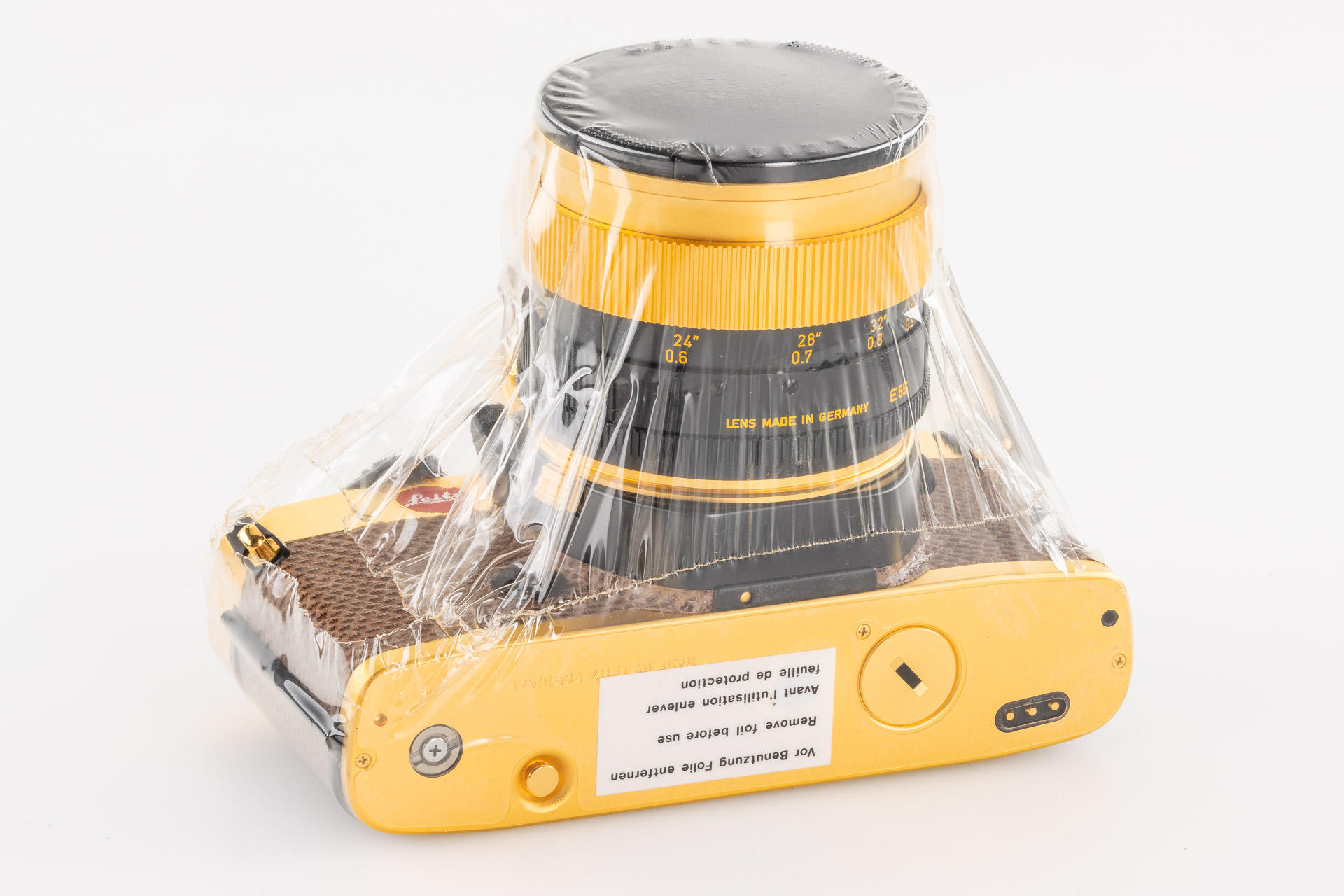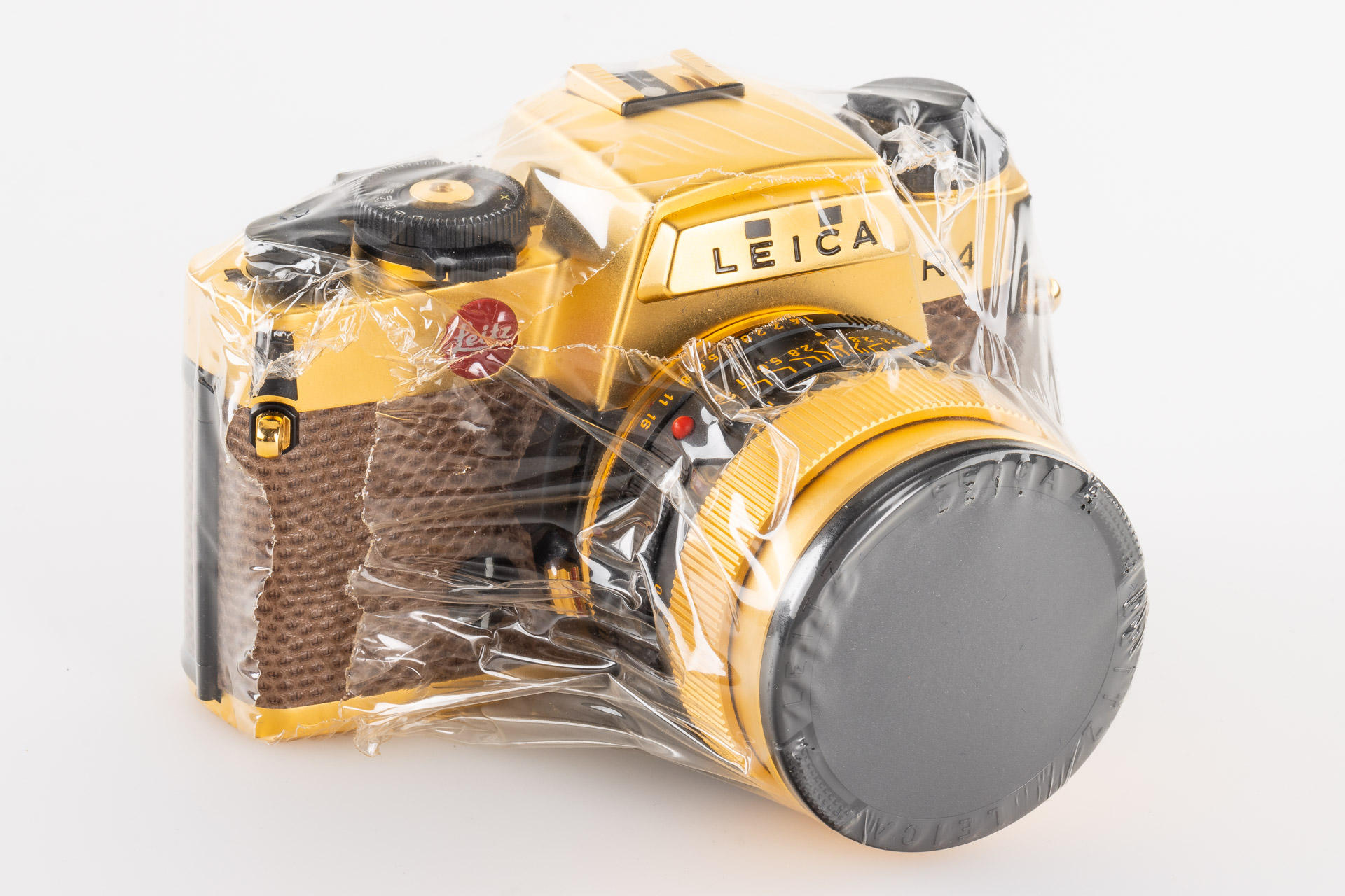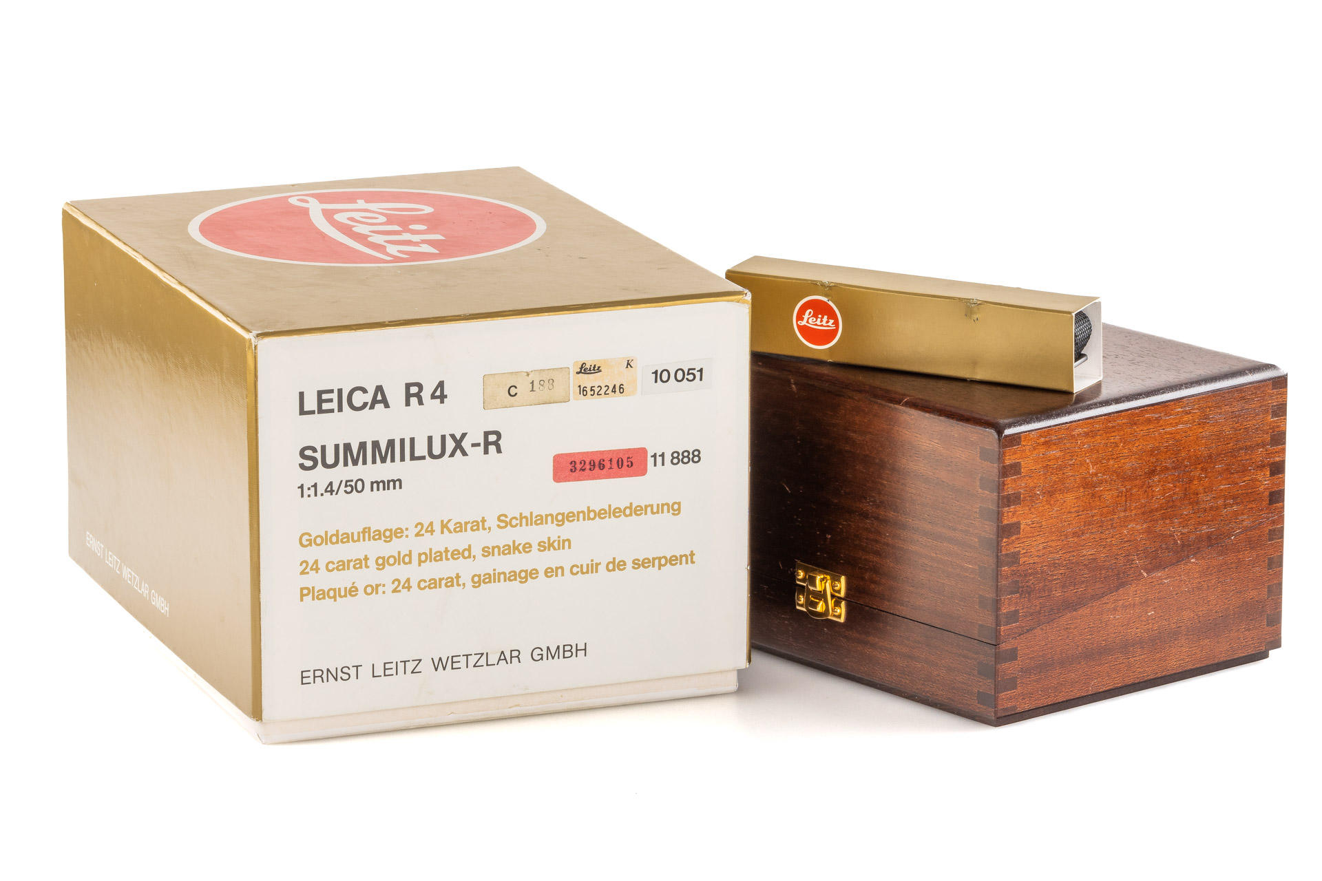 limited edition gold plated R4 (1000 pieces) in snakeskin covering, in unused condition, still sealed in plastic (partially open), body number 1652246 (strap), with matching gold plated Summilux-R 1.4/50mm no.3296105 (front cap), with presentation box and maker's box
