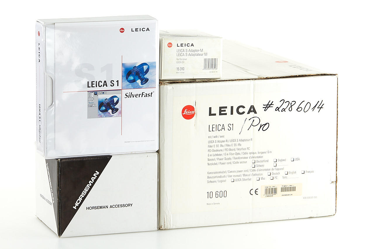 the first digital camera made by Leica. A high resolution scanner camera with CCD chip (resolution of 26 million, 5140 x 5140 pixels and 36 bit depth). Only about 150 camera were sold, the new price was approx. Euro 17000. The camera is in mint condition with cap, software, E5 IRa filter, AC adapter, maker's box, cables, papers, S-Adapter-HA to use Leica R lenses, as well as Horseman View Camera adapter (mountable directly on the S1 camera, build-in IRa filter) with M39 lens board, Rodenstock Rodagon 4/80mm no.11605378, boxed S-Adapter-M 15310 adapter for Leica M lenses and copy of original invoice from 2001
