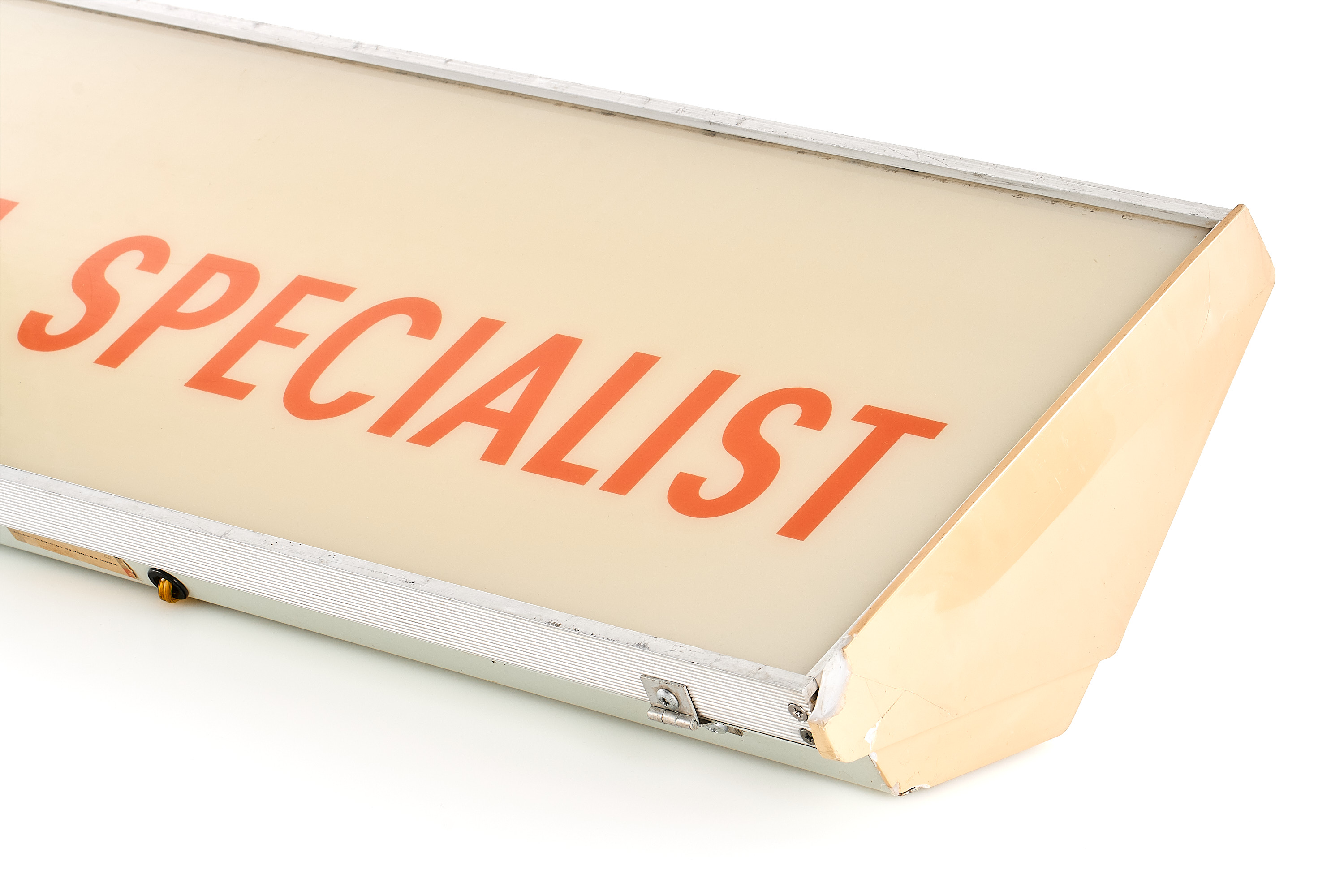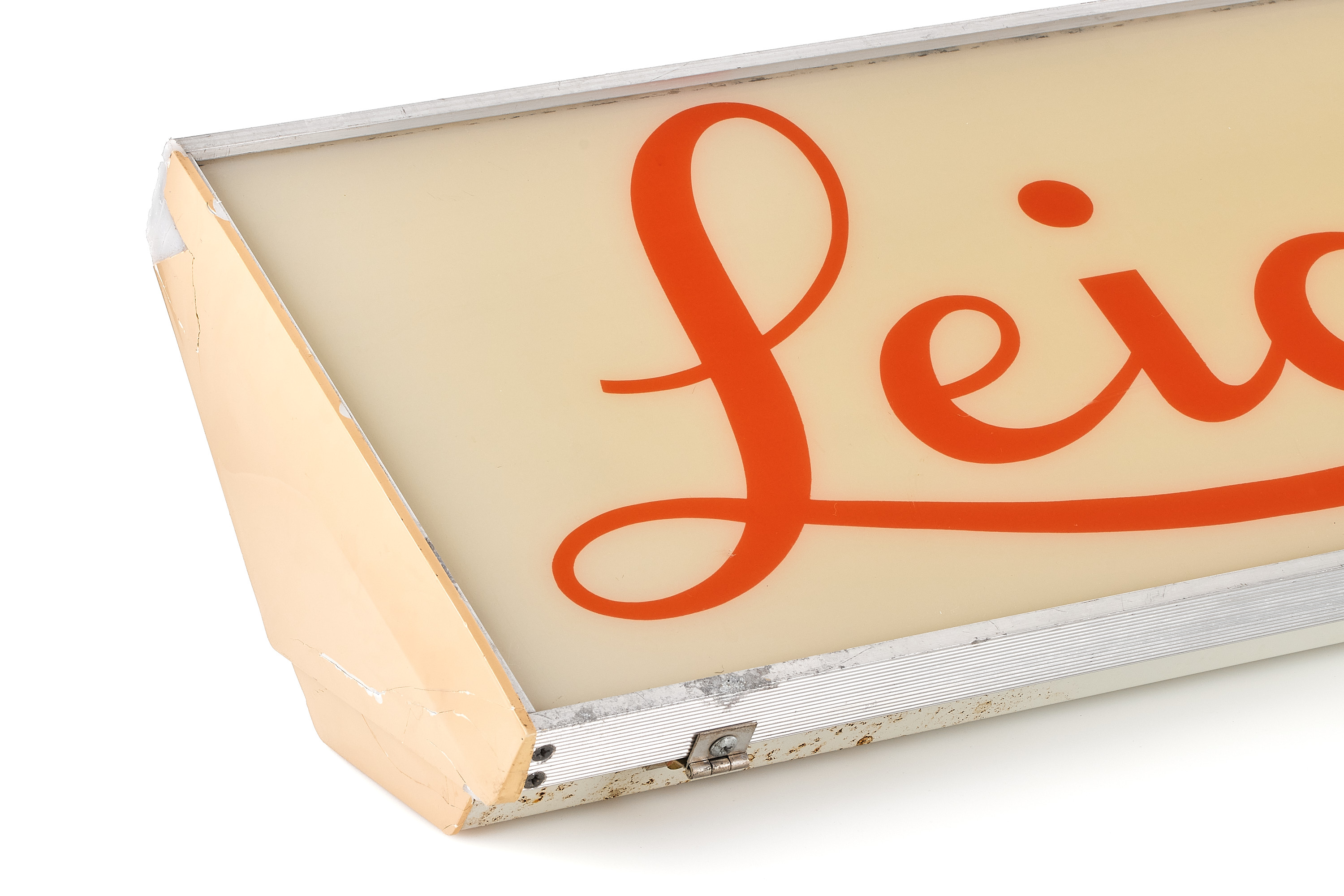 Very attractive display neon lamp with 'Leica Specialist', in very good condition and working order, showing some cracks on the sides, made in the USA, printed plexiglas in metal frame (95 x 25 x 10cm).