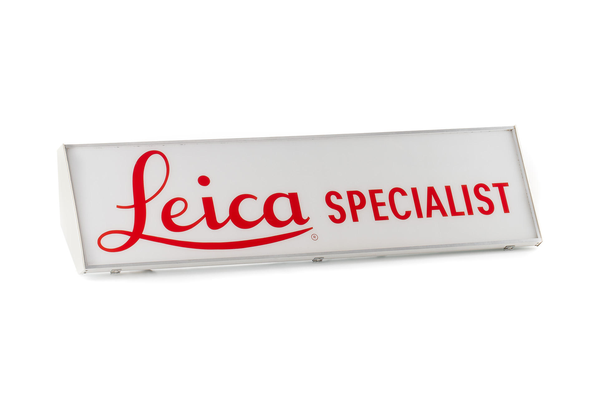very attractive display lamp with 'Leica Specialist', in very good condition, made in the USA, neon inside (not tested), printed plexiglas in metal frame (95 x 10 x 11cm)