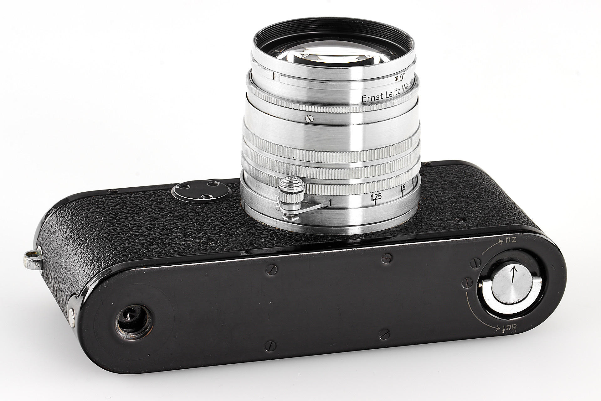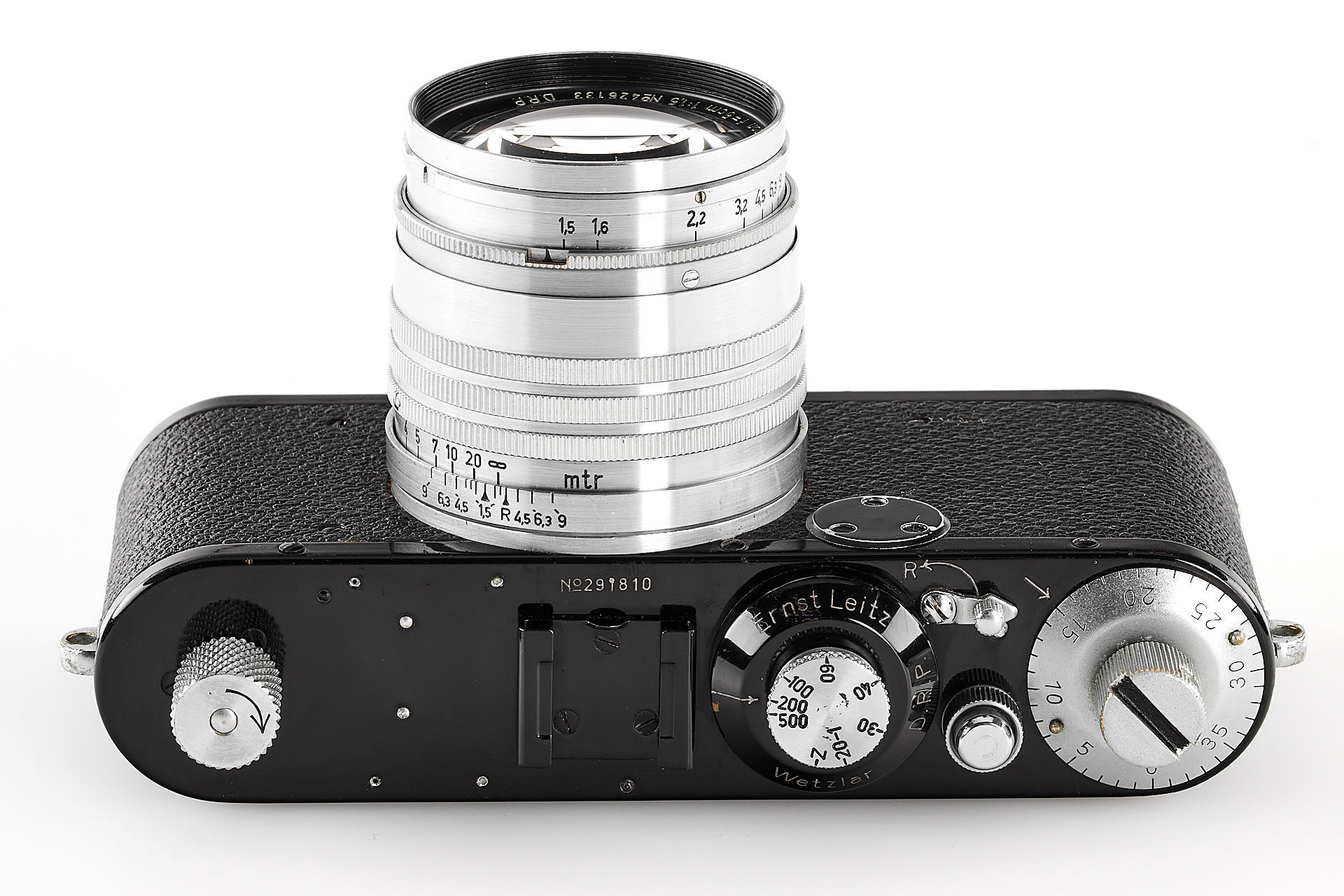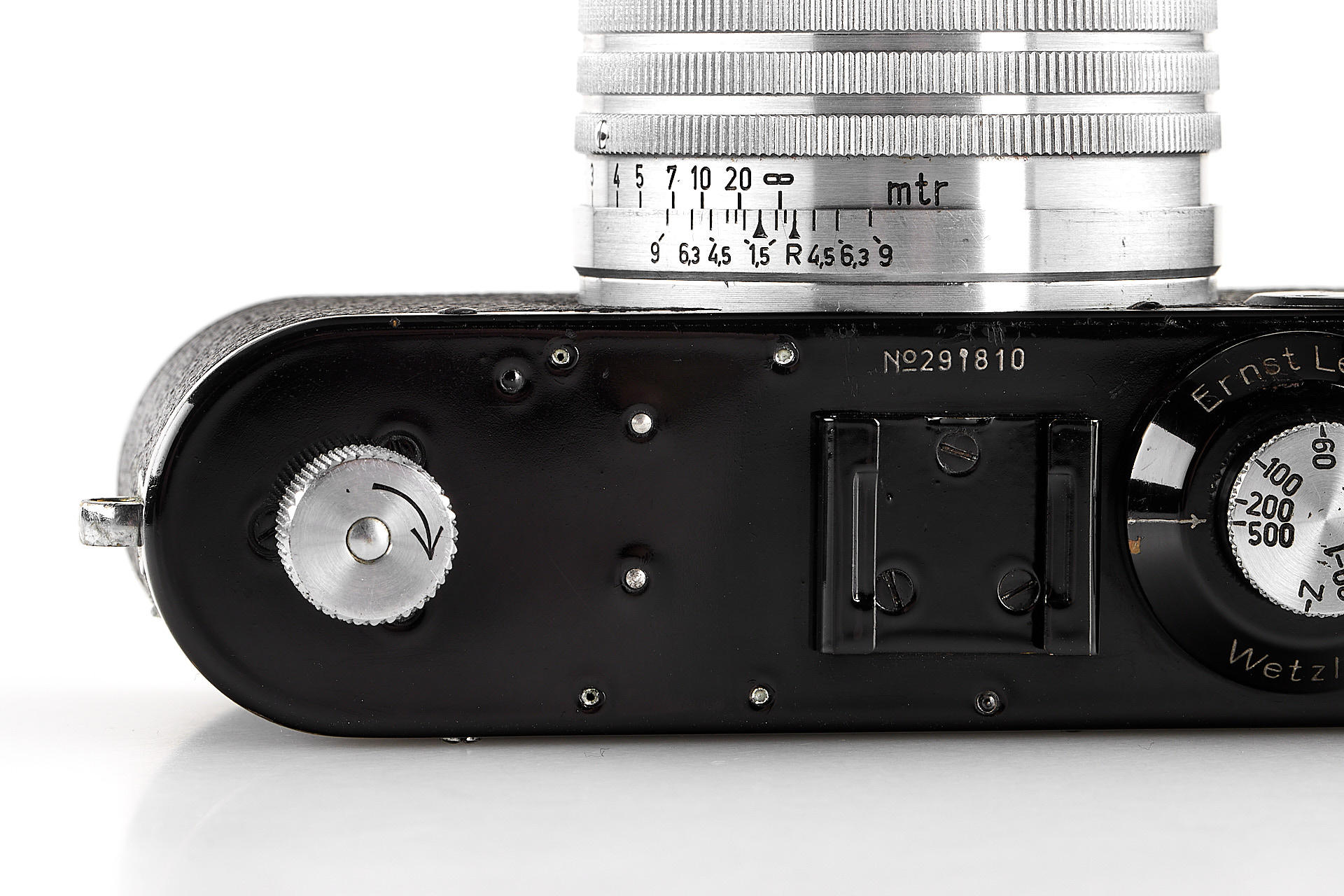 an interesting, factory modified Leica Standard, without the viewfinder, no slow speeds, modified winding knob, most probably intended to use in an X-Ray device, with clean Xenon 1.5/5cm no.426133