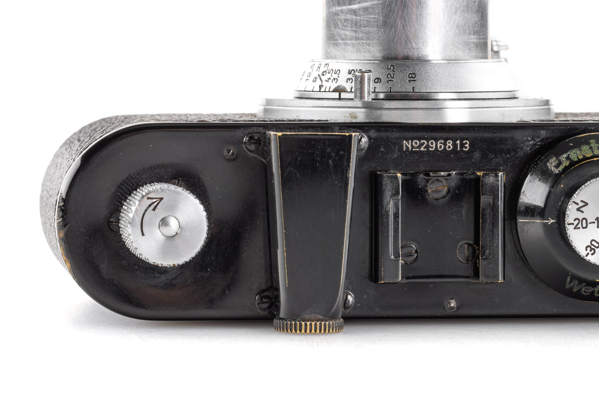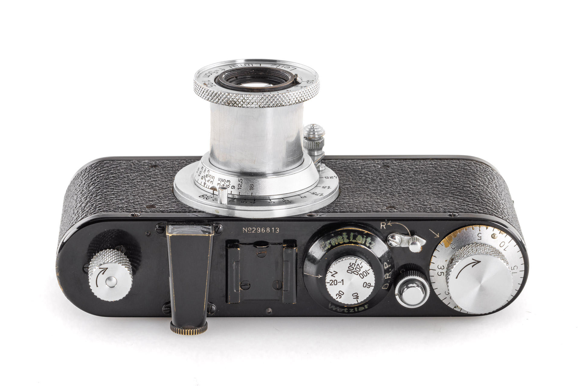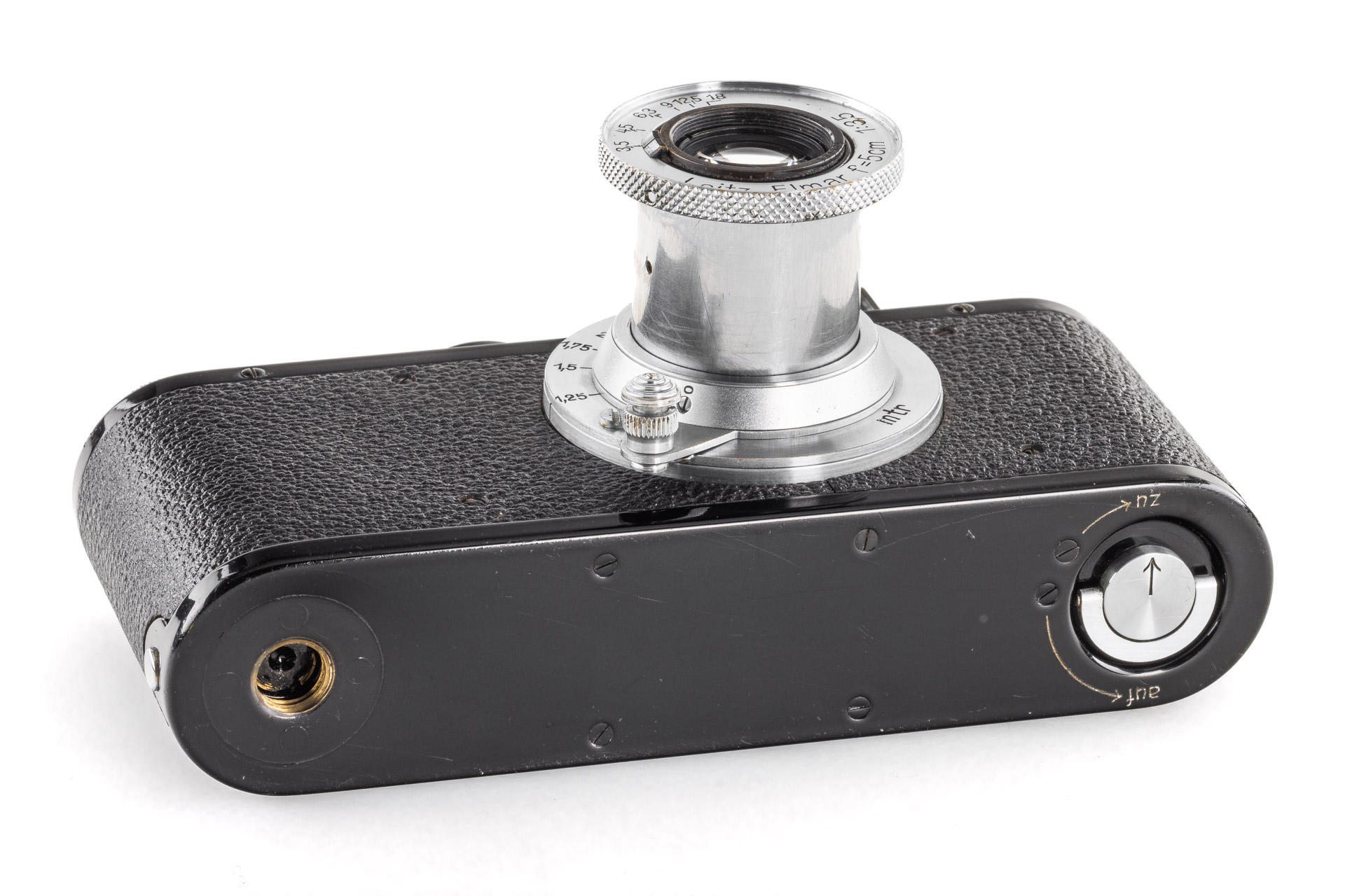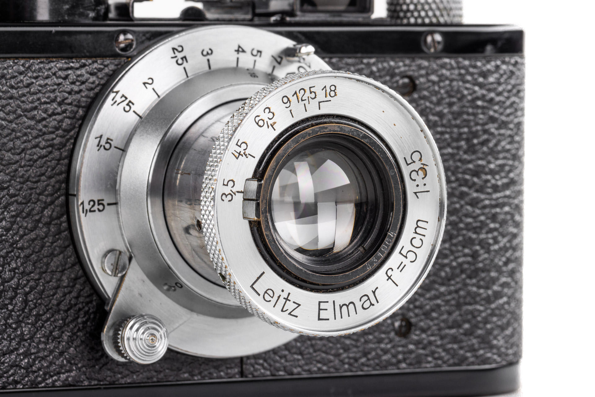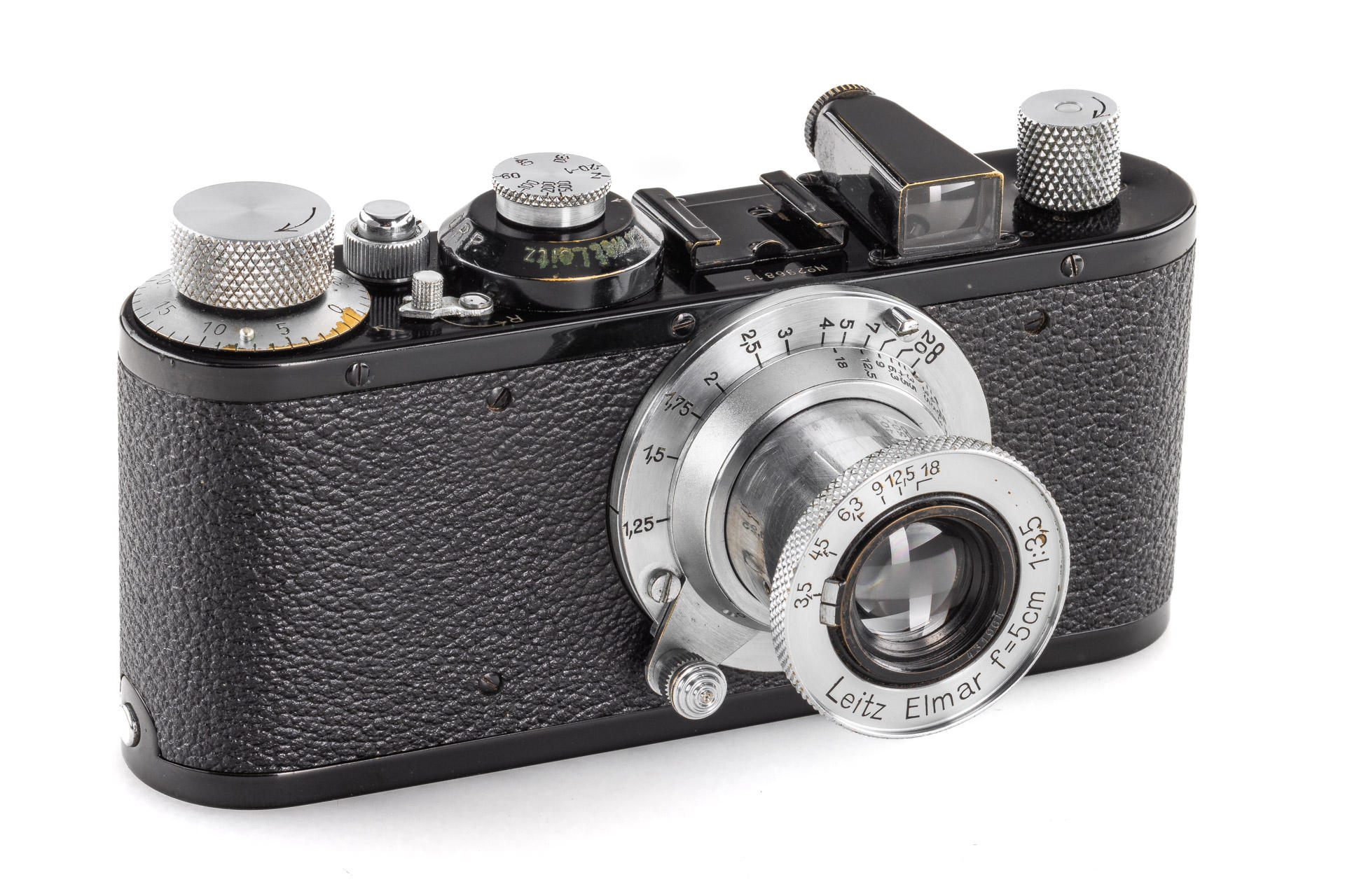 nice black/chrome body in very good condition and working order, delivered to Berlin on 2.9.1938, rewind crank slightly bent (not affecting its functionality), with matching chrome Elmar 3.5/5cm no.431964 (1938), good lenses only showing a light haze, with leather eveready case