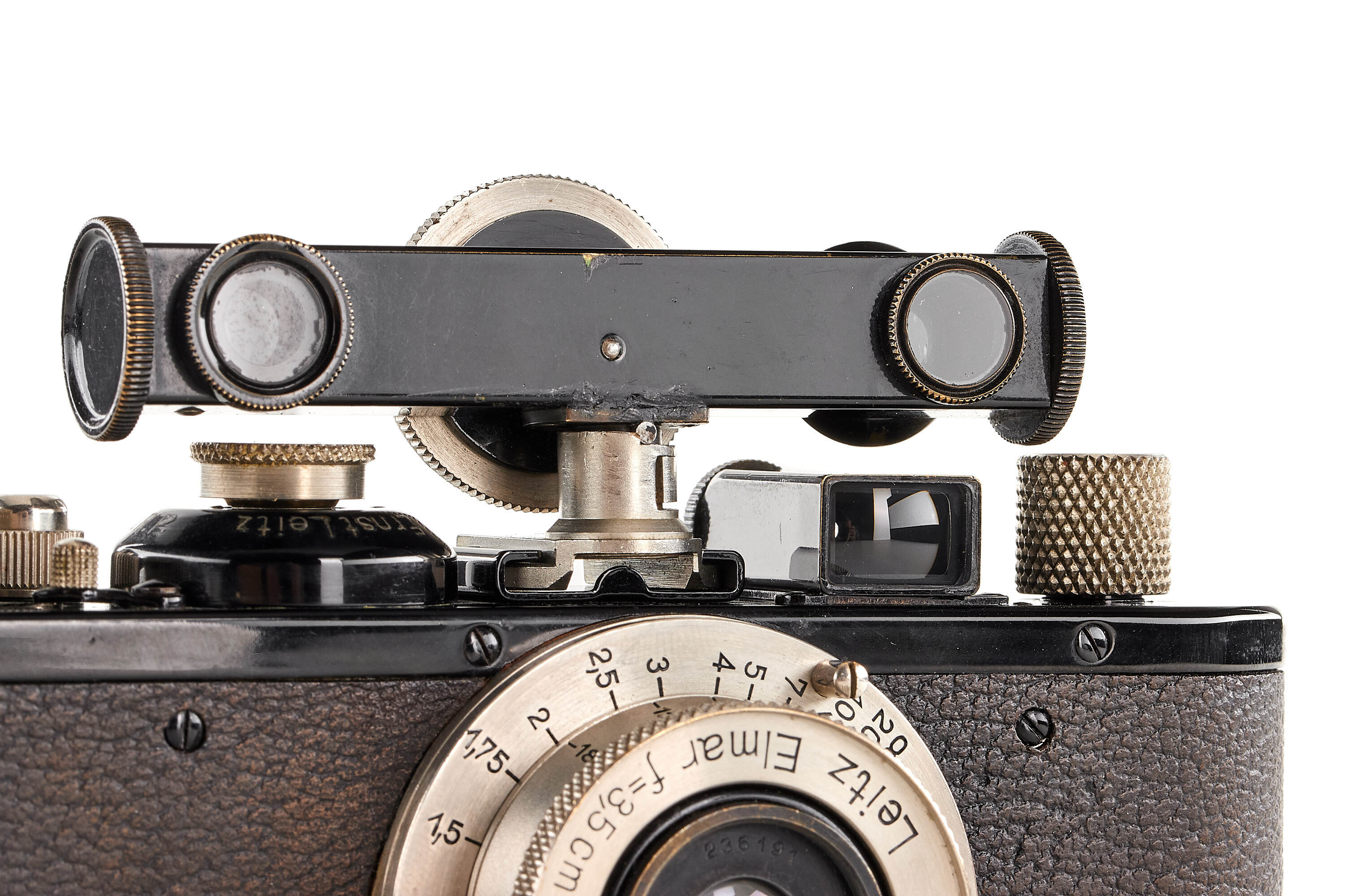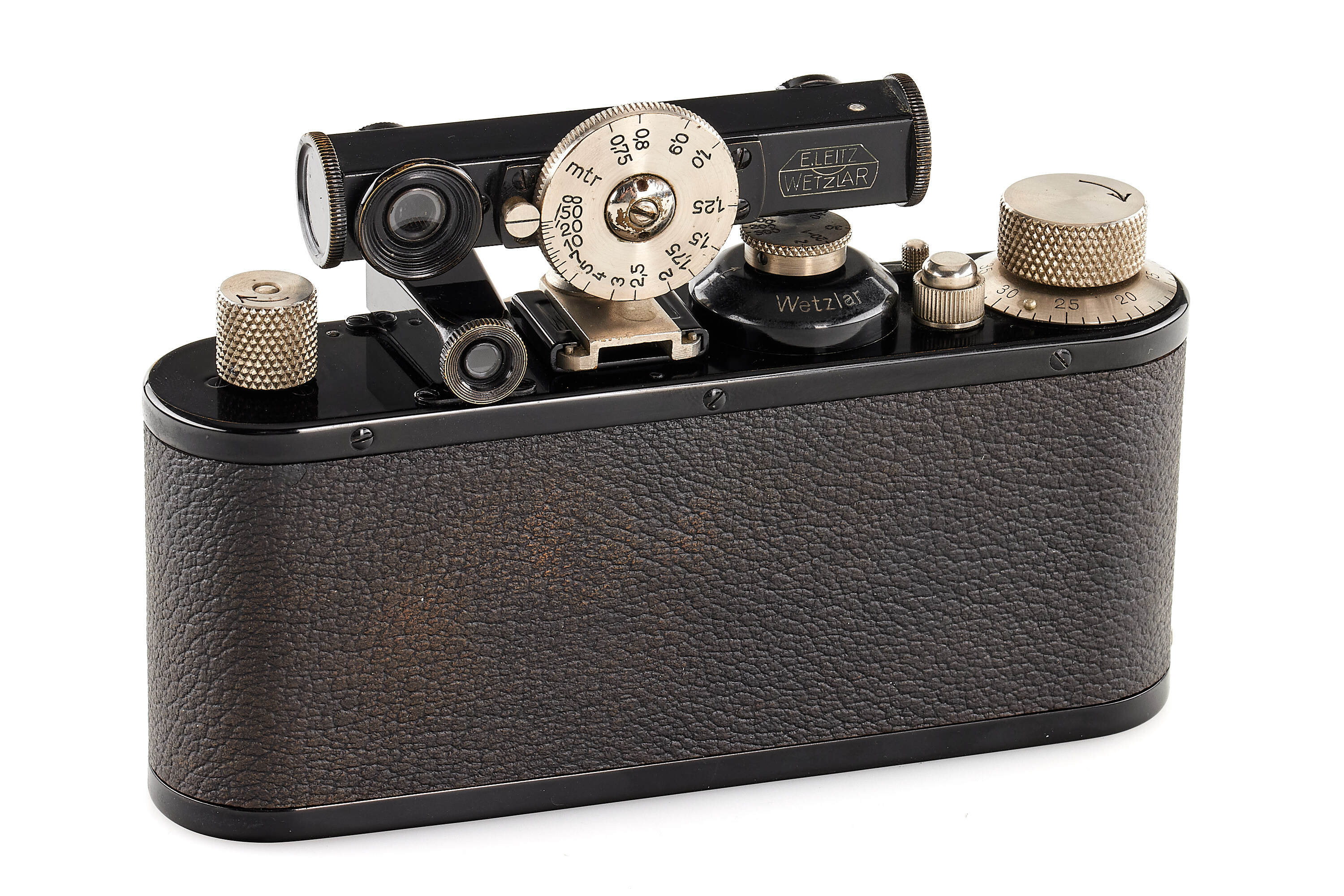 Beautiful quite early black/nickel body, in mint and original condition, delivered on 30.07.1934, together with nickel Elmar 3.5/3.5cm no.236191in meter scale, optics showing flakes of separation, with early meter black/nickel FOKOS with mounting shoe adapter.