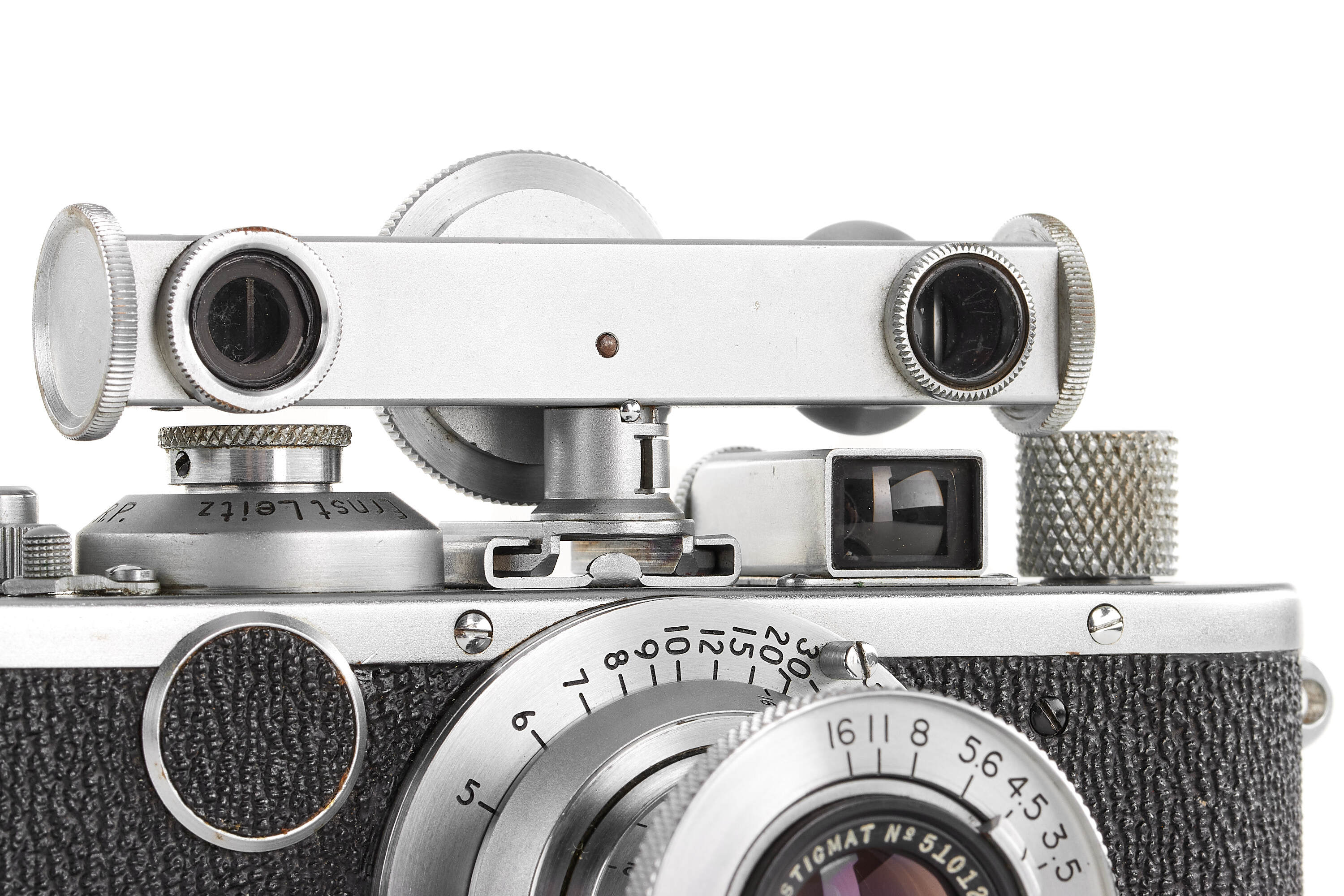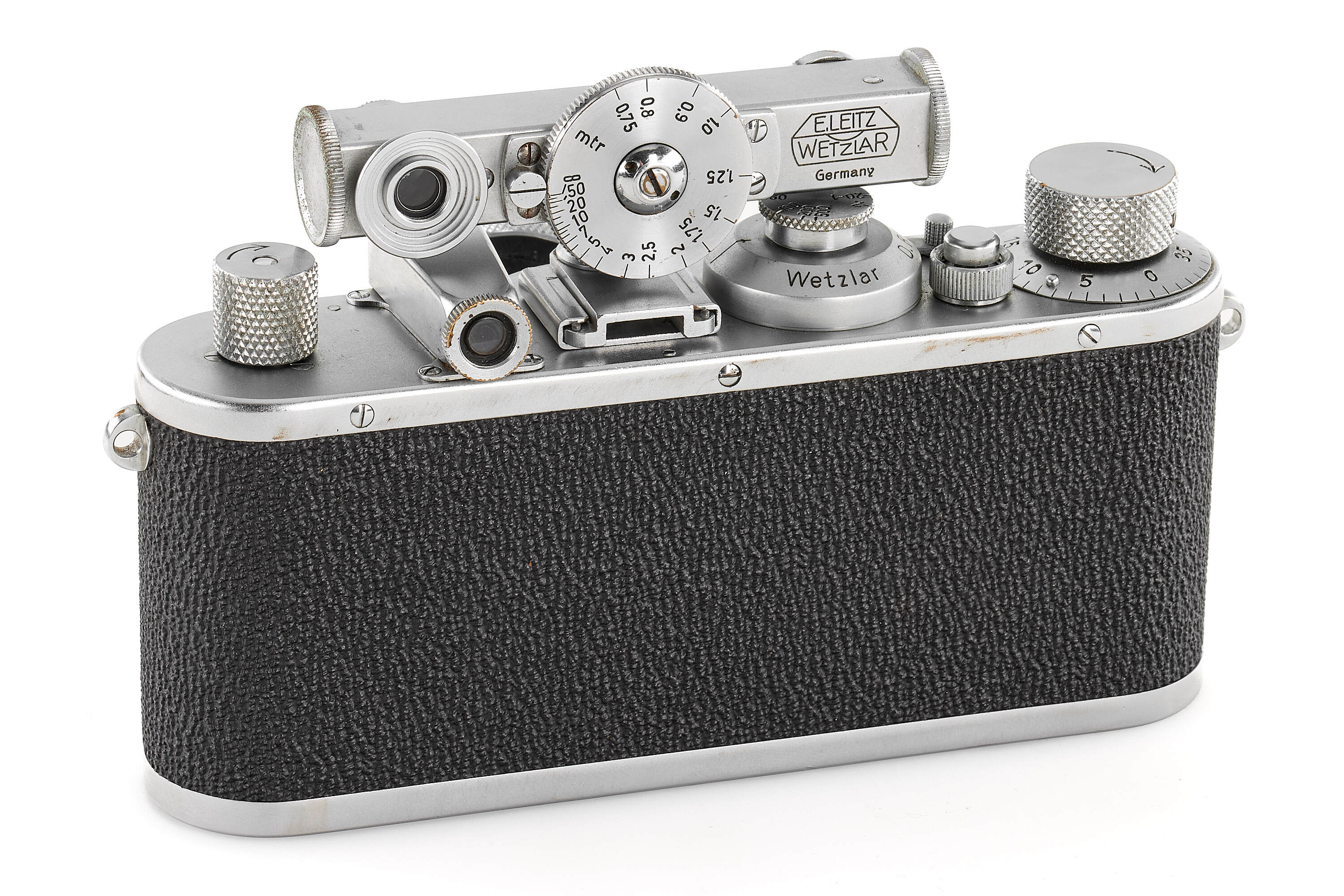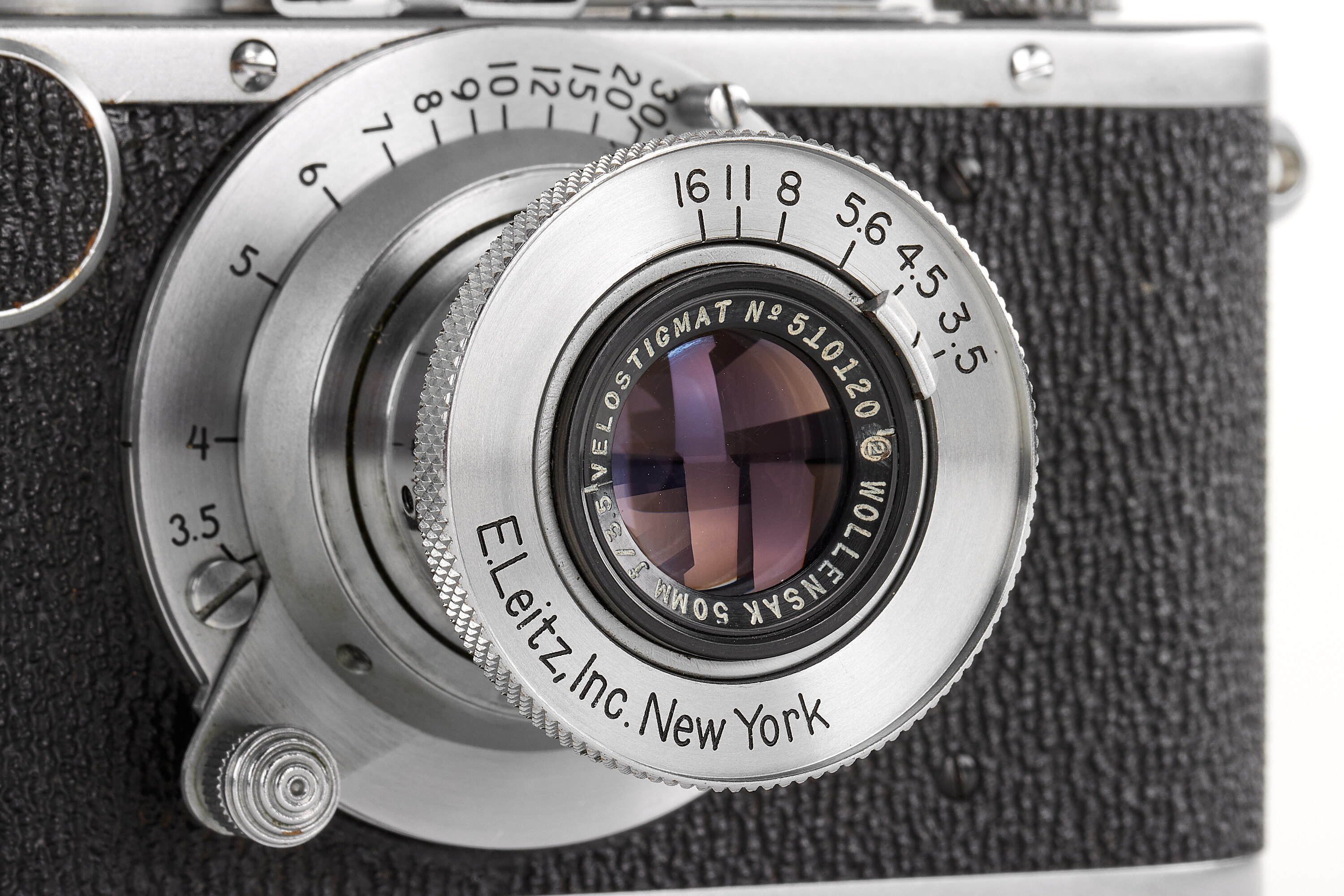 Rare extremely late, post-war chrome Standard with "sharkskin" vulcanite patch, in almost mint condition, note the strap lugs, late delivery on 02.06.1954, with rare E. L. New York Velostigmat 3.5/50mm no.510120, good optics only showing a few cleaning marks on the front element, with HFOOK rangefinder with turret.