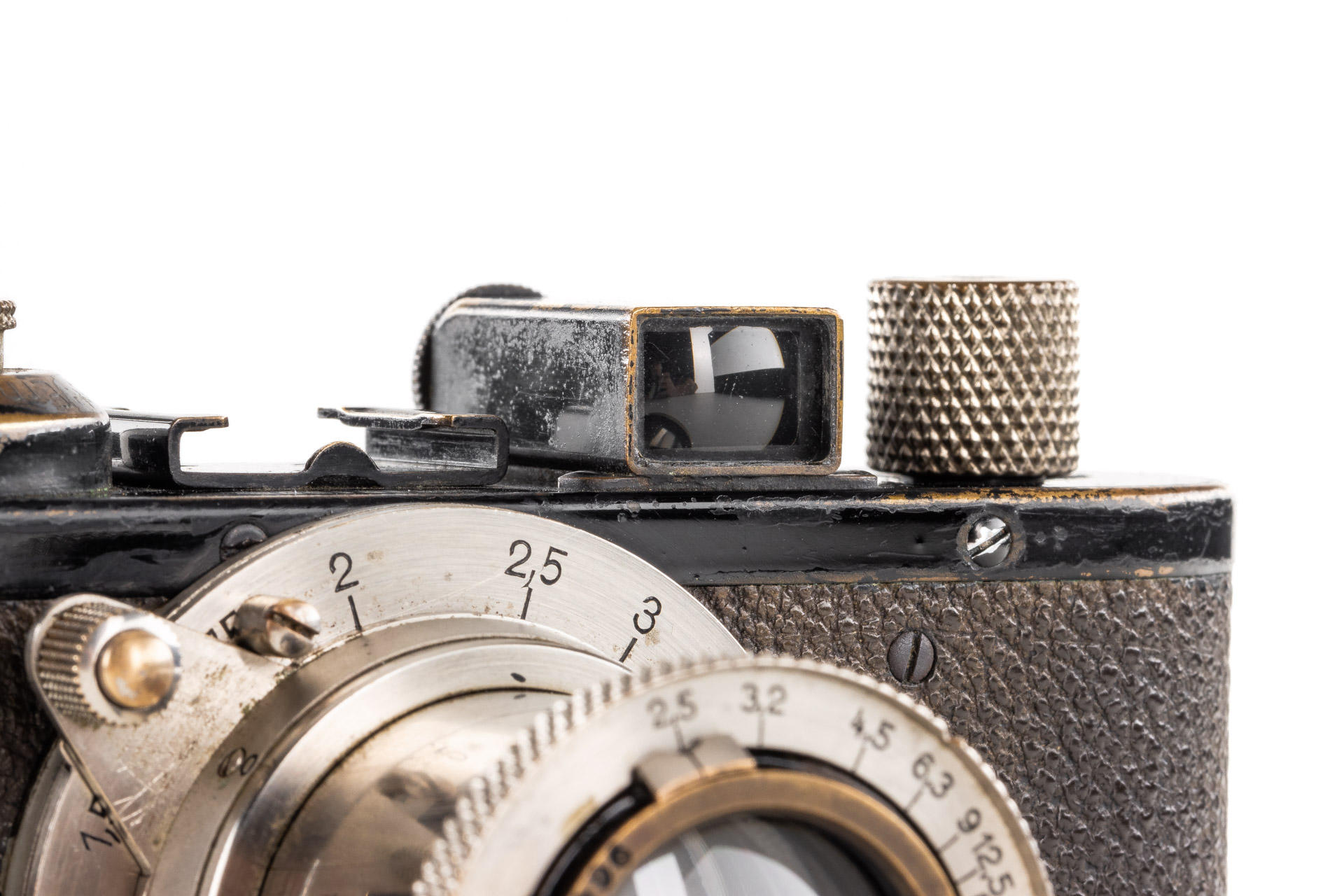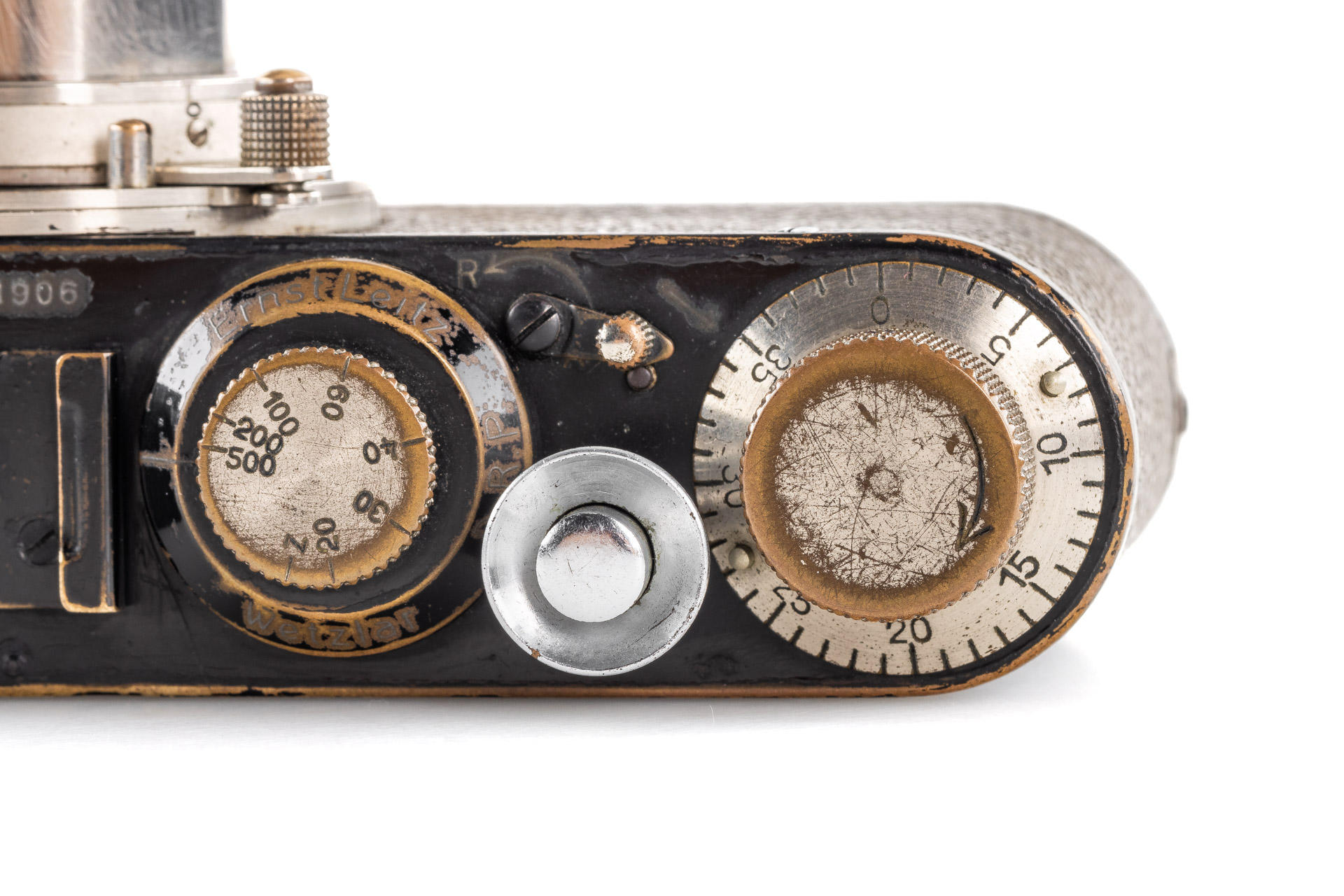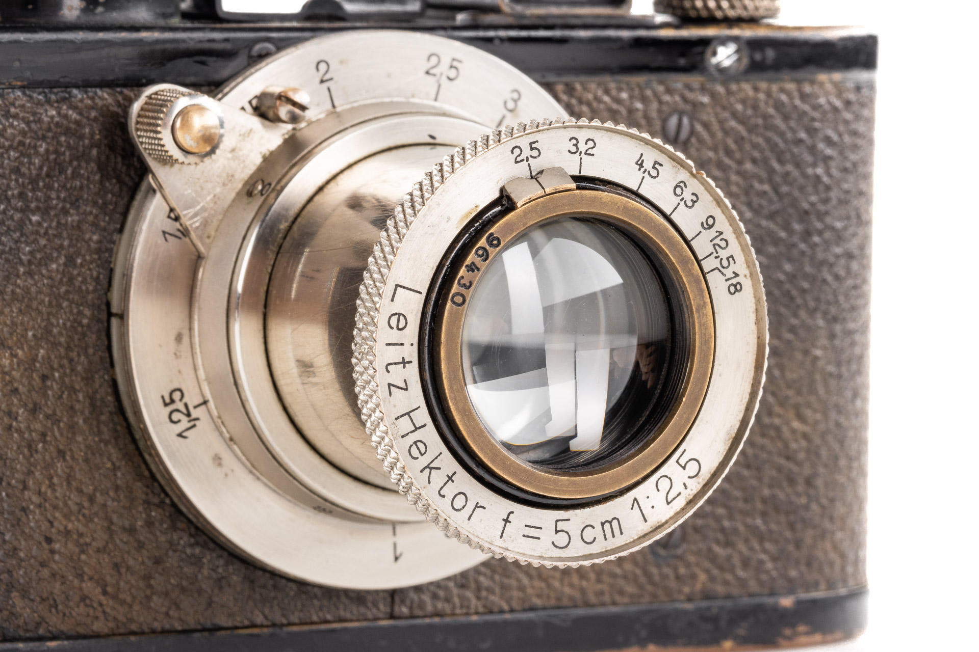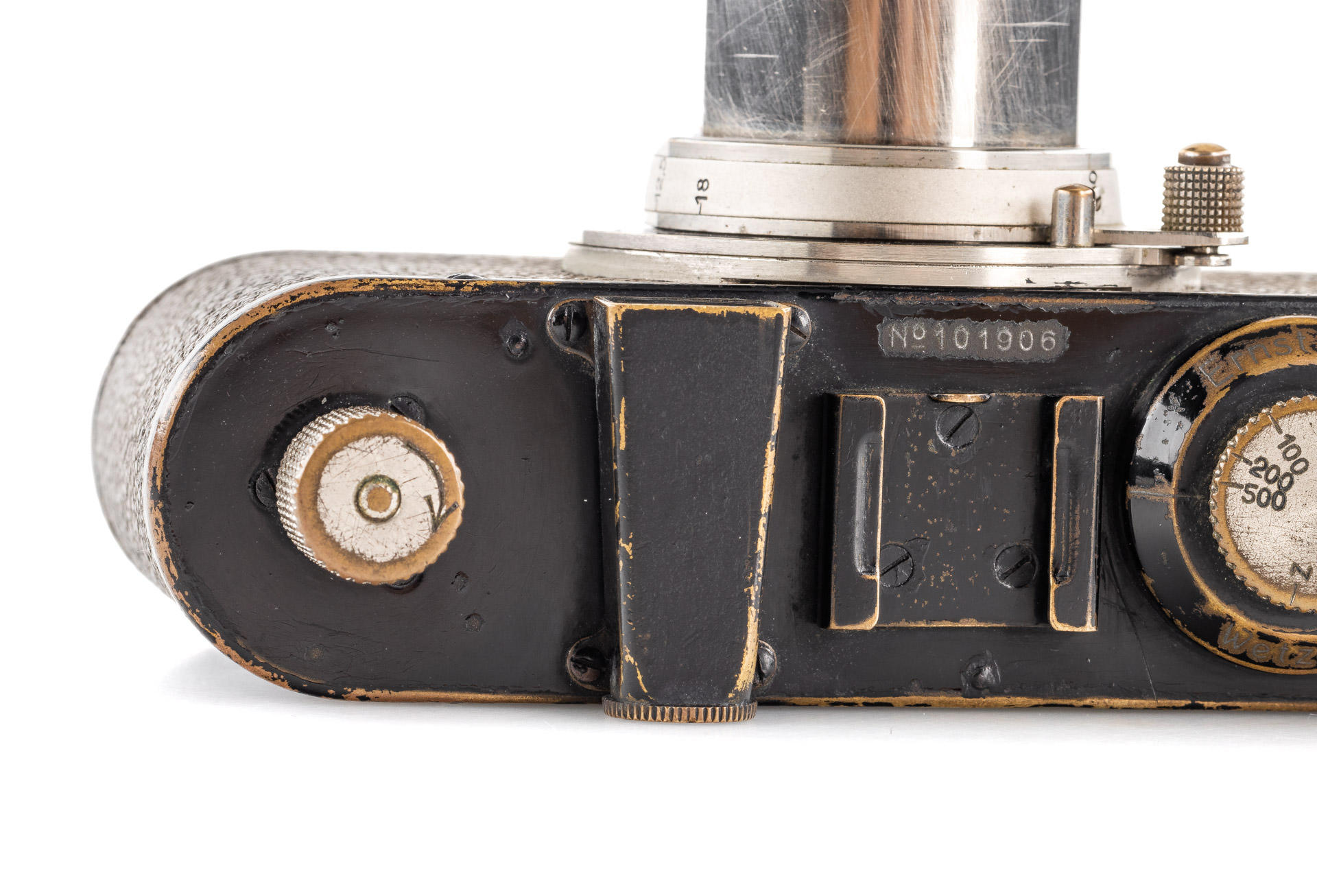 Black/nickel body with very early serial number (started with 101001), in worn condition showing many years of use, some areas repainted and a patch of leather removed from the back side, with matching very early (1932) nickel Hektor 2.5/5cm no. 96430 (light cleaning marks and haze), with rare SOREI soft release and black painted front lens cap