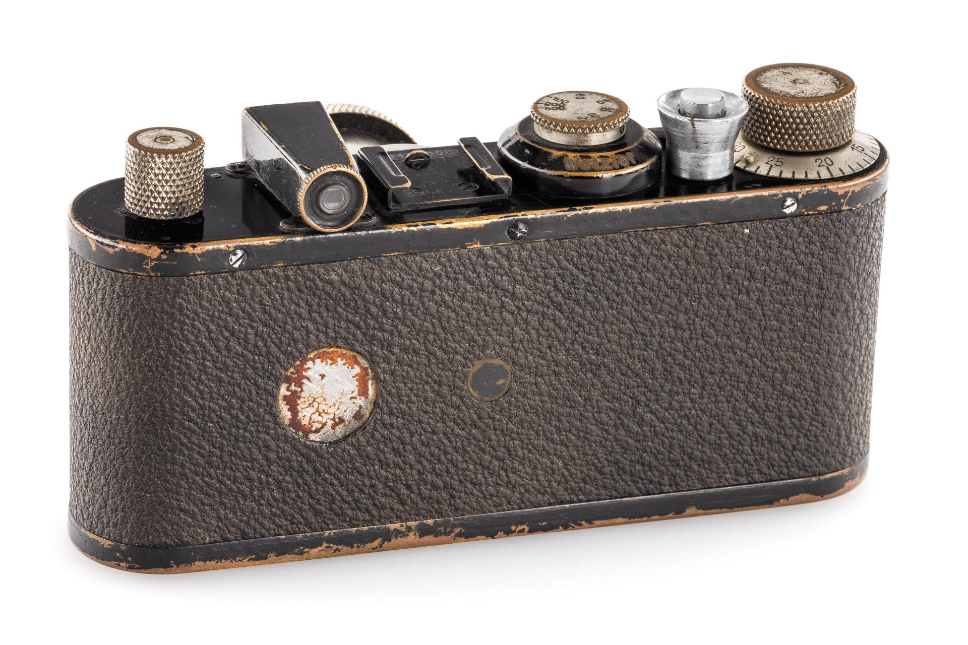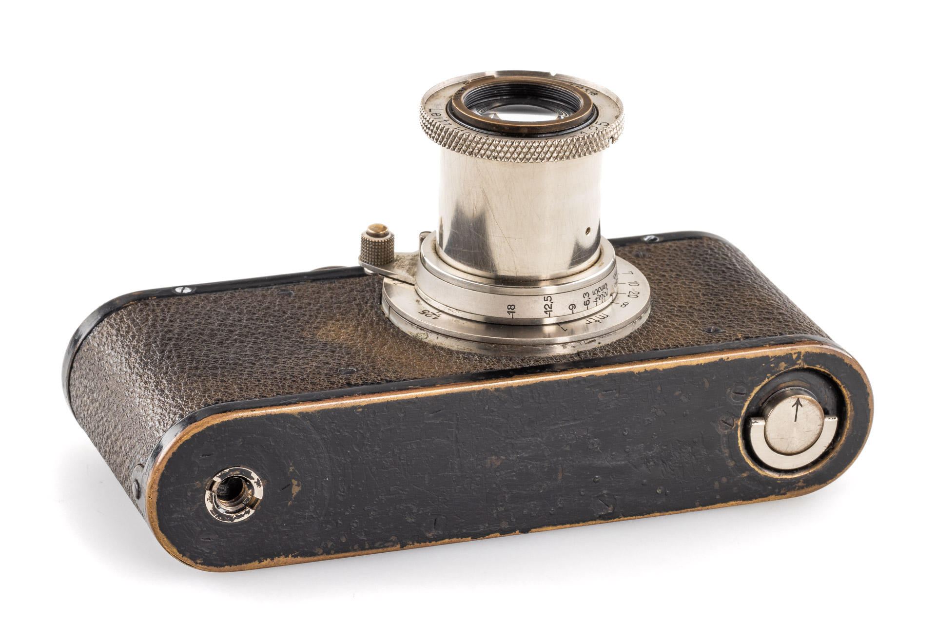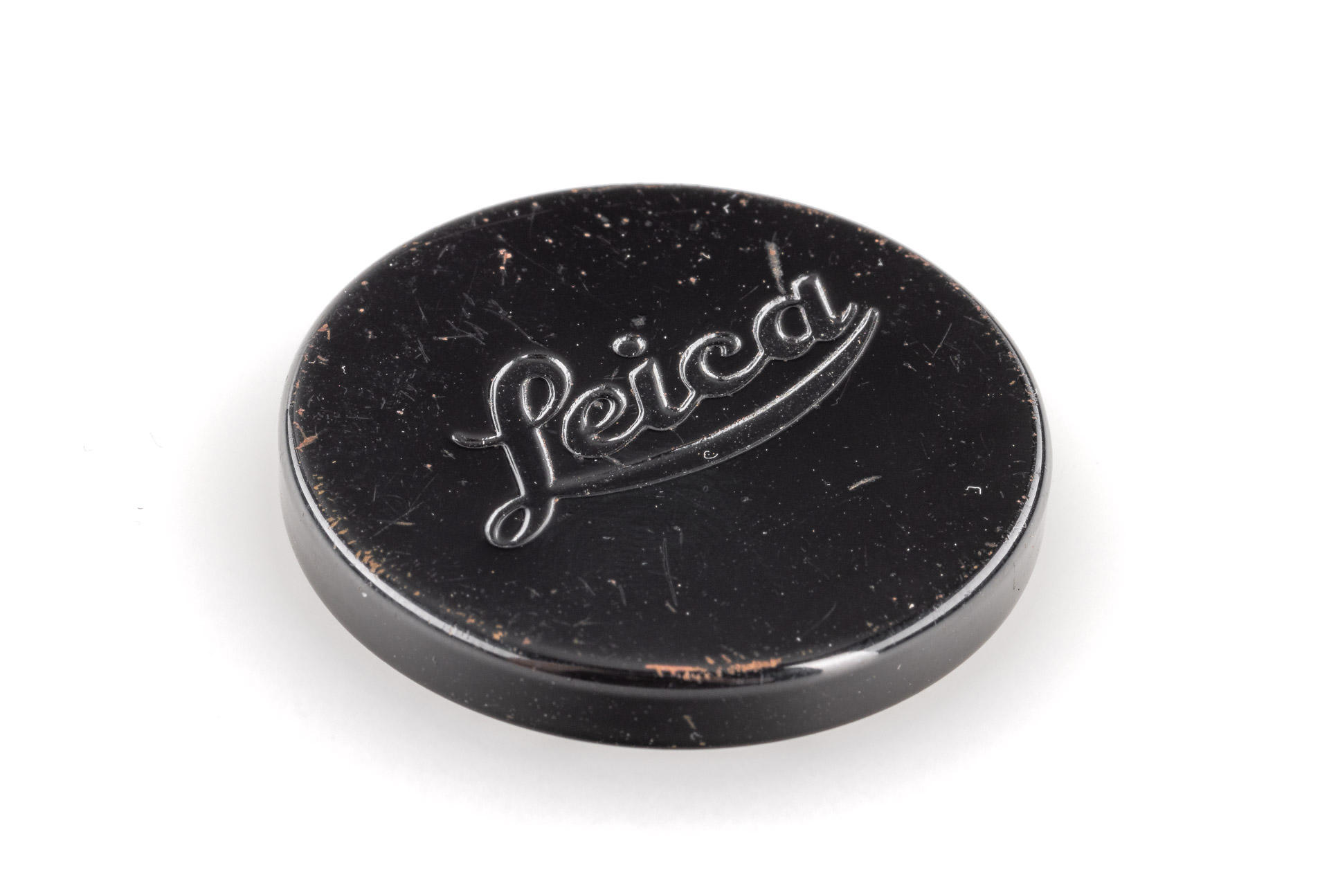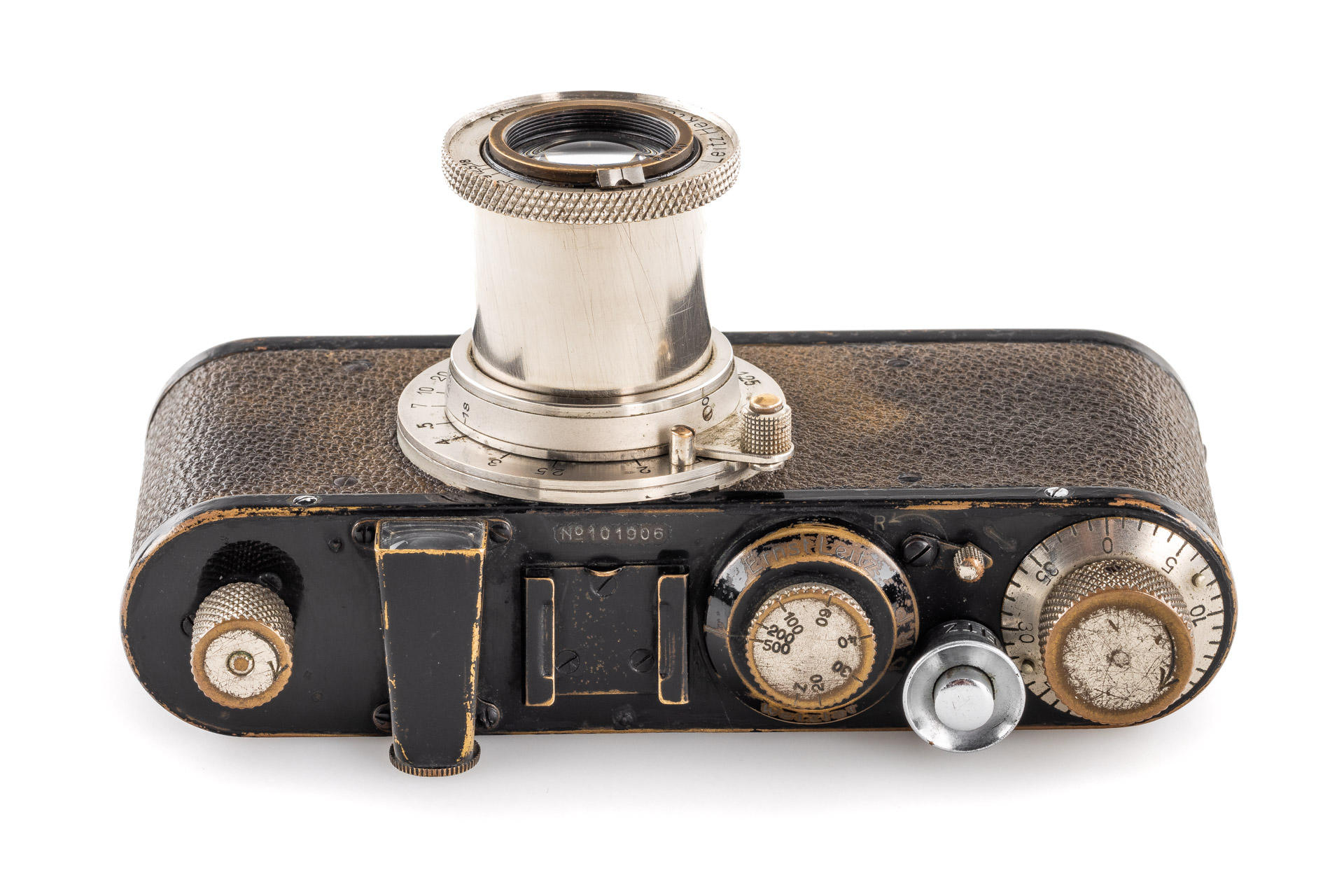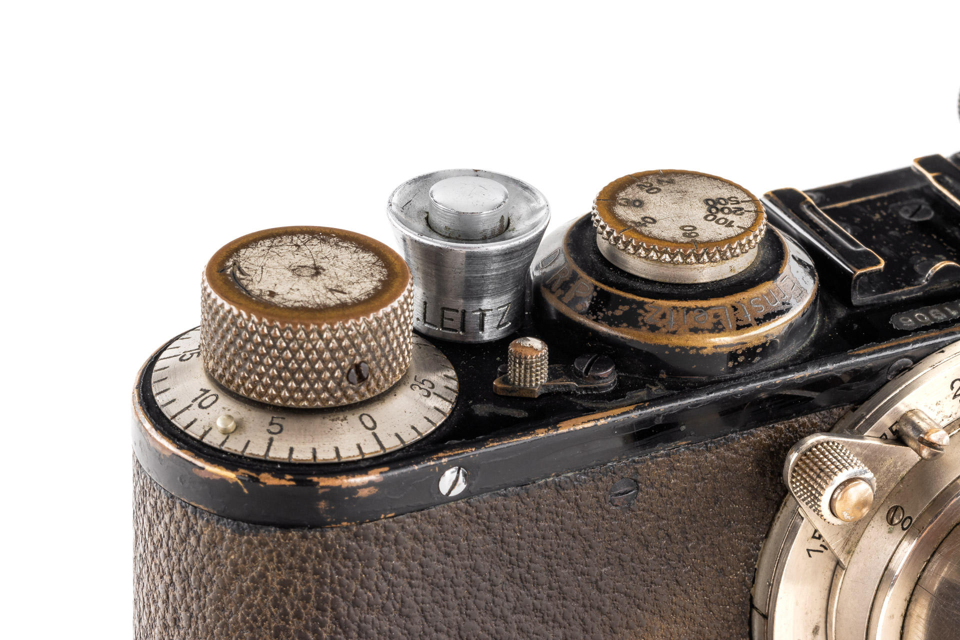 Black/nickel body with very early serial number (started with 101001), in worn condition showing many years of use, some areas repainted and a patch of leather removed from the back side, with matching very early (1932) nickel Hektor 2.5/5cm no. 96430 (light cleaning marks and haze), with rare SOREI soft release and black painted front lens cap