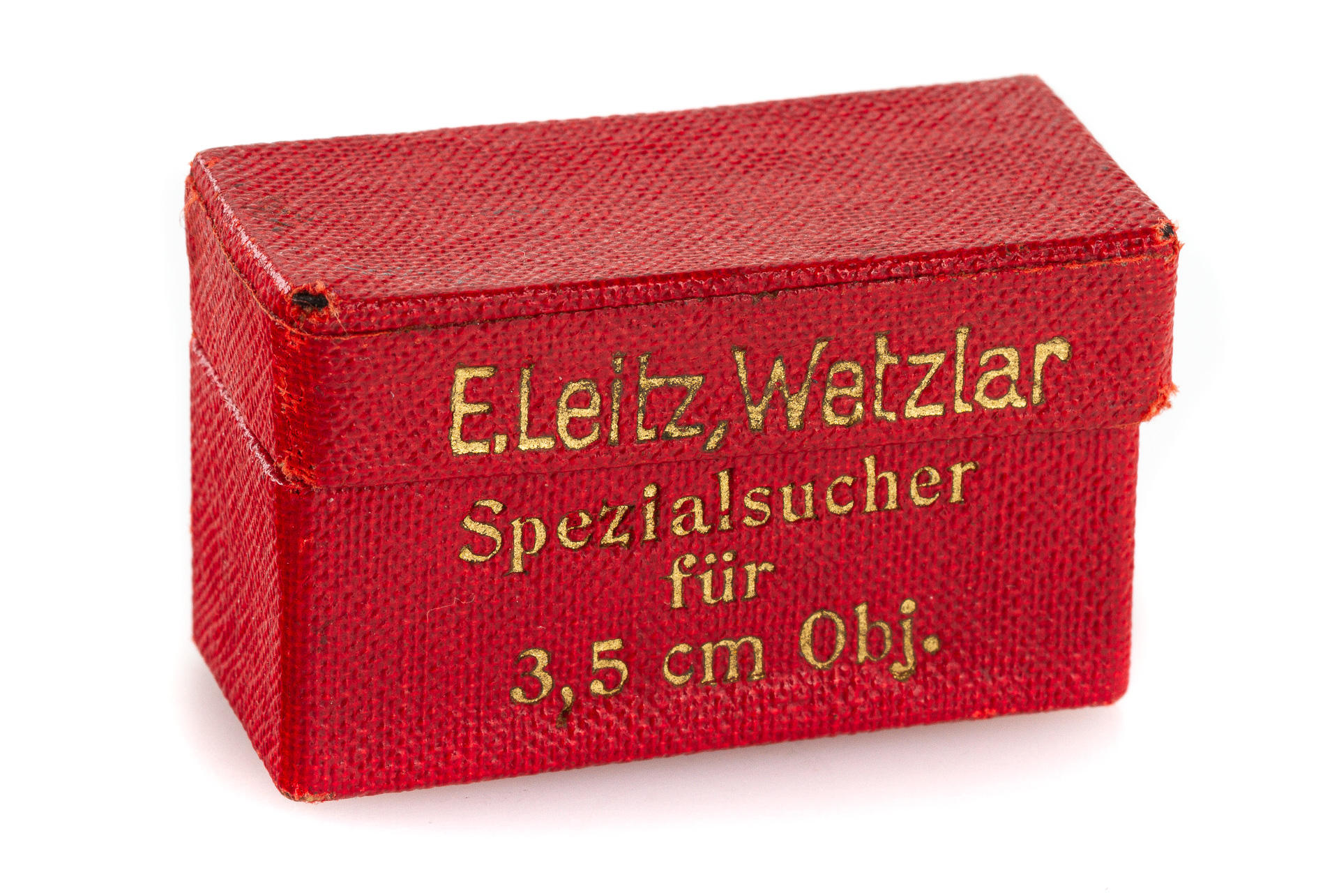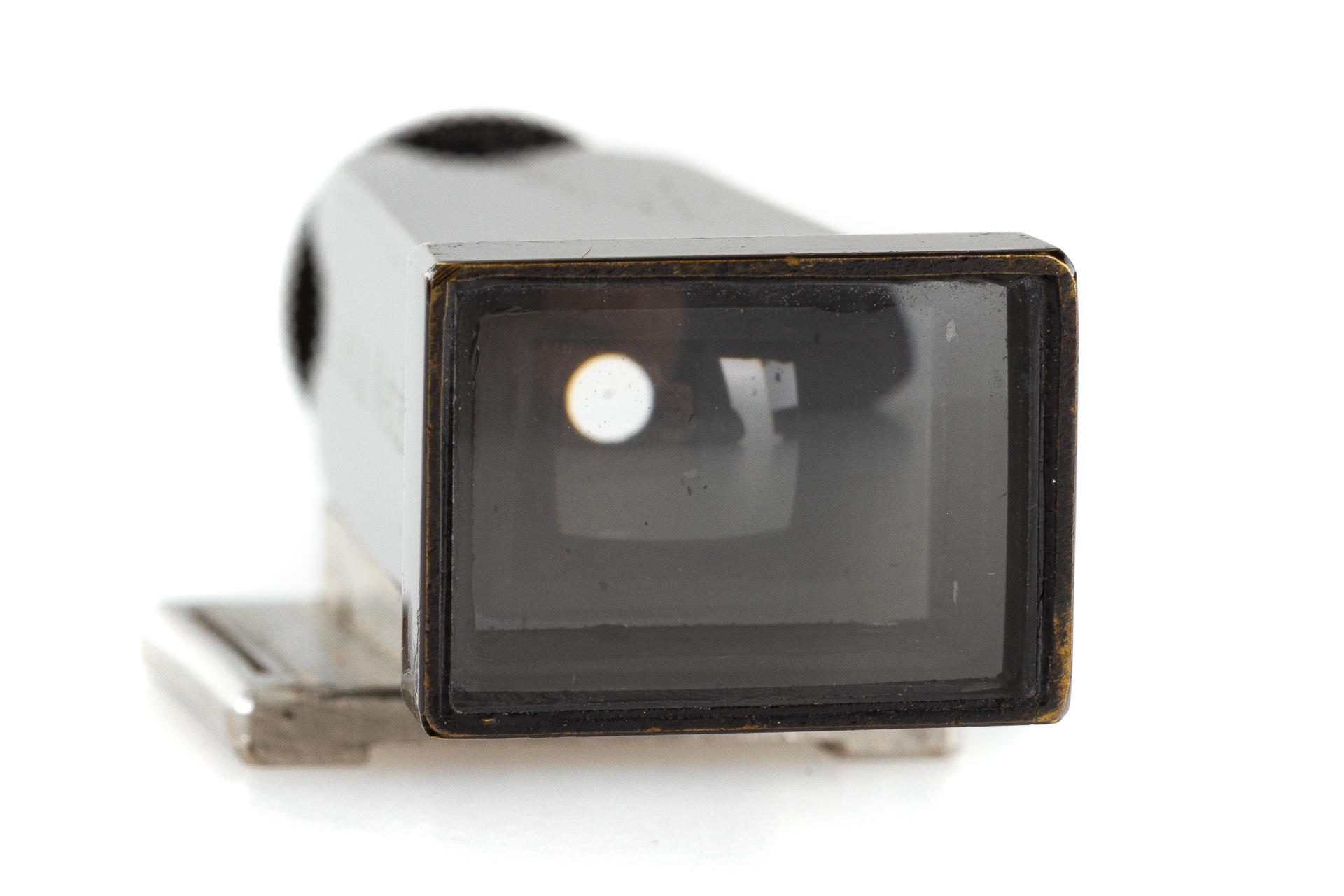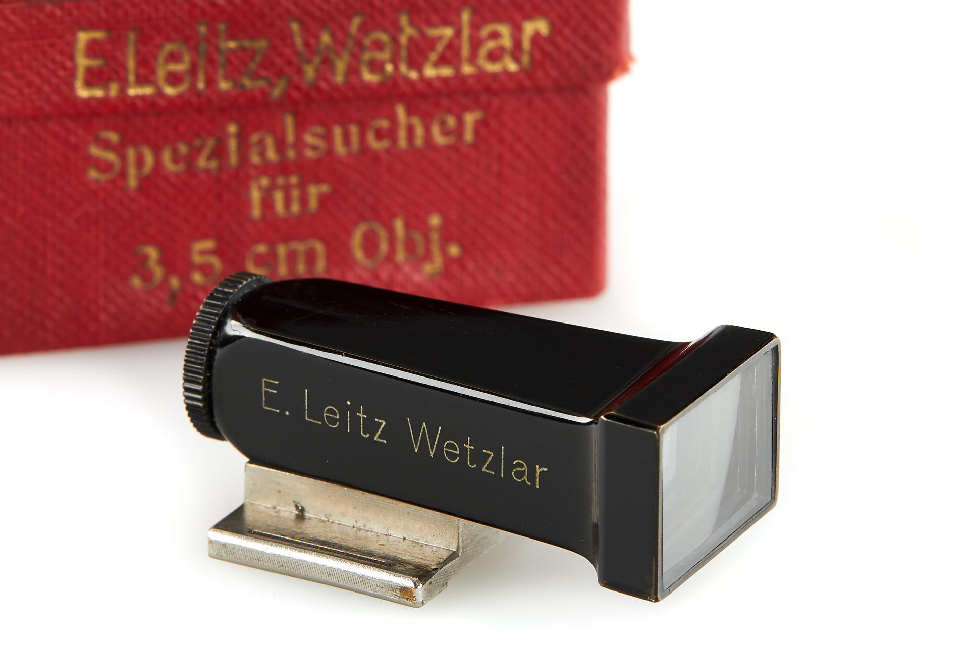 3.5cm finder, early type with a flared end, chrome foot, in beautiful condition, with maker's box