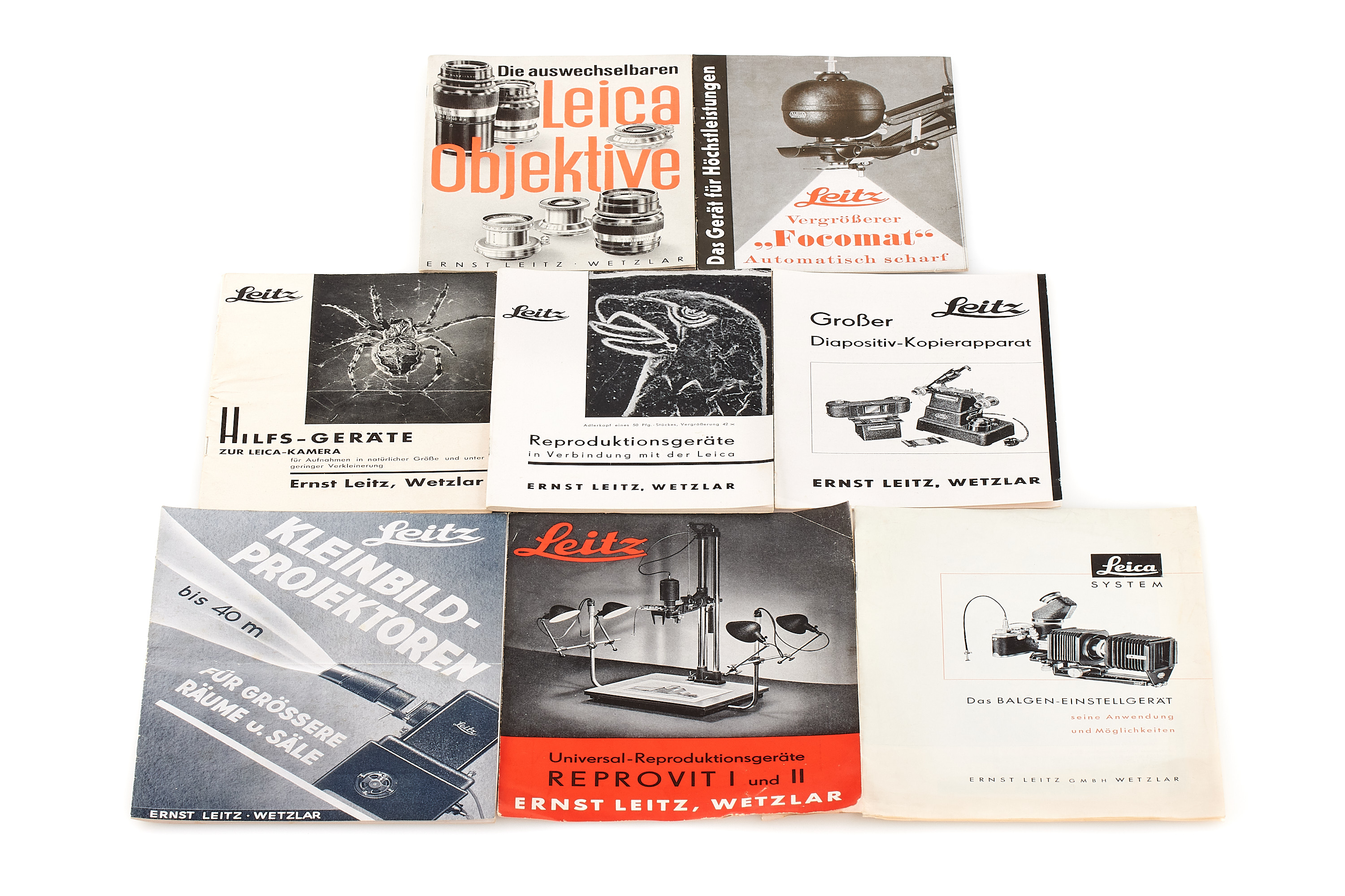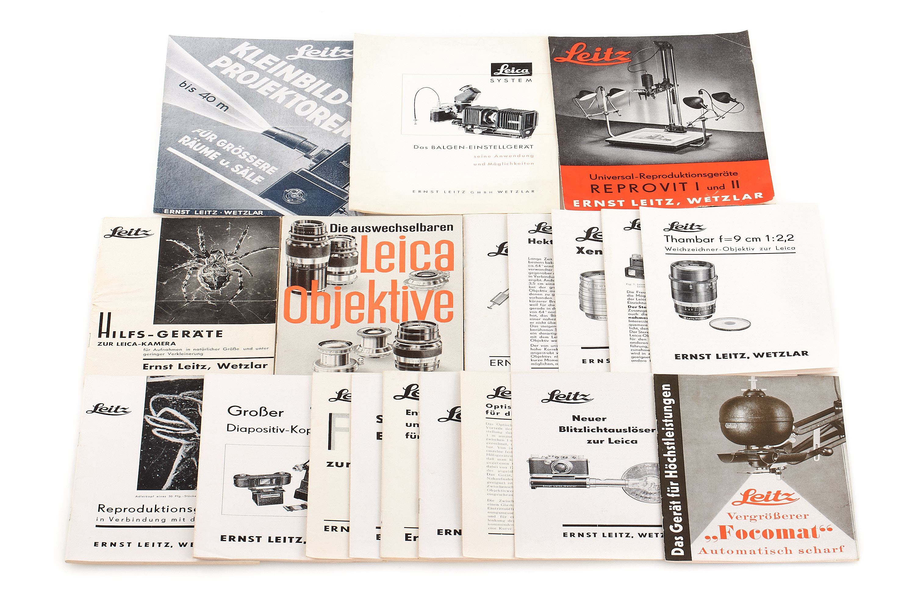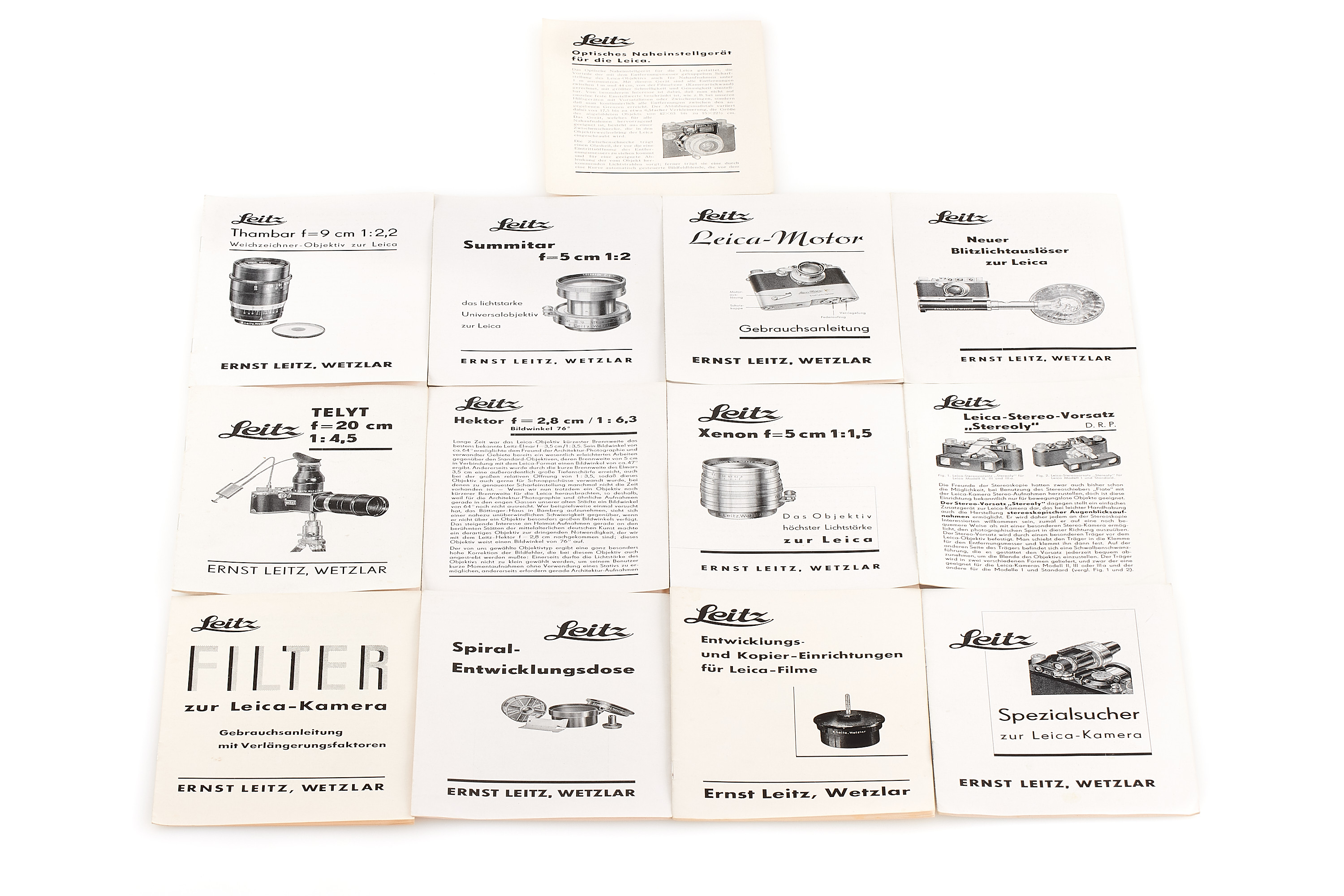Interesting set of 21 leaflets for Leica lenses and various accessories, all original from 1936 to 1953, in original mint condition, 13x18cm and 15x21cm.