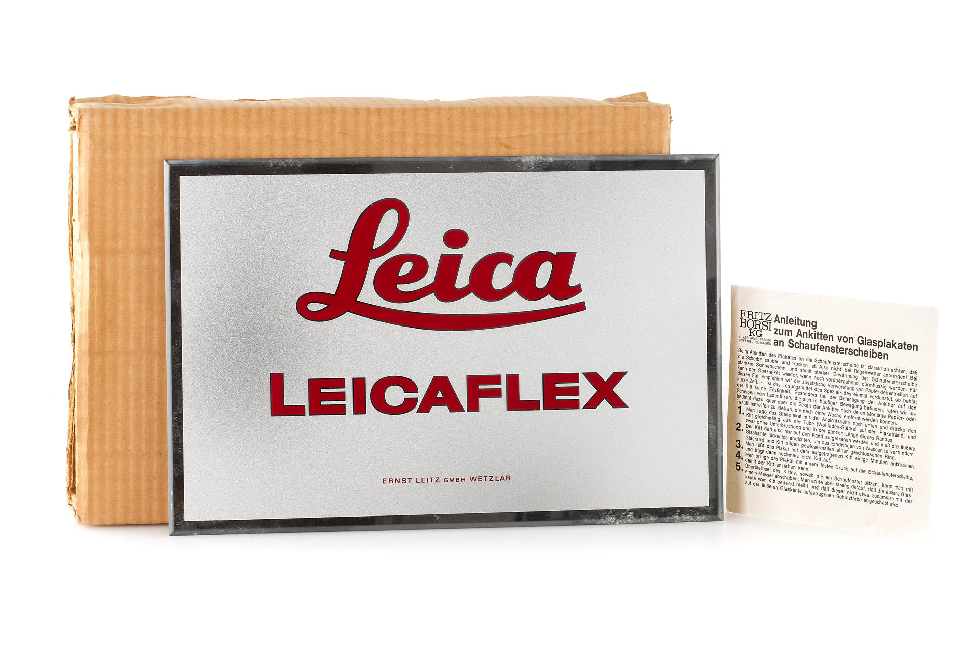 rare Leicaflex dealer display, printed glass 29 x 19cm in near mint condition, with German instruction (explaining how to properly glue it on the shop window), and original cardboard protection