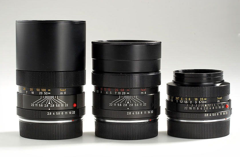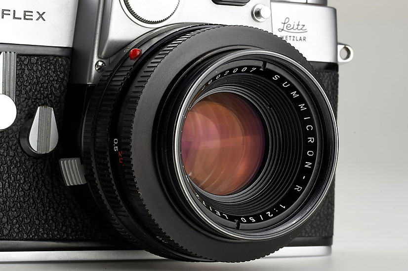 a fantastic set in near mint condition: Leicaflex Mark II body no.1172771, Elmarit-R 2.8/35mm no.2169100, Summicron-R 2/50mm no.2002007, Elmarit-R 2.8/90mm no.2013296, Elmarit-R 2.8/135mm no.2297698 - all lenses with hoods, caps - filter adapter 14160, 14161, Series 6 + 7 UVa filters, Elpro VIa, VIIa, VIb, VIIb - all in a very rare Leica salesman leather case with red velvet inlet