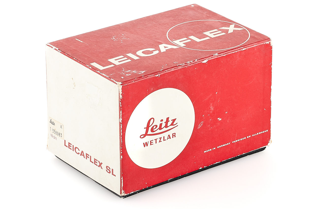 Nice original black paint version in good condition and working order, with signs of use, red plastic lens release button, note the 'Leicaflex' engravement intentionally blackened, with body cap and maker's box (with another serial number).