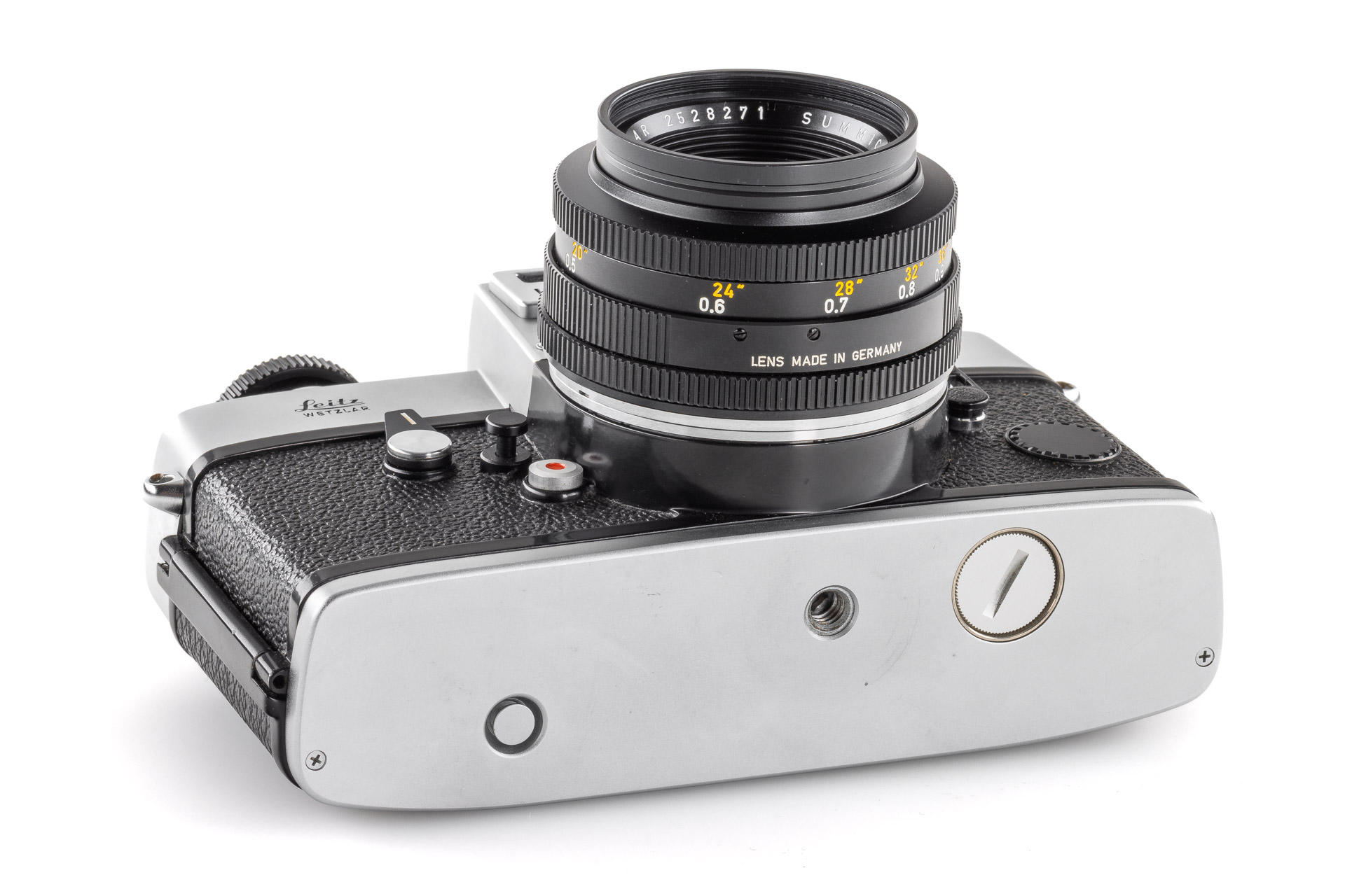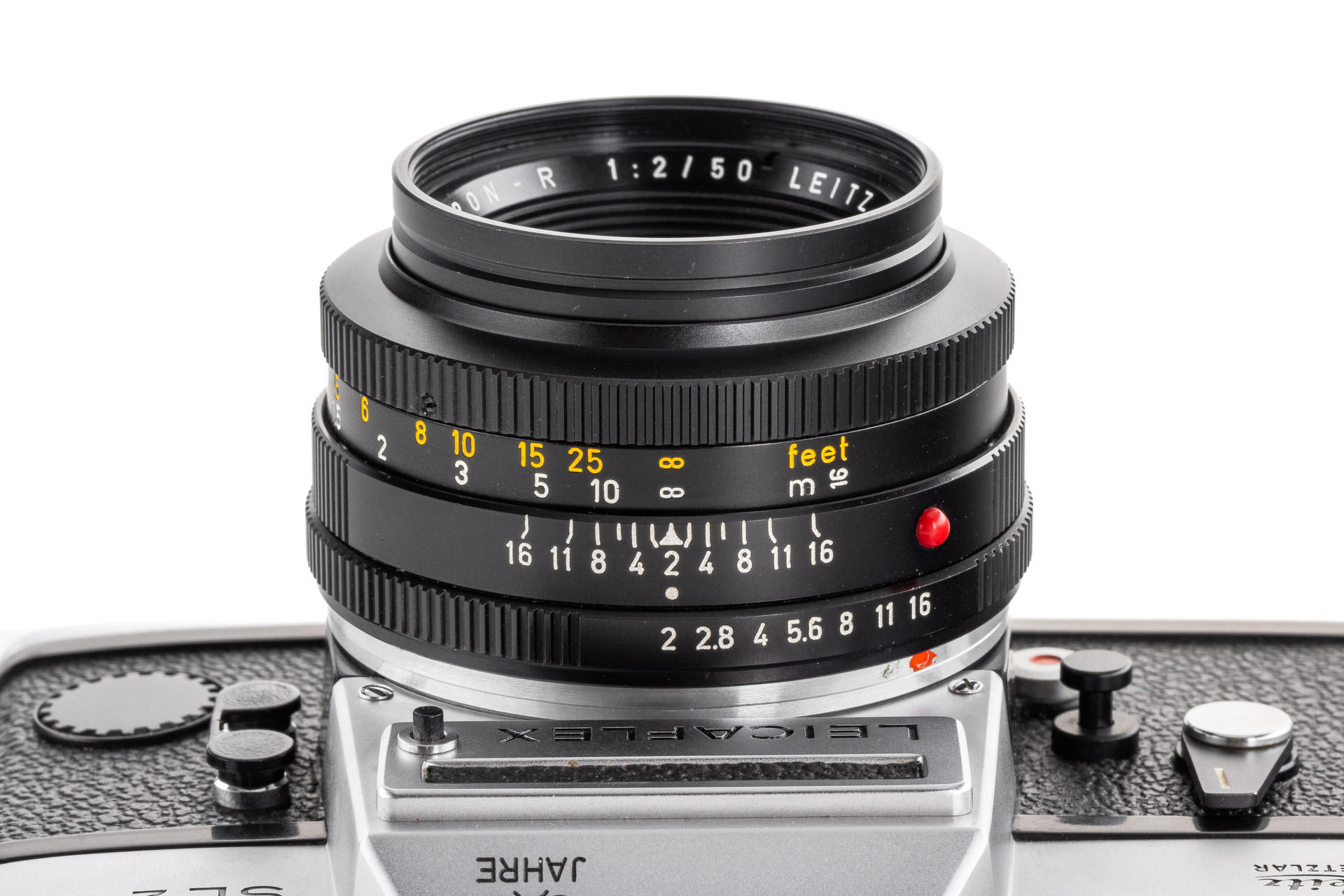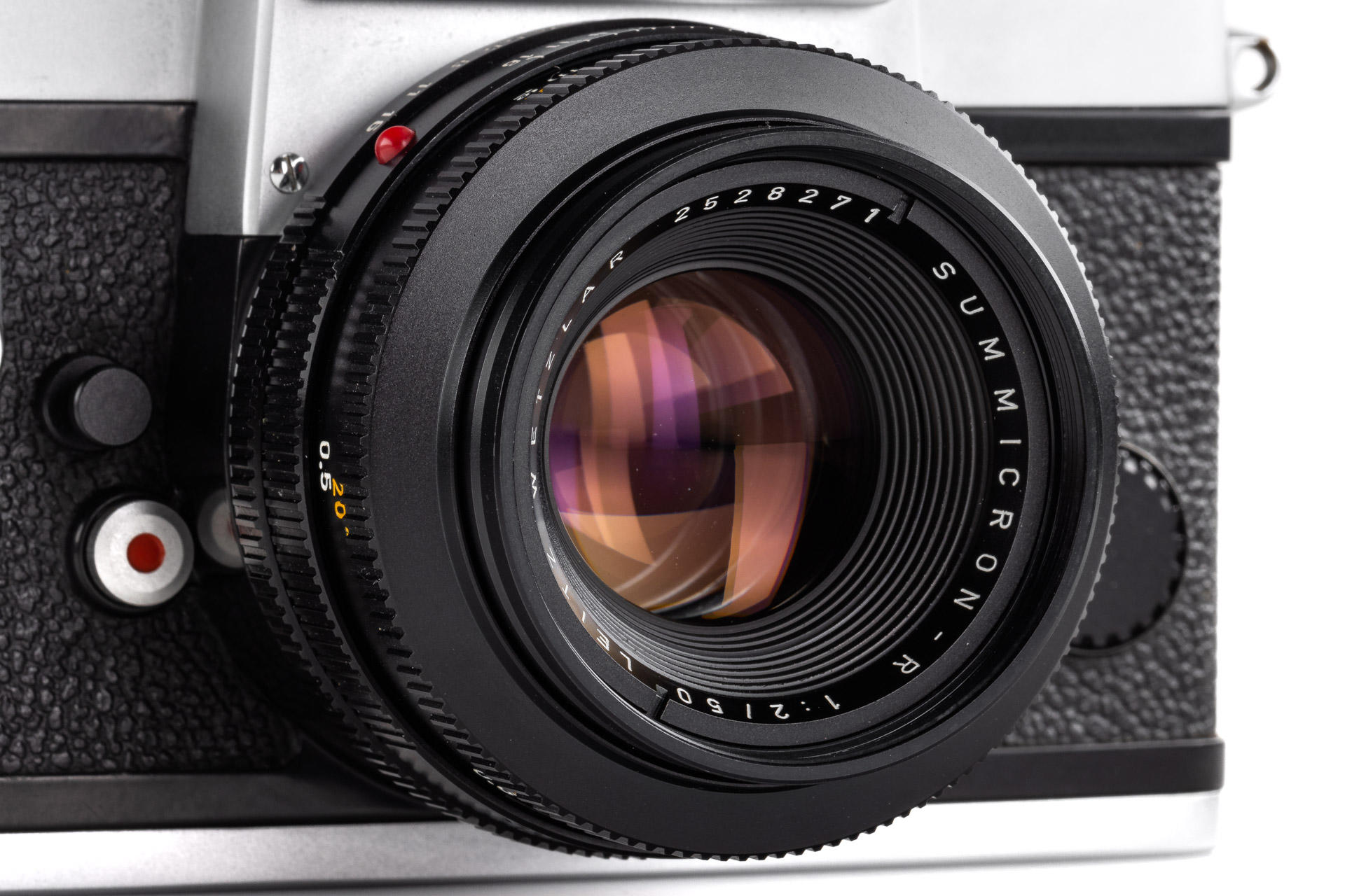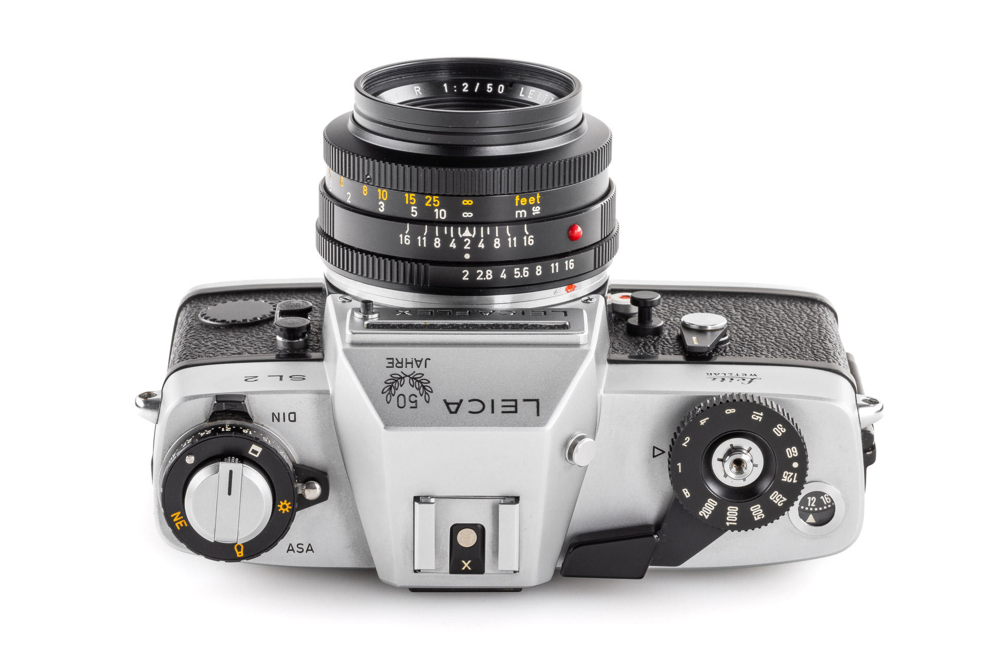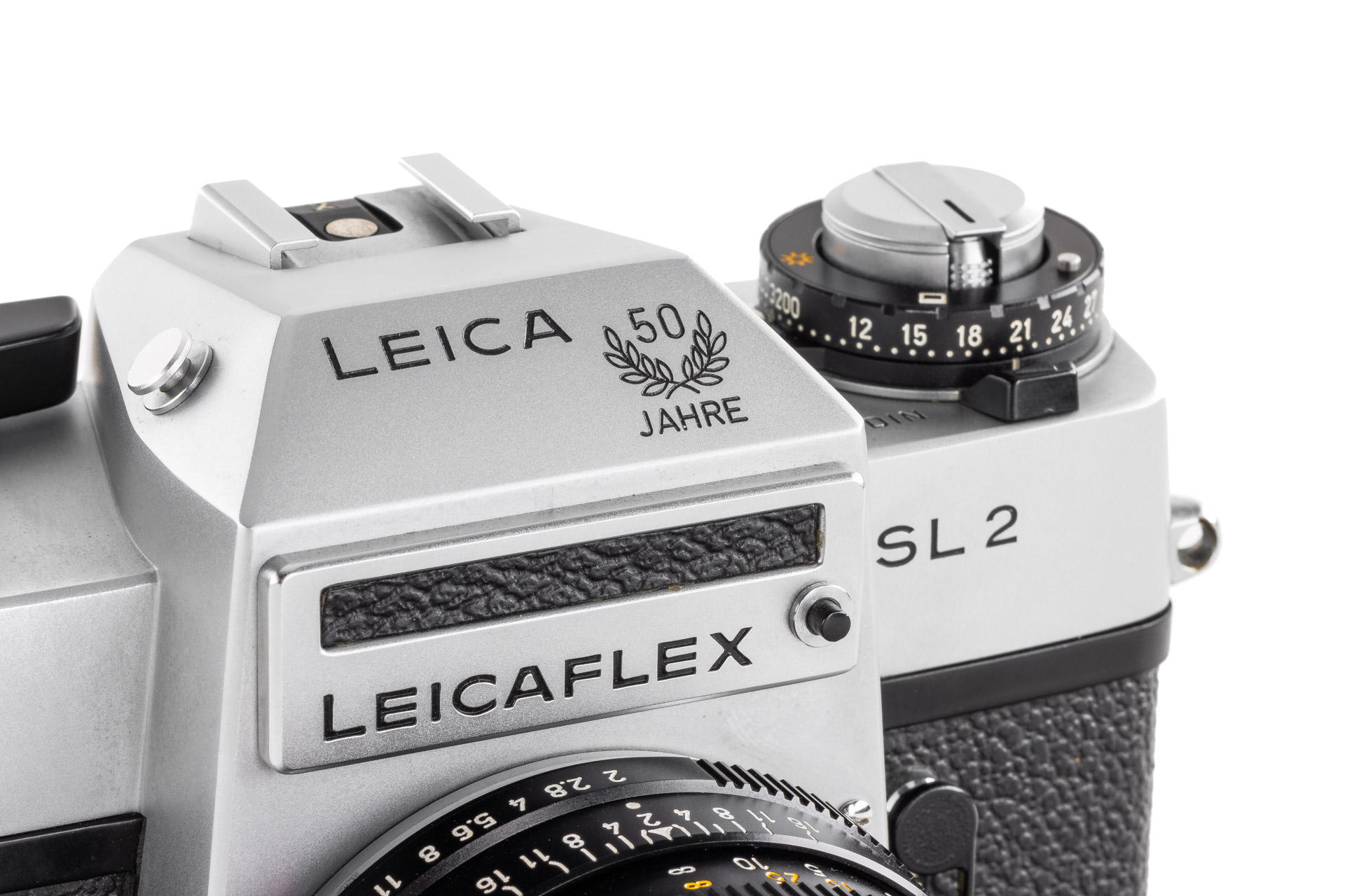 Limited edition SL2 issued for the 50th anniversary of Leica, in mint condition, body number 1418469, with clean 2-cam Summicron-R 2/50mm no.2528271 with hood 12564, front lens cap and filter holder