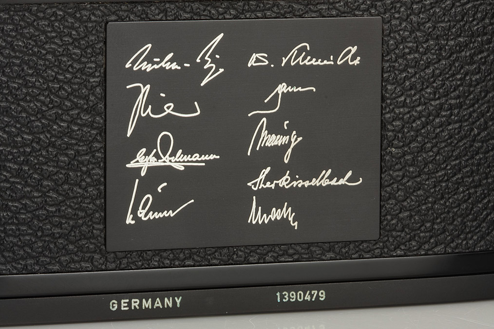 Leitz presentation camera for Friedrich von Rosen, the rear with a special fixed plate engraved with signatures of important Leitz employees (Dr.Knut Kühn-Leitz, Theo Kisselbach, Erich Glier, Fritz Fink, Walter Schmidt, Woldemar Masing, Walter Krämer) in special red leather presentation box