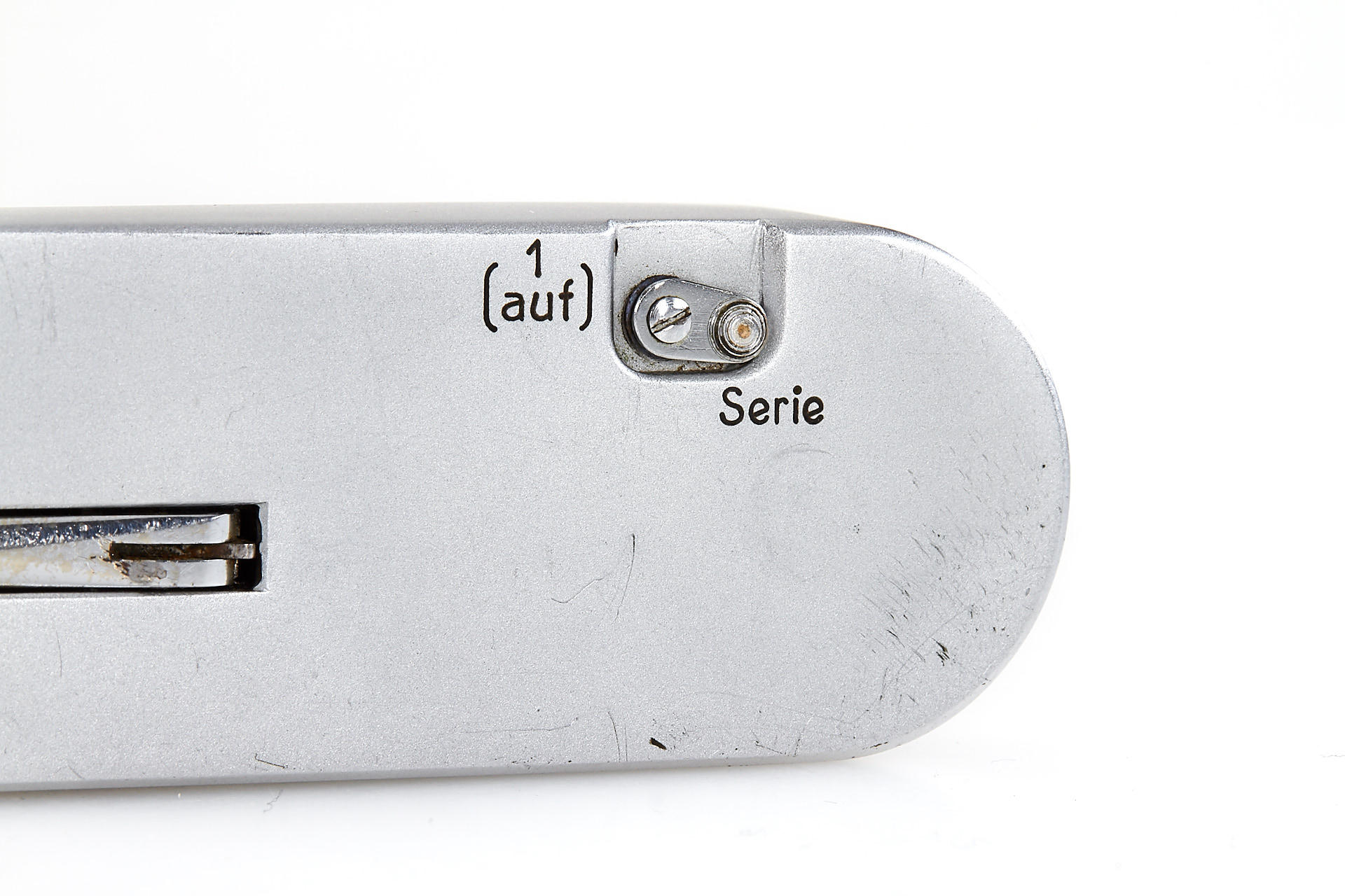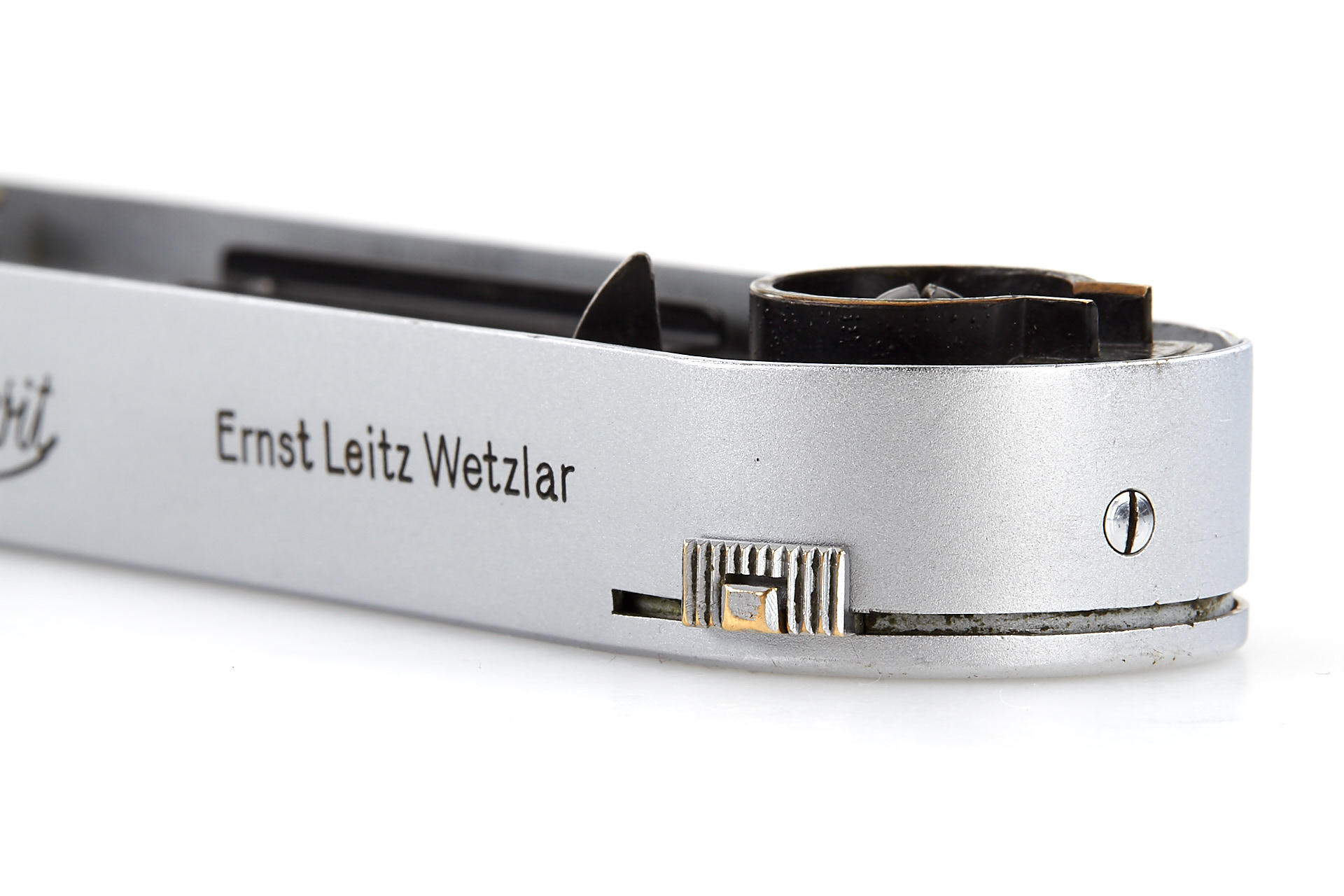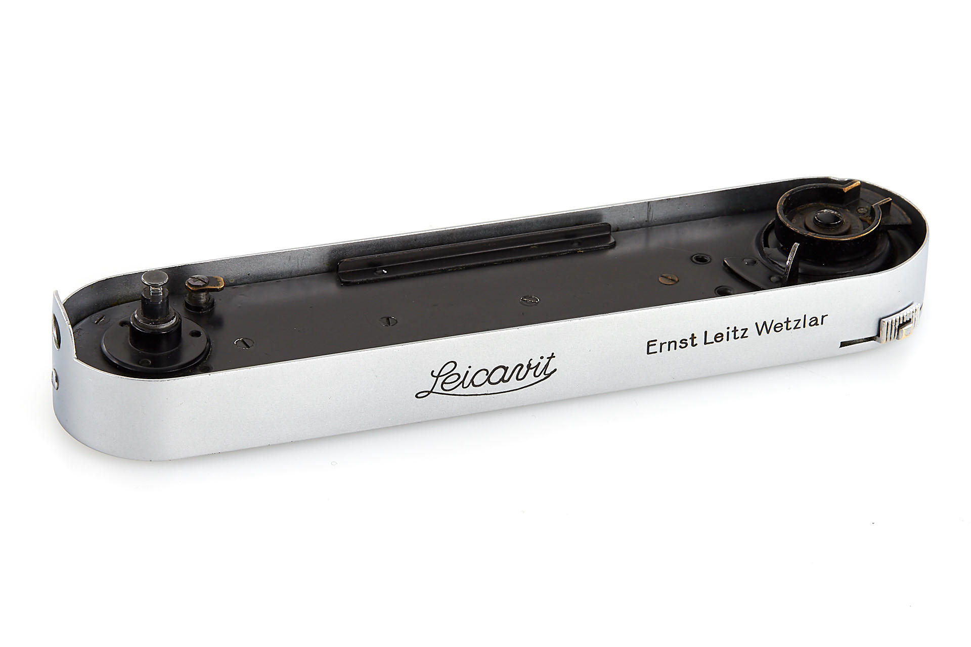 The Leicavit baseplate rapid winder was developed during the early 1950s. The example offered is a prototype, showing several differences to the pre-series models released for the press in 1951: shooting mode switch engraved '1(auf)/Serie' instead of the usual 'Einzel(auf)/Serie', base plate removal lever equipped with releasing knob (a feature unseen on any other base plate accessories), different engraving style on the front etc., it is in very good condition and working order, an unique opportunity for every Leica collector!