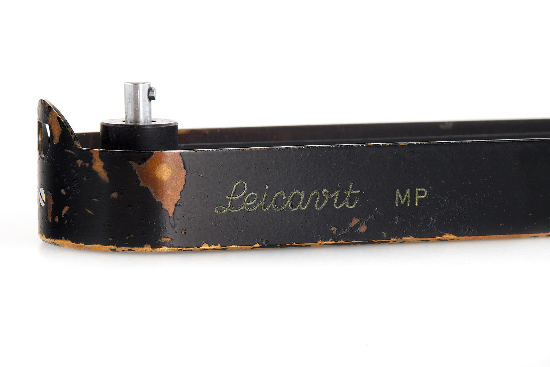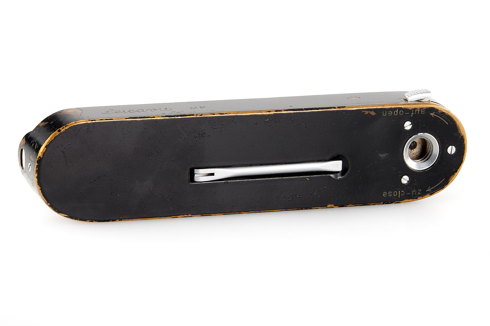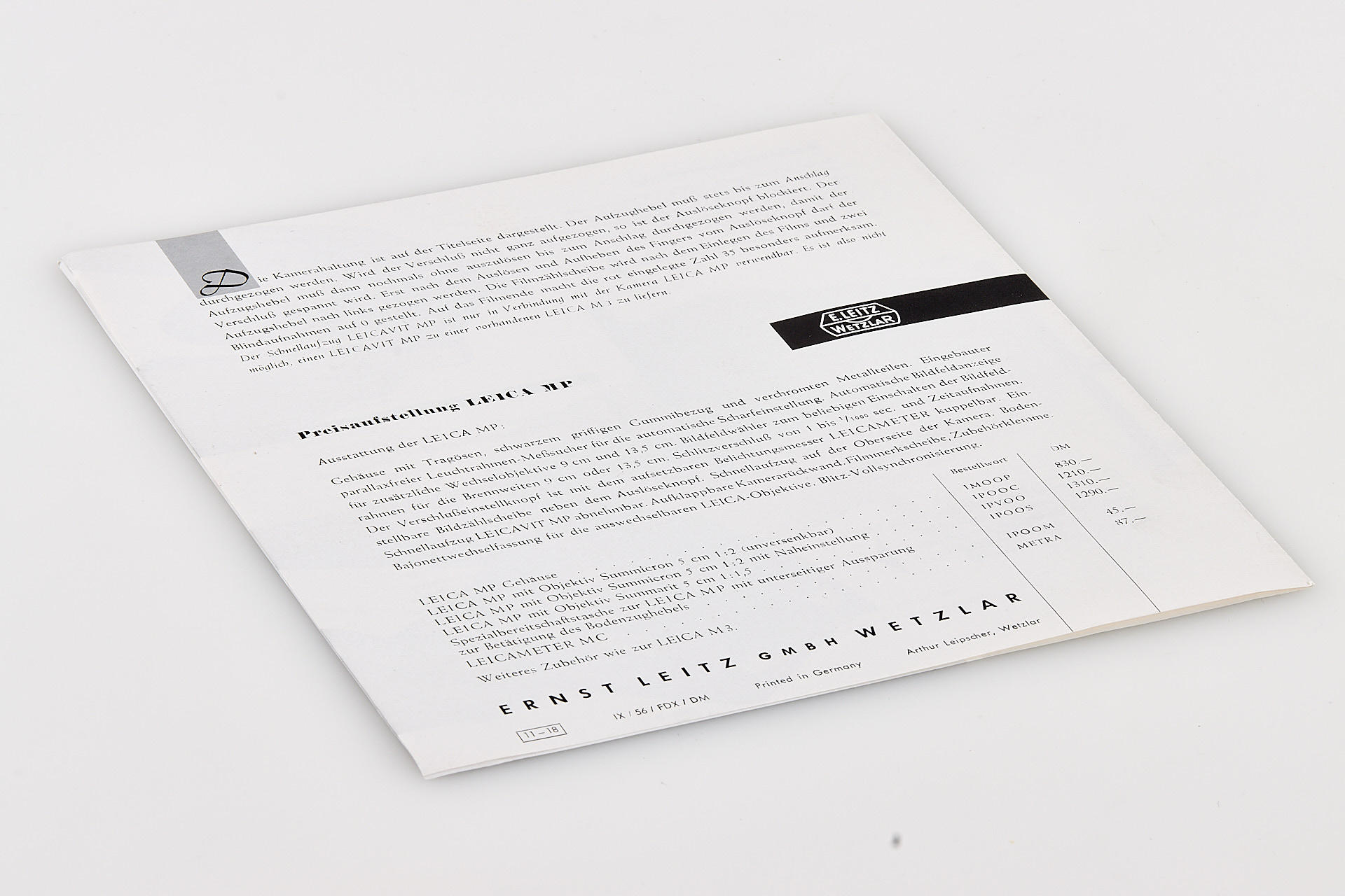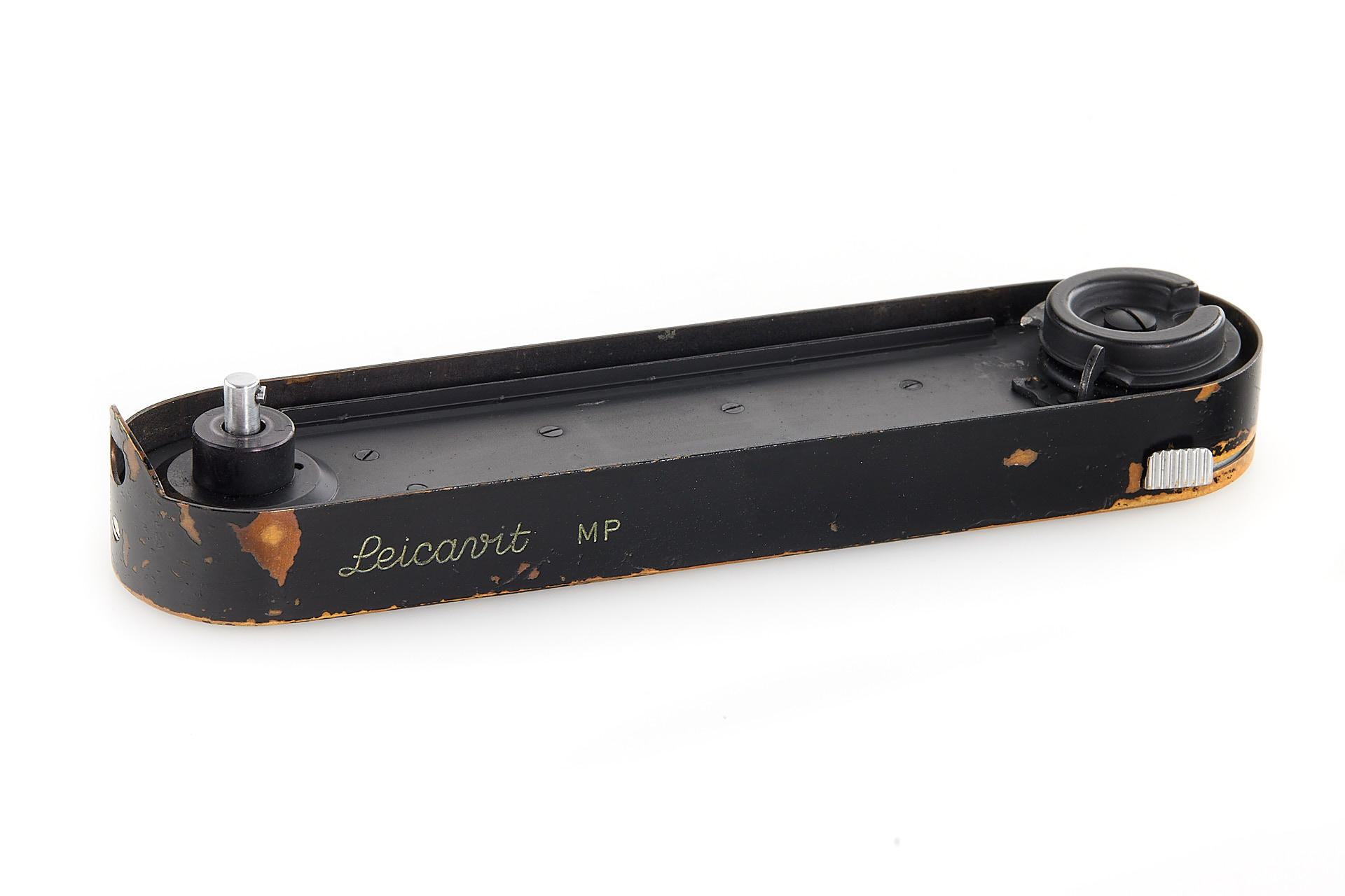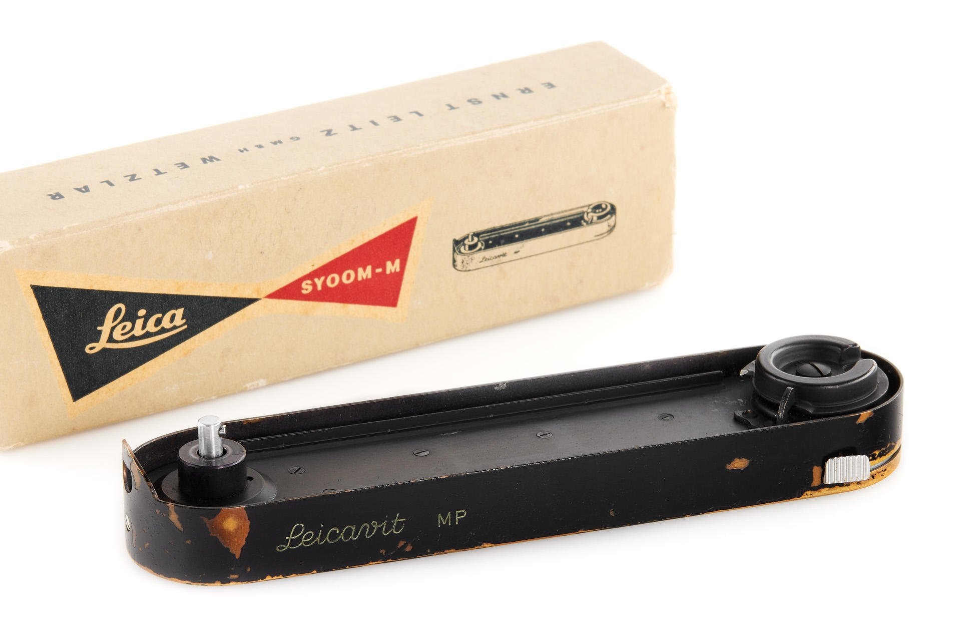 sought-after, the first version Leicavit MP in the black paint finish, in good working condition with a beautiful patina of use and small bubbles appearing in paint, with maker's box and including a German Leica MP brochure from 1956, a perfect opportunity for someone looking to complete a black paint MP or M2 outfit