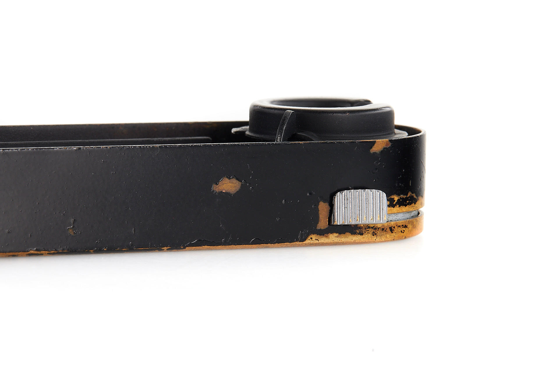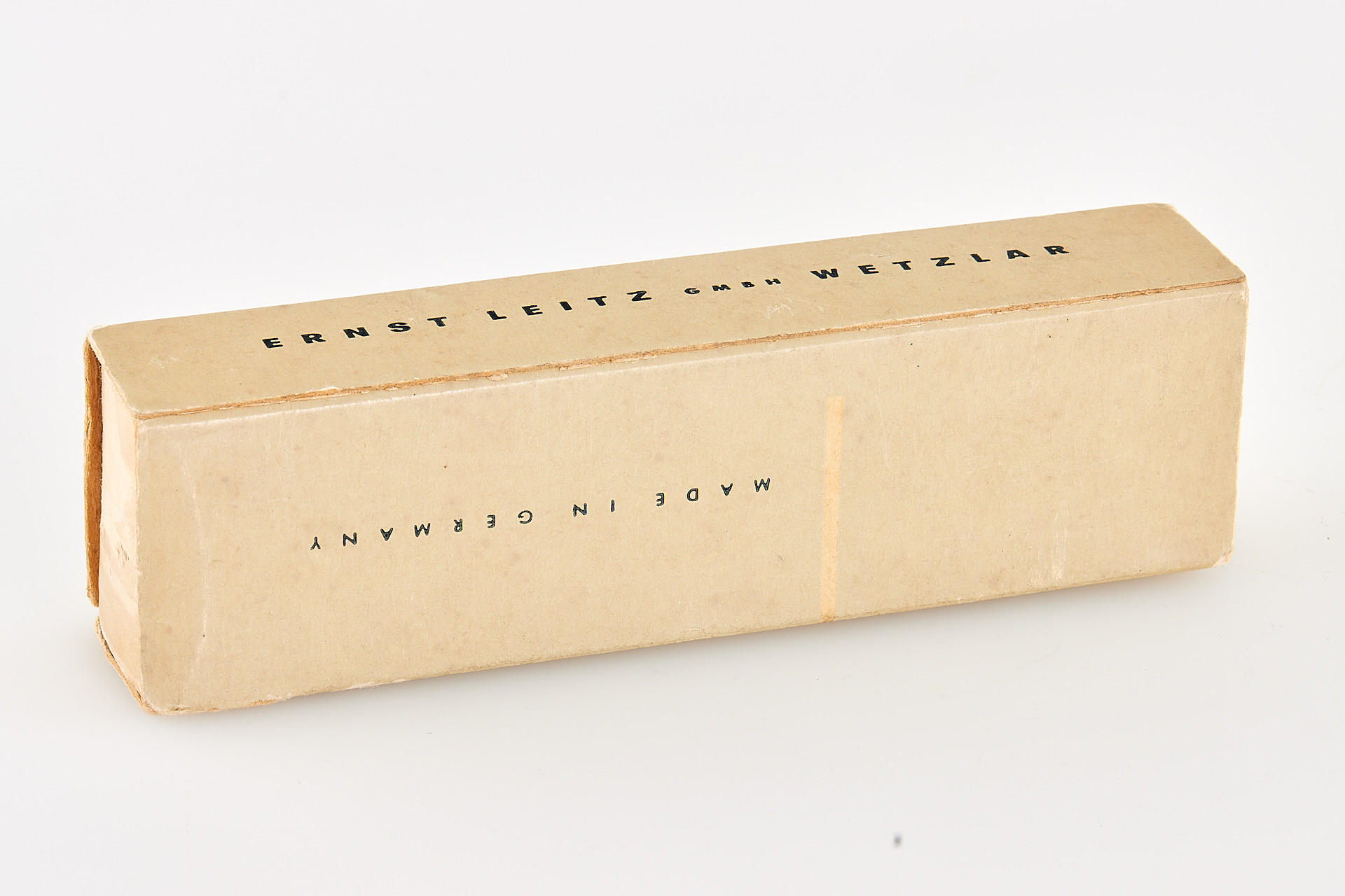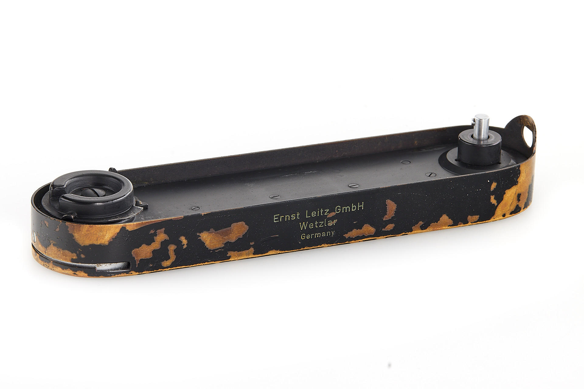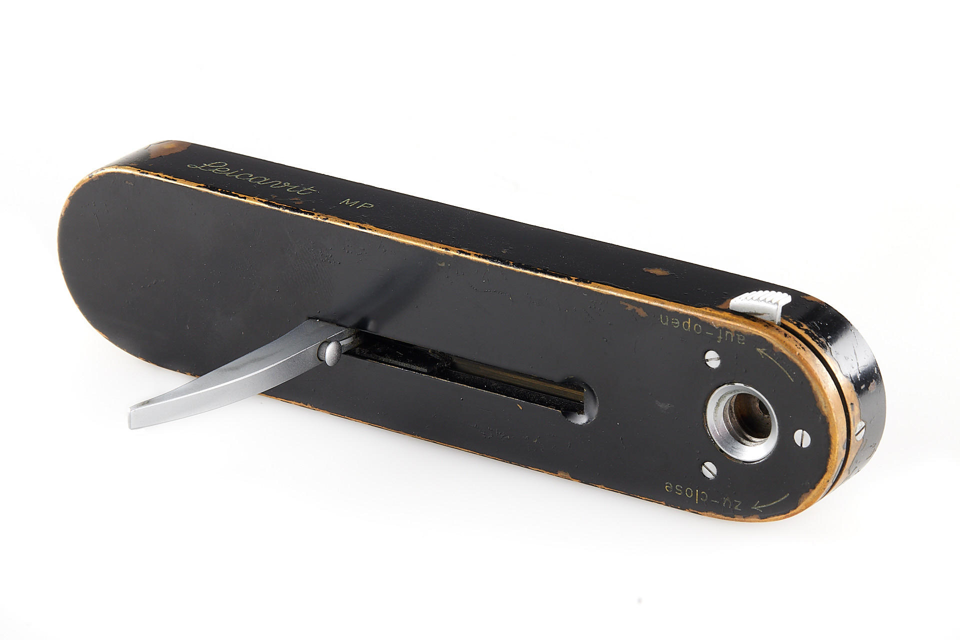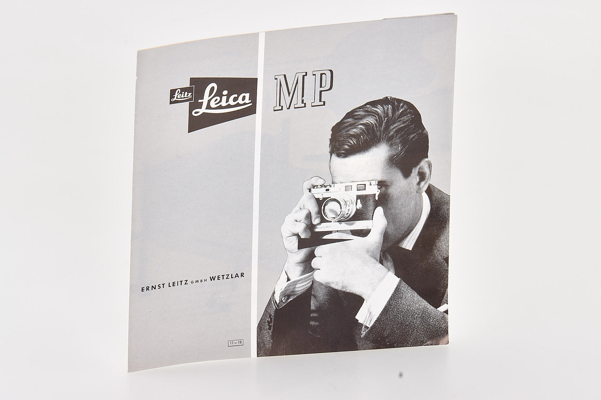 sought-after, the first version Leicavit MP in the black paint finish, in good working condition with a beautiful patina of use and small bubbles appearing in paint, with maker's box and including a German Leica MP brochure from 1956, a perfect opportunity for someone looking to complete a black paint MP or M2 outfit
